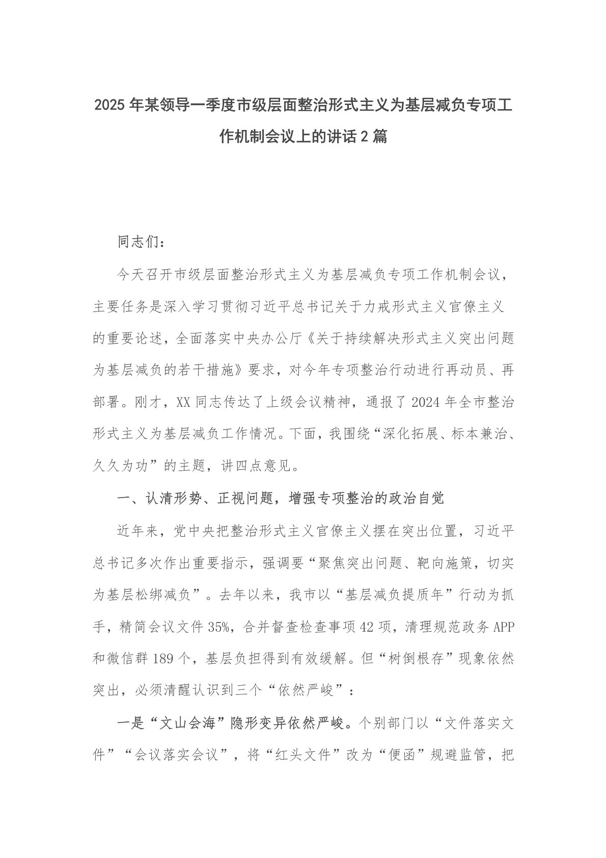 2025年某领导一季度市级层面整治形式主义为基层减负专项工作机制会议上的讲话2篇同志们:今天召开市级层面整治形式主义为基层减负专项工作机制会议,主要任务是深入学习贯彻习近平总书记关于力戒形式主义官僚主义的重要论述,全面落实中央办公厅《关于持续解决形式主义突出问题为基层减负的若干措施》要求,对今年专项整治行动进行再动员、再部署。刚才,XX同志传达了上级会议精神,通报了2024年全市整治形式主义为基层减负工作情况。下面,我围绕“深化拓展、标本兼治、久久为功”的主题,讲四点意见。一、认清形势、正视问题,增强专项整治的政治自觉近年来,党中央把整治形式主义官僚主义摆在突出位置,习近平总书记多次作出重要指...