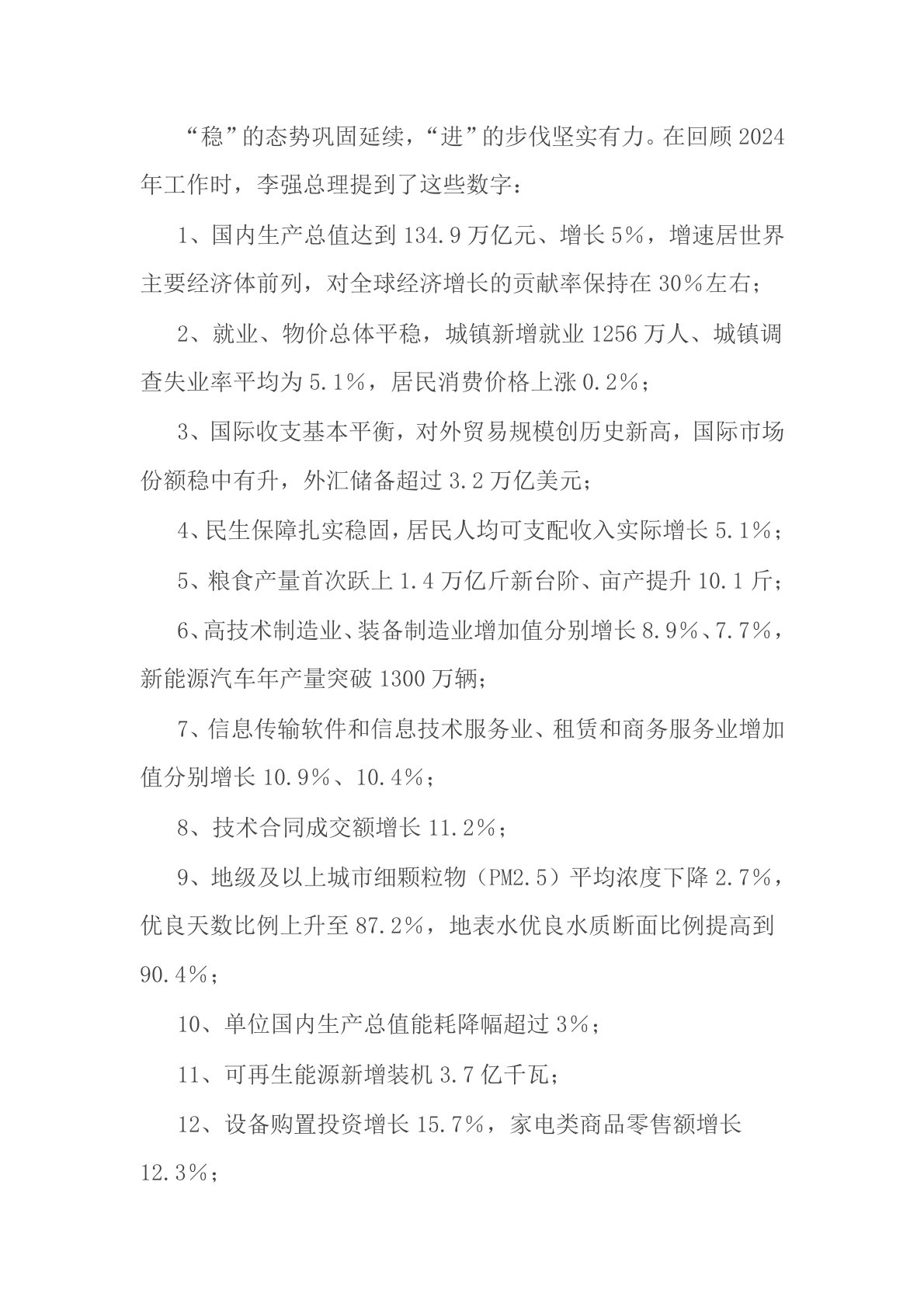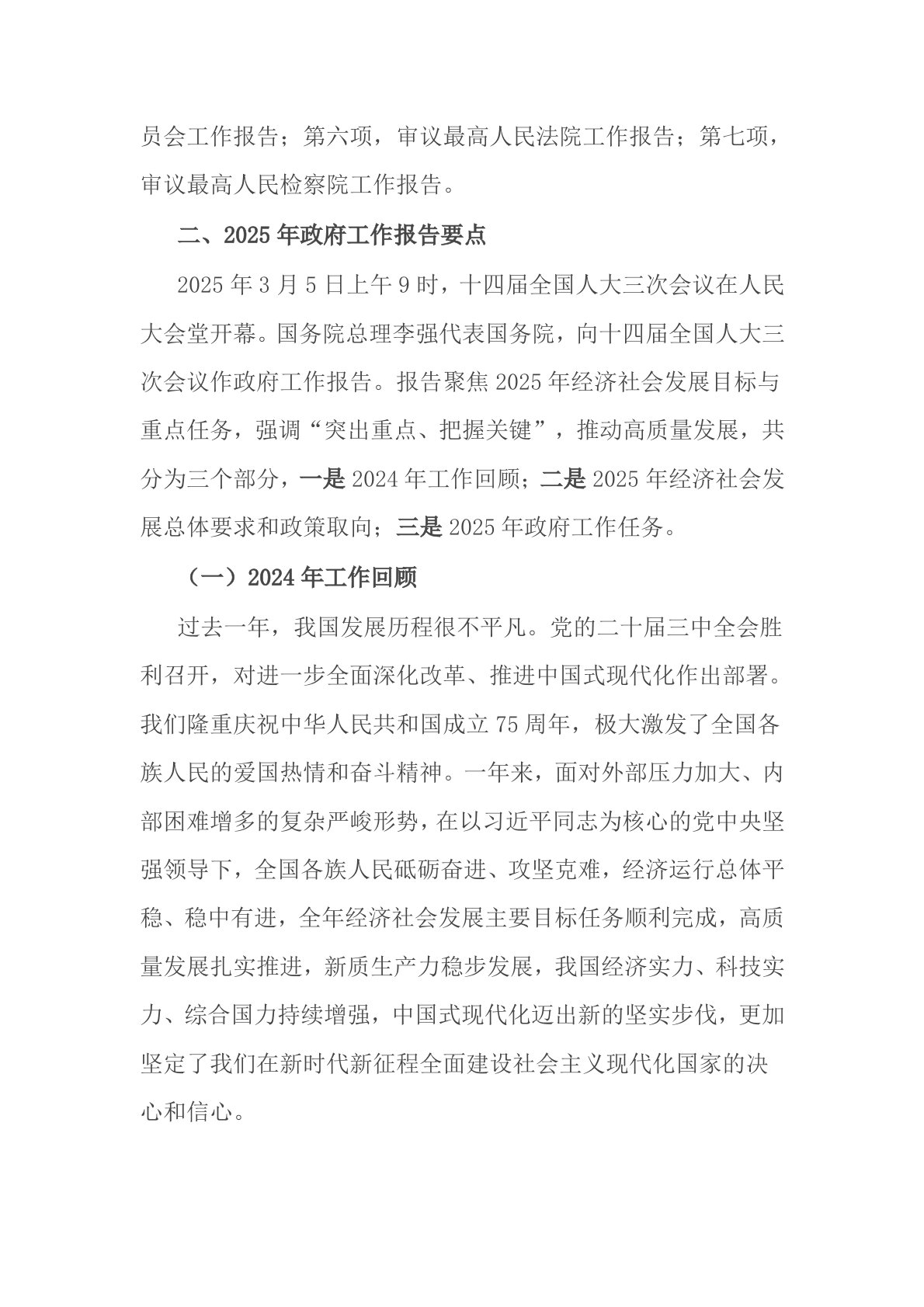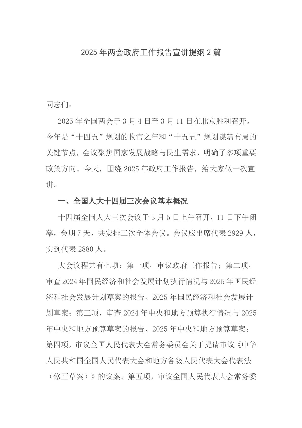 2025年两会政府工作报告宣讲提纲2篇同志们:2025年全国两会于3月4日至3月11日在北京胜利召开。今年是“十四五”规划的收官之年和“十五五”规划谋篇布局的关键节点,会议聚焦国家发展战略与民生需求,明确了多项重要政策方向。今天,围绕2025年政府工作报告,给大家做一次宣讲。一、全国人大十四届三次会议基本概况十四届全国人大三次会议于3月5日上午召开,11日下午闭幕,会期7天,共安排三次全体会议。会议应出席代表2929人,实到代表2880人。大会议程共有七项:第一项,审议政府工作报告;第二项,审查2024年国民经济和社会发展计划执行情况与2025年国民经济和社会发展计划草案的报告、2025年国民...