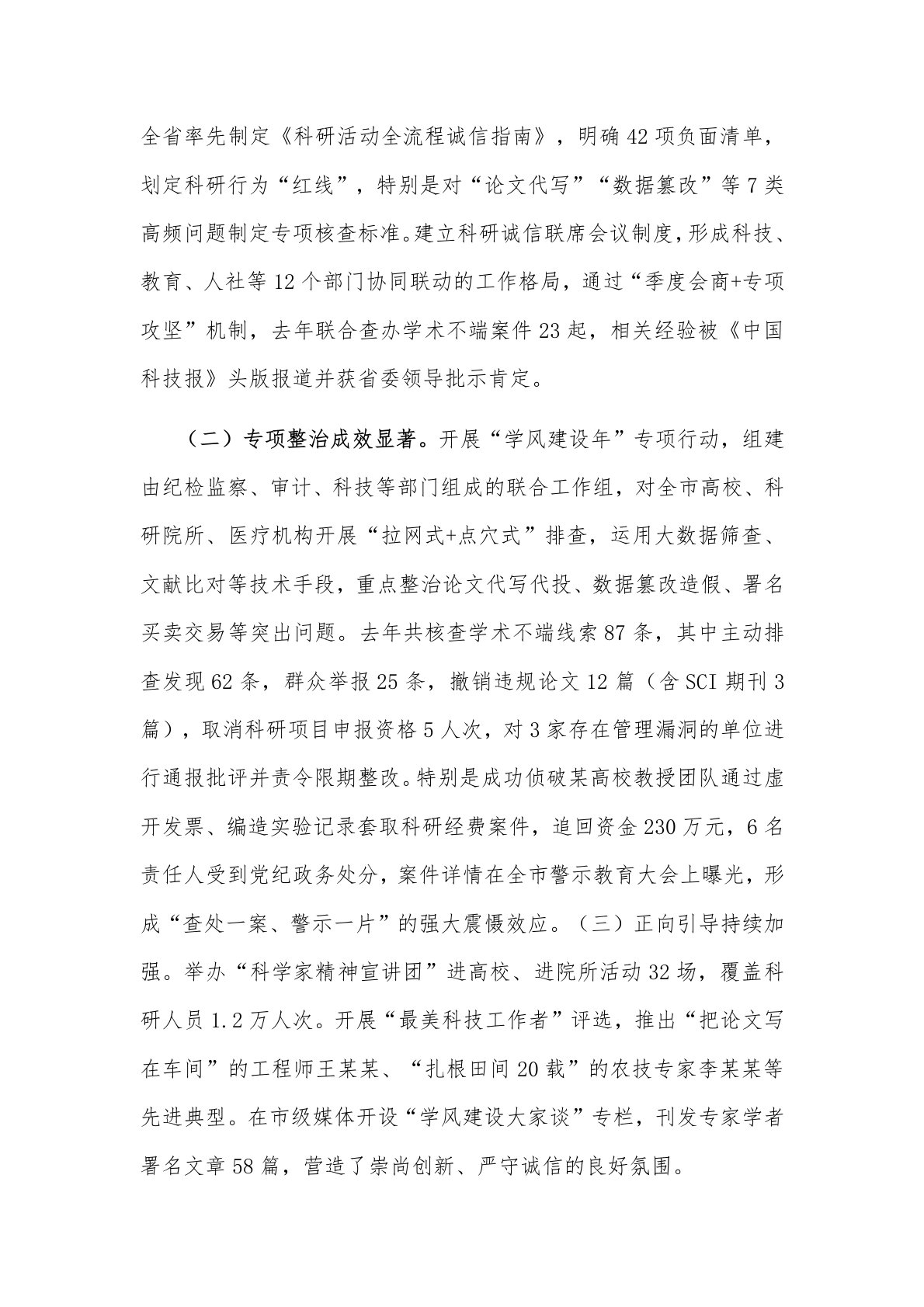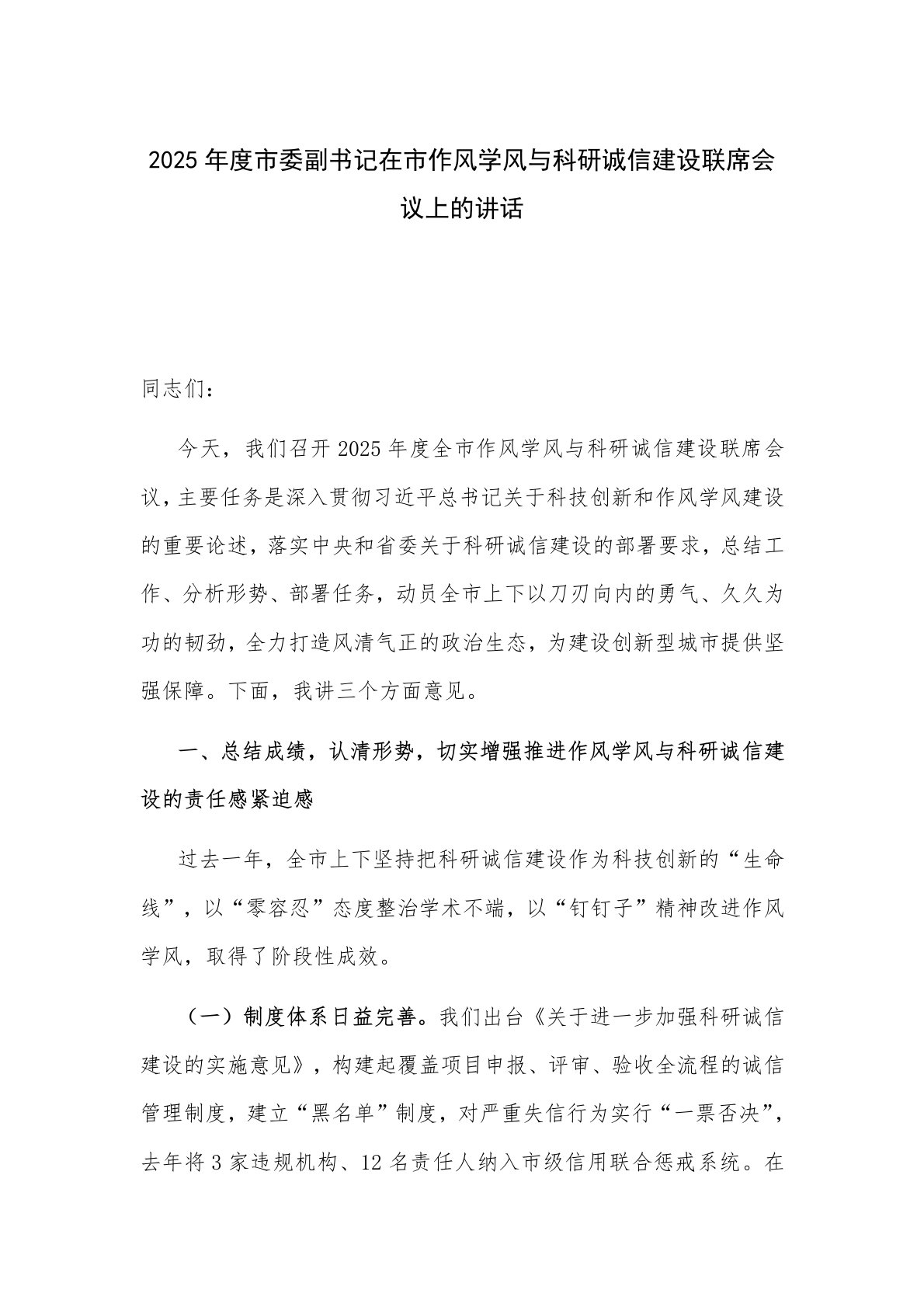 2025年度市委副书记在市作风学风与科研诚信建设联席会议上的讲话同志们:今天,我们召开2025年度全市作风学风与科研诚信建设联席会议,主要任务是深入贯彻习近平总书记关于科技创新和作风学风建设的重要论述,落实中央和省委关于科研诚信建设的部署要求,总结工作、分析形势、部署任务,动员全市上下以刀刃向内的勇气、久久为功的韧劲,全力打造风清气正的政治生态,为建设创新型城市提供坚强保障。下面,我讲三个方面意见。一、总结成绩,认清形势,切实增强推进作风学风与科研诚信建设的责任感紧迫感过去一年,全市上下坚持把科研诚信建设作为科技创新的“生命线”,以“零容忍”态度整治学术不端,以“钉钉子”精神改进作风学风,取得...