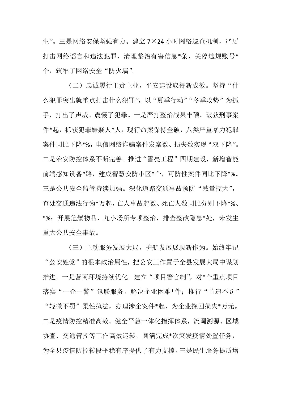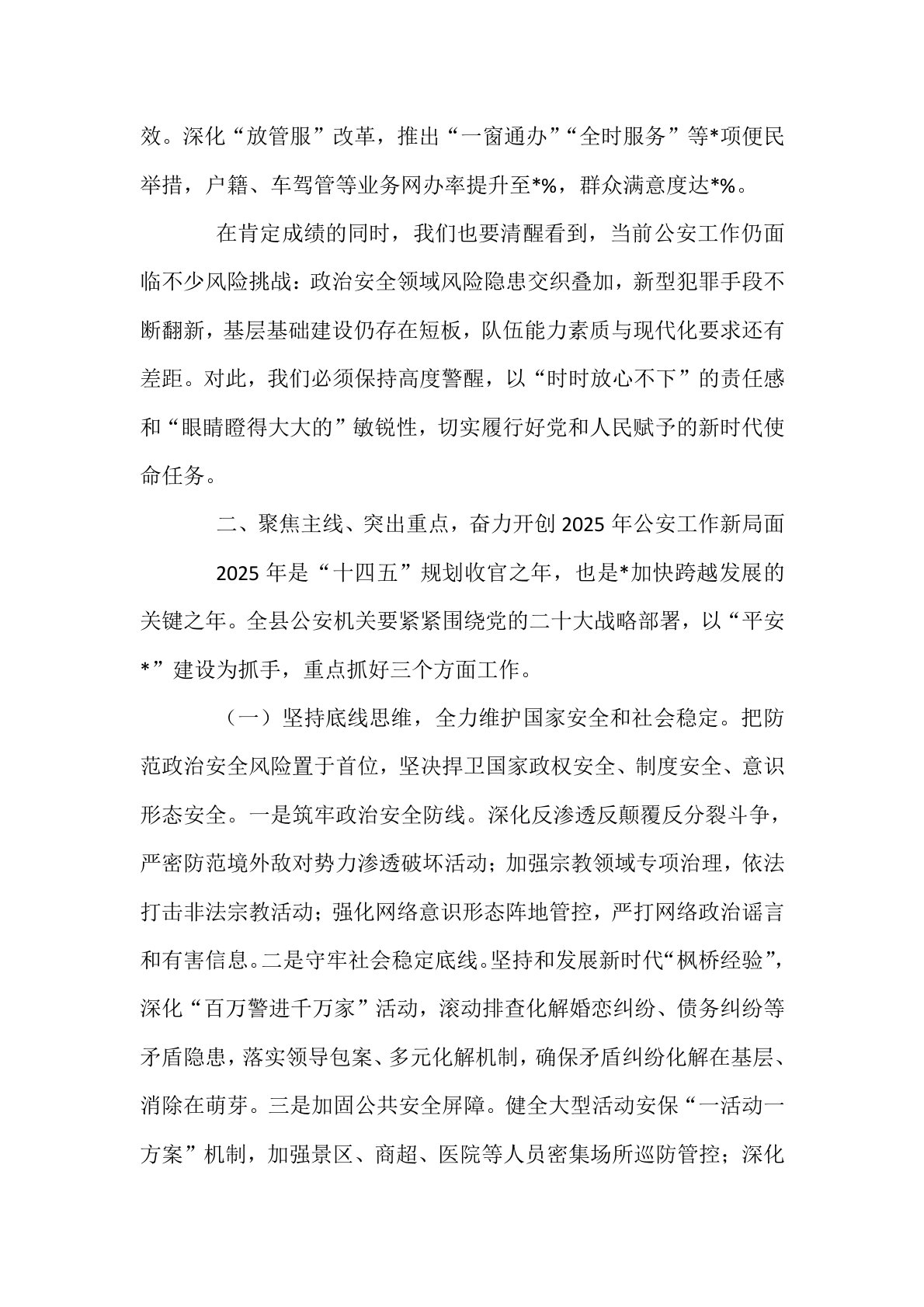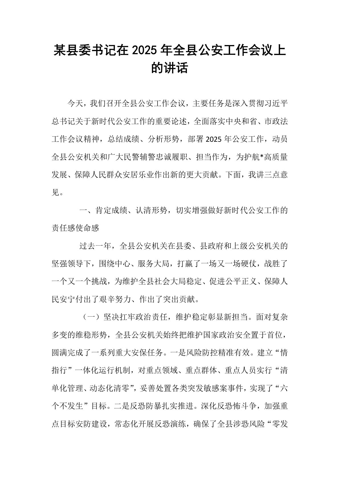 某县委书记在2025年全县公安工作会议上的讲话今天,我们召开全县公安工作会议,主要任务是深入贯彻习近平总书记关于新时代公安工作的重要论述,全面落实中央和省、市政法工作会议精神,总结成绩、分析形势,部署2025年公安工作,动员全县公安机关和广大民警辅警忠诚履职、担当作为,为护航*高质量发展、保障人民群众安居乐业作出新的更大贡献。下面,我讲三点意见。一、肯定成绩、认清形势,切实增强做好新时代公安工作的责任感使命感过去一年,全县公安机关在县委、县政府和上级公安机关的坚强领导下,围绕中心、服务大局,打赢了一场又一场硬仗,战胜了一个又一个挑战,为维护全县社会大局稳定、促进公平正义、保障人民安宁付出了艰辛...