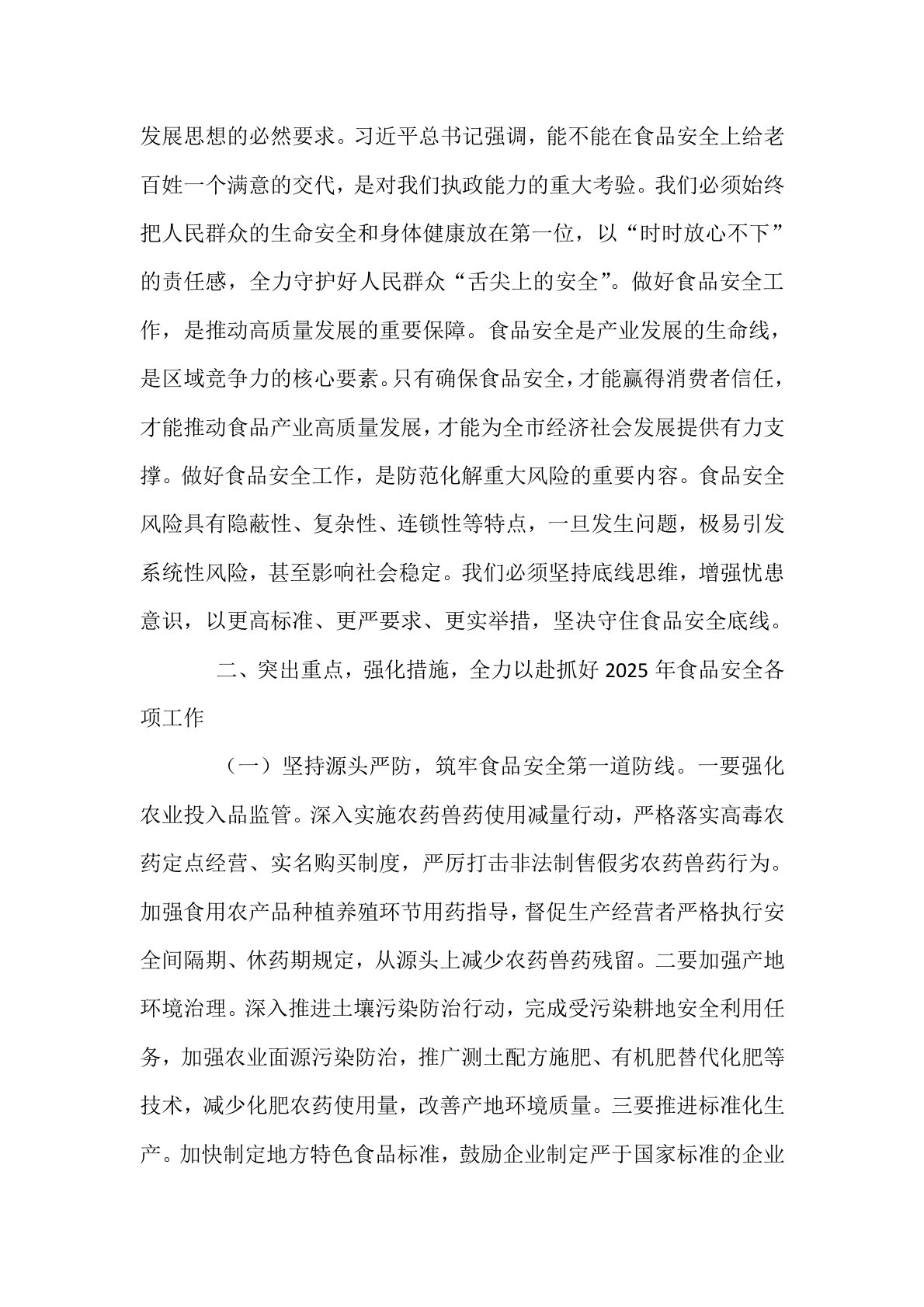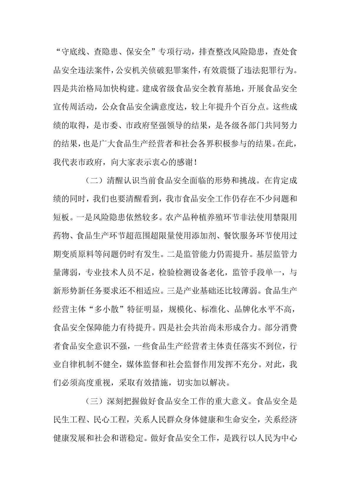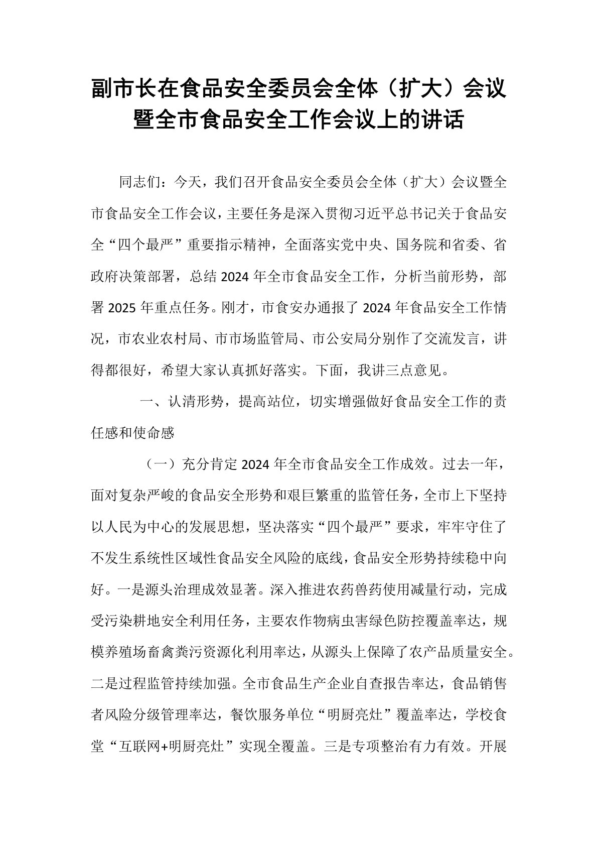 副市长在食品安全委员会全体(扩大)会议暨全市食品安全工作会议上的讲话同志们:今天,我们召开食品安全委员会全体(扩大)会议暨全市食品安全工作会议,主要任务是深入贯彻习近平总书记关于食品安全“四个最严”重要指示精神,全面落实党中央、国务院和省委、省政府决策部署,总结2024年全市食品安全工作,分析当前形势,部署2025年重点任务。刚才,市食安办通报了2024年食品安全工作情况,市农业农村局、市市场监管局、市公安局分别作了交流发言,讲得都很好,希望大家认真抓好落实。下面,我讲三点意见。一、认清形势,提高站位,切实增强做好食品安全工作的责任感和使命感(一)充分肯定2024年全市食品安全工作成效。过去一...