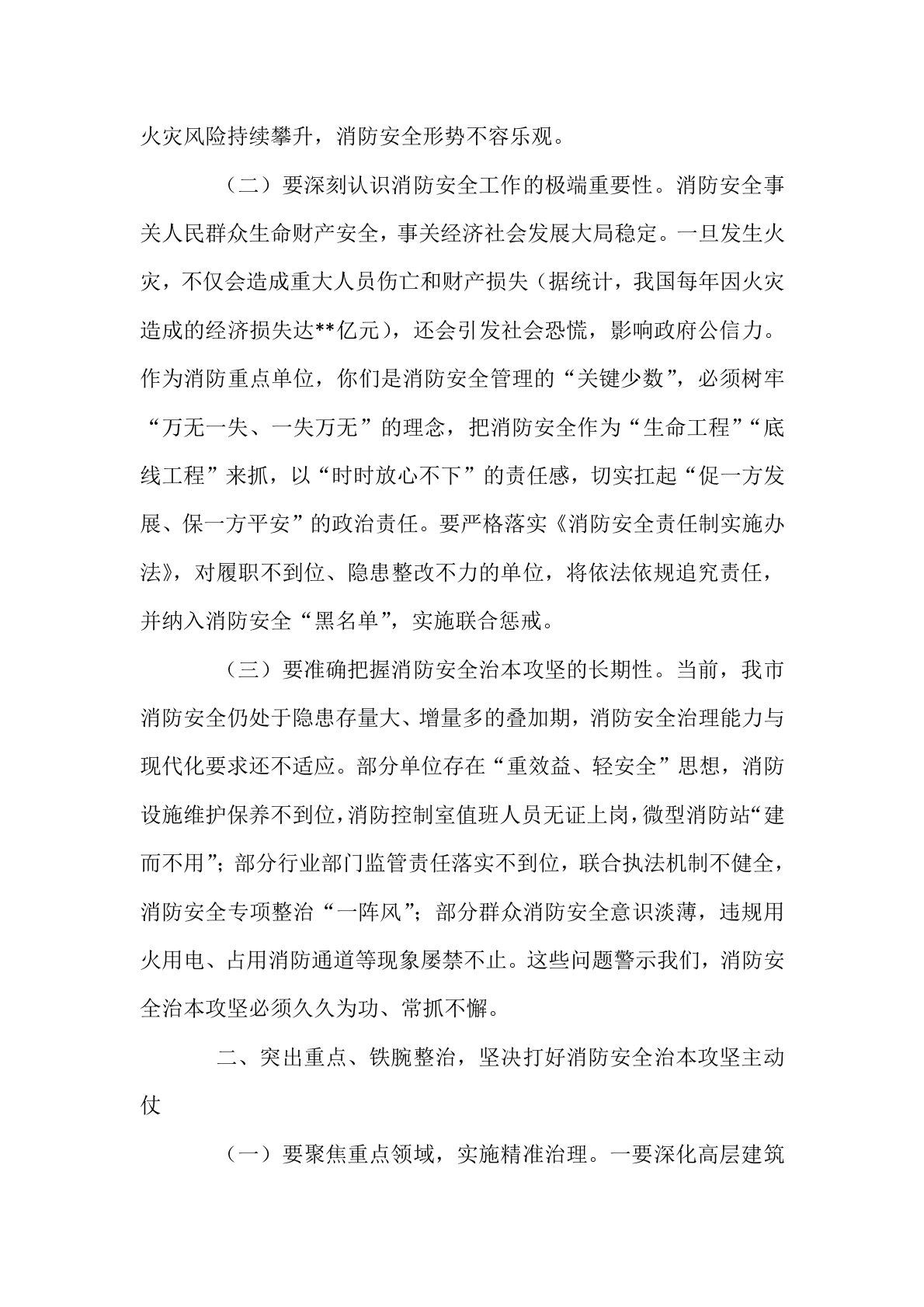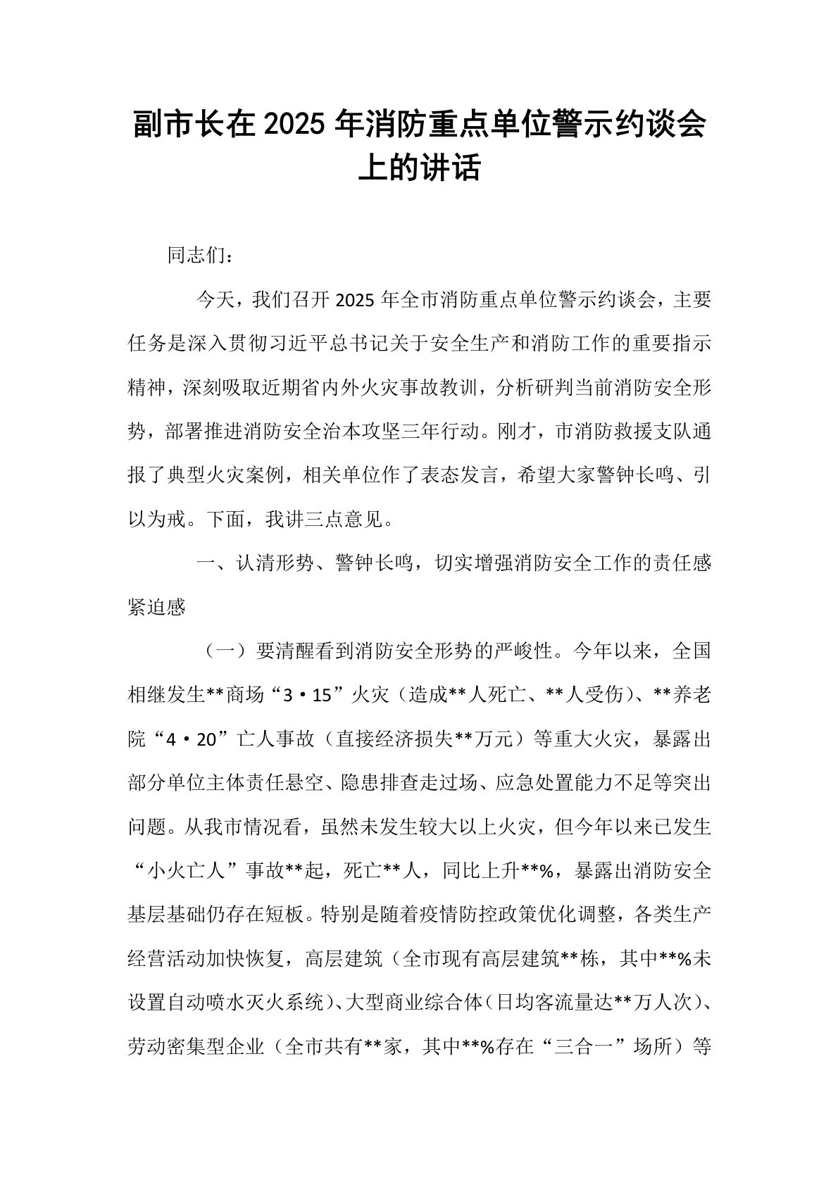 副市长在2025年消防重点单位警示约谈会上的讲话同志们:今天,我们召开2025年全市消防重点单位警示约谈会,主要任务是深入贯彻习近平总书记关于安全生产和消防工作的重要指示精神,深刻吸取近期省内外火灾事故教训,分析研判当前消防安全形势,部署推进消防安全治本攻坚三年行动。刚才,市消防救援支队通报了典型火灾案例,相关单位作了表态发言,希望大家警钟长鸣、引以为戒。下面,我讲三点意见。一、认清形势、警钟长鸣,切实增强消防安全工作的责任感紧迫感(一)要清醒看到消防安全形势的严峻性。今年以来,全国相继发生**商场“3·15”火灾(造成**人死亡、**人受伤)、**养老院“4·20”亡人事故(直接经济损失**...