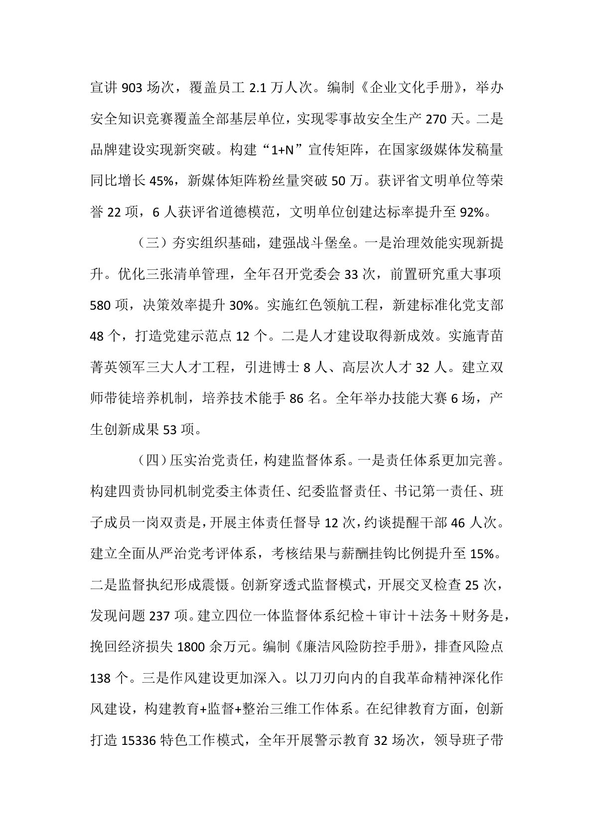 国有企业2025年上半年工作总结和下半年工作计划今年以来,公司党委深入学习贯彻习近平新时代中国特色社会主义思想,全面落实党的二十大精神及二十届二中、三中全会精神,坚决贯彻习近平总书记关于国企党建和改革发展重要指示,严格执行省委省政府决策部署。通过强化政治引领、深化改革创新、夯实安全根基等举措,全年实现主要经营指标两位数增长,资产负债率下降3.2个百分点,获得省国资委年度考核A级评定,在建设现代化一流能源企业征程中迈出坚实步伐。一、主要工作情况(一)深化政治建设,筑牢思想根基。一是理论武装展现新作为。构建三位一体学习体系,全年开展党委中心组学习21次、专题研讨11次,形成39篇高质量调研报告,建...