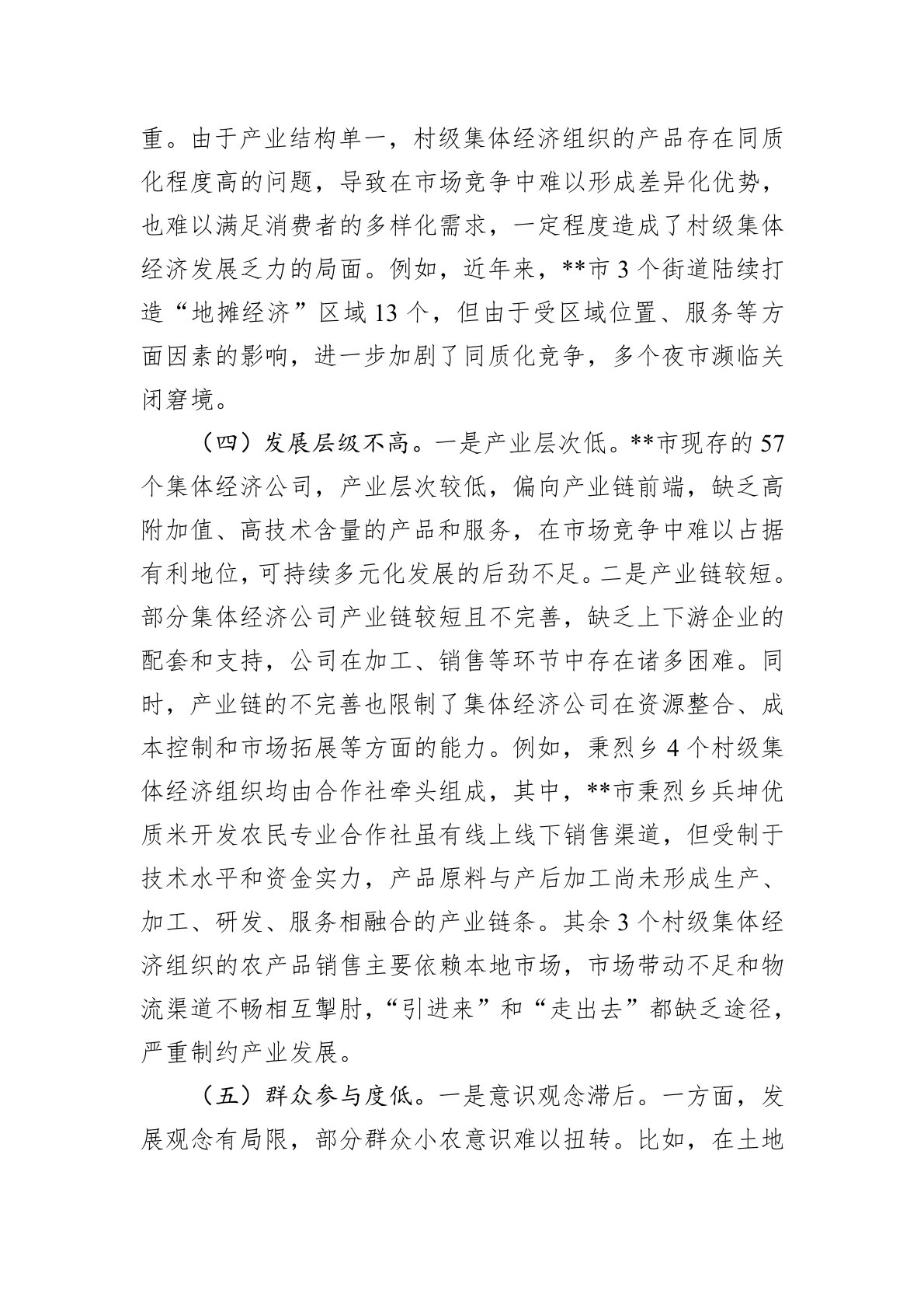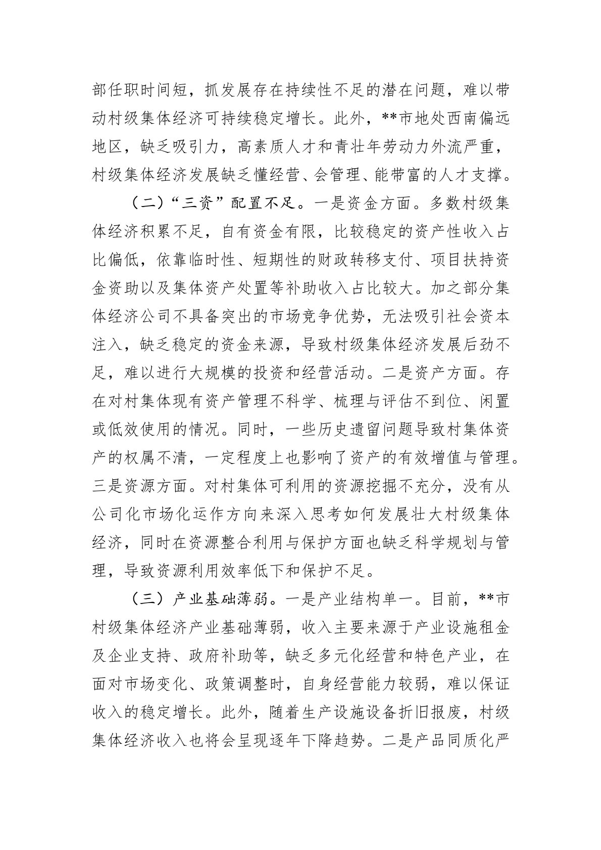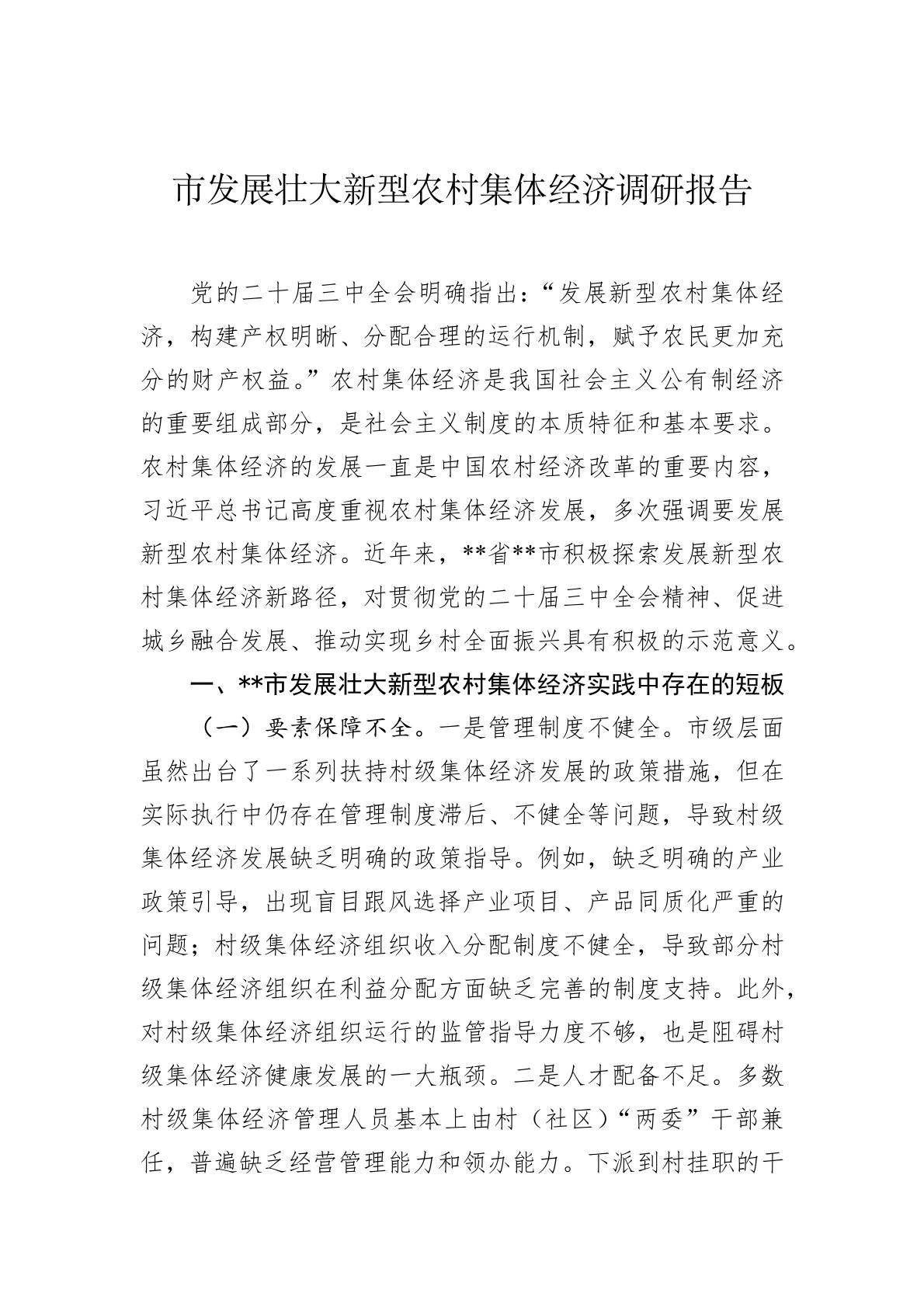 党的二十届三中全会明确指出:“发展新型农村集体经济,构建产权明晰、分配合理的运行机制,赋予农民更加充分的财产权益。”农村集体经济是我国社会主义公有制经济的重要组成部分,是社会主义制度的本质特征和基本要求。农村集体经济的发展一直是中国农村经济改革的重要内容,习近平总书记高度重视农村集体经济发展,多次强调要发展新型农村集体经济。近年来,**省**市积极探索发展新型农村集体经济新路径,对贯彻党的二十届三中全会精神、促进城乡融合发展、推动实现乡村全面振兴具有积极的示范意义。一、**市发展壮大新型农村集体经济实践中存在的短板(一)要素保障不全。一是管理制度不健全。市级层面虽然出台了一系列扶持村级集体经济...