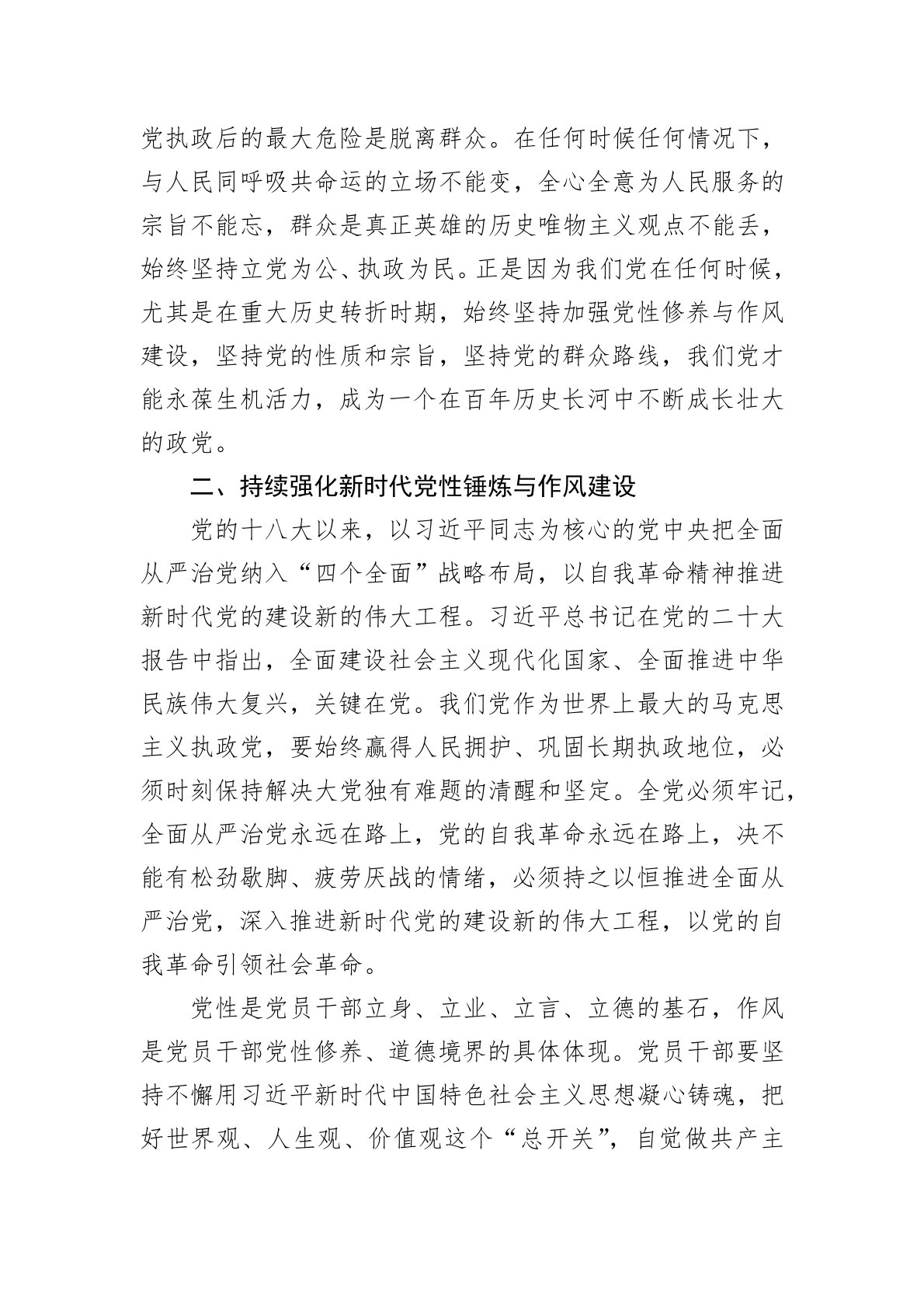 同志们:根据学习安排,今天我围绕“持续强化新时代党性锤炼与作风建设”这一主题,与大家作个交流。一、“党性锤炼”与“作风建设”是政党的根本性建设党性是一个政党的生命所系、力量所在,是党员、干部立身、立业、立言、立德的基石。作风是一个政党的形象,它反映着党员和领导干部的世界观、权力观和事业观,直接影响着党群干群关系。我们党自成立以来就十分重视党性和党风问题。在革命战争年代,我们党把增强党性作为解决思想入党的重要课题,作为保持党的先进性的重要举措。毛泽东同志指出,统一战线、武装斗争、党的建设,是中国革命的三大法宝。在三大法宝中,党的建设是最重要的。要加强党的建设,就必须增强各级党组织和全体党员的党性...