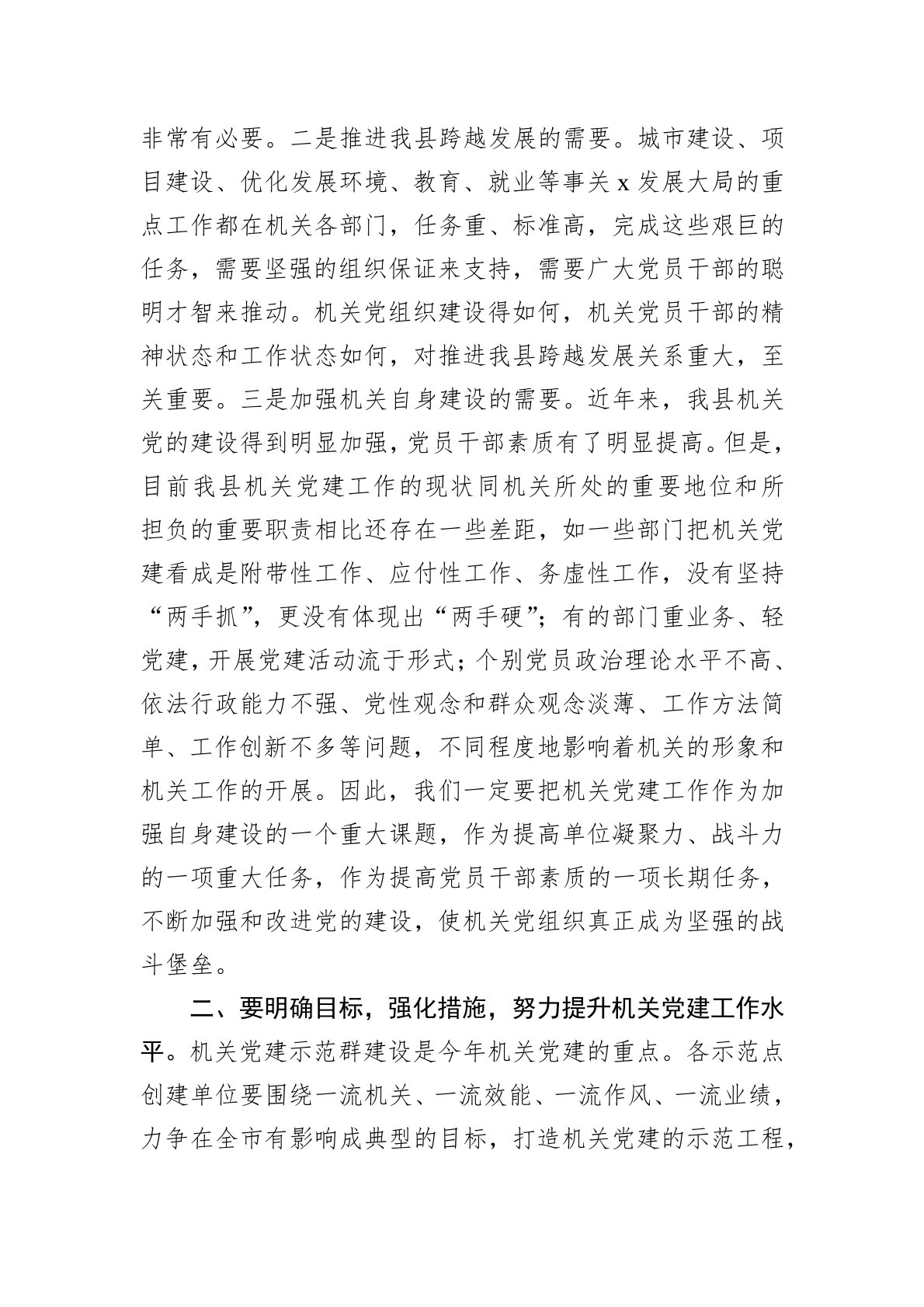 同志们:今天我们采取现场观摩、典型发言、组织座谈的形式,召开这次全县机关党建示范创建现场会。为了这次现场会,组织部和县直工委做了大量的前期准备工作,各有关单位也进行了精心的准备,可以说这次现场会开得比较成功。通过这样的形式召开机关党建现场会,目的就是要通过现场观摩,相互学习,寻找差距,启发思路,进一步探索和创新机关党建工作的有效途径和方法,不断推动和深化机关党建工作,提高机关党建工作水平。刚才,大家认真观摩了人事局、地税局、交警大队三个单位的党建工作,并听取了三个单位抓机关党建工作的主要做法和基本经验,xx同志对机关党建“124工程”进行了全面部署,部分单位就机关党建工作也作了表态发言,都讲得...