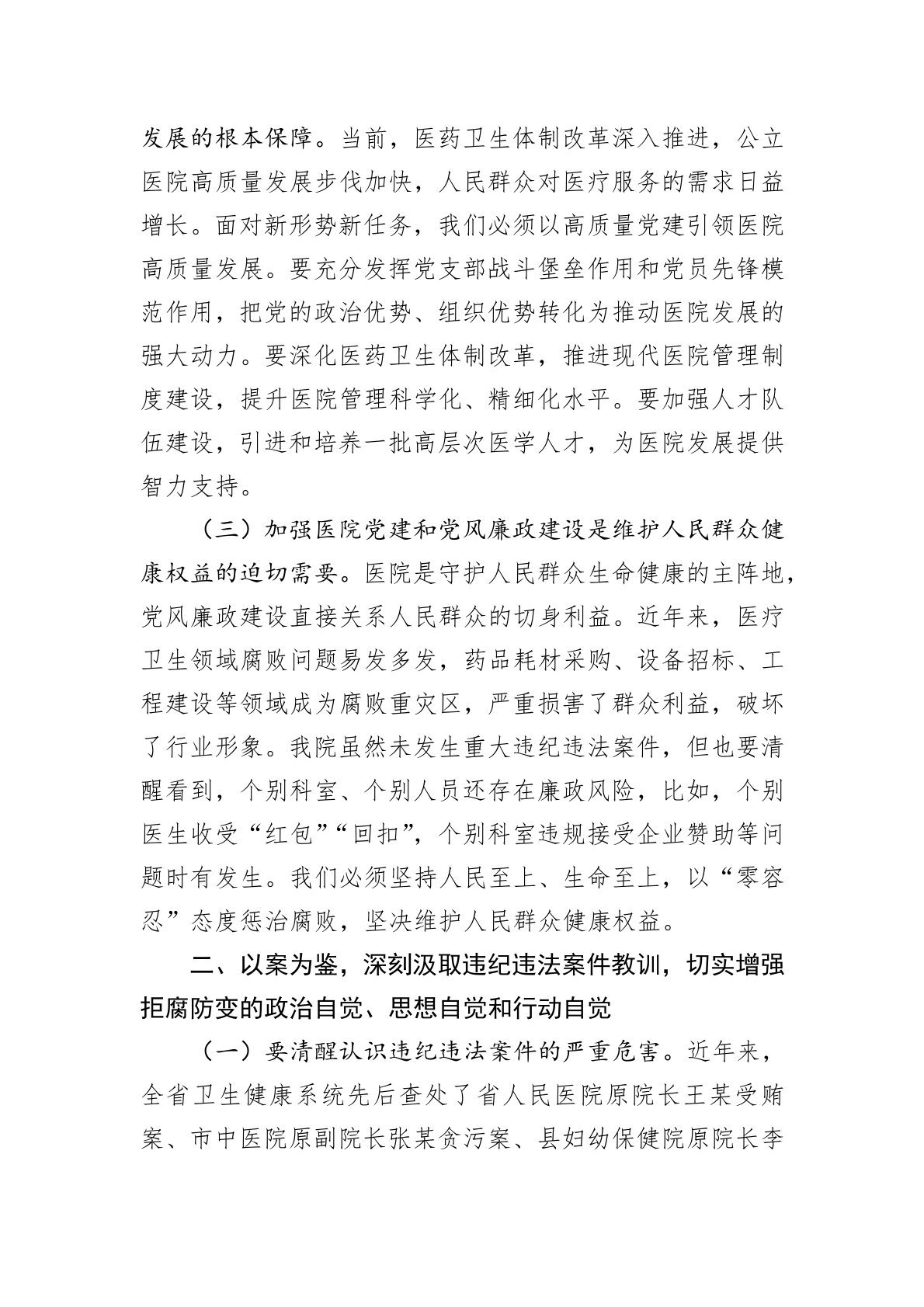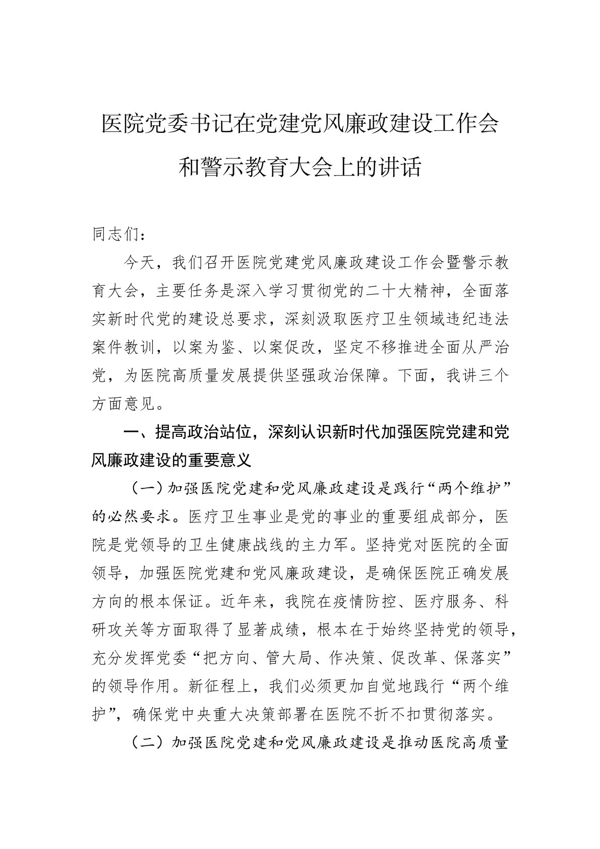 同志们:今天,我们召开医院党建党风廉政建设工作会暨警示教育大会,主要任务是深入学习贯彻党的二十大精神,全面落实新时代党的建设总要求,深刻汲取医疗卫生领域违纪违法案件教训,以案为鉴、以案促改,坚定不移推进全面从严治党,为医院高质量发展提供坚强政治保障。下面,我讲三个方面意见。一、提高政治站位,深刻认识新时代加强医院党建和党风廉政建设的重要意义(一)加强医院党建和党风廉政建设是践行“两个维护”的必然要求。医疗卫生事业是党的事业的重要组成部分,医院是党领导的卫生健康战线的主力军。坚持党对医院的全面领导,加强医院党建和党风廉政建设,是确保医院正确发展方向的根本保证。近年来,我院在疫情防控、医疗服务、科...