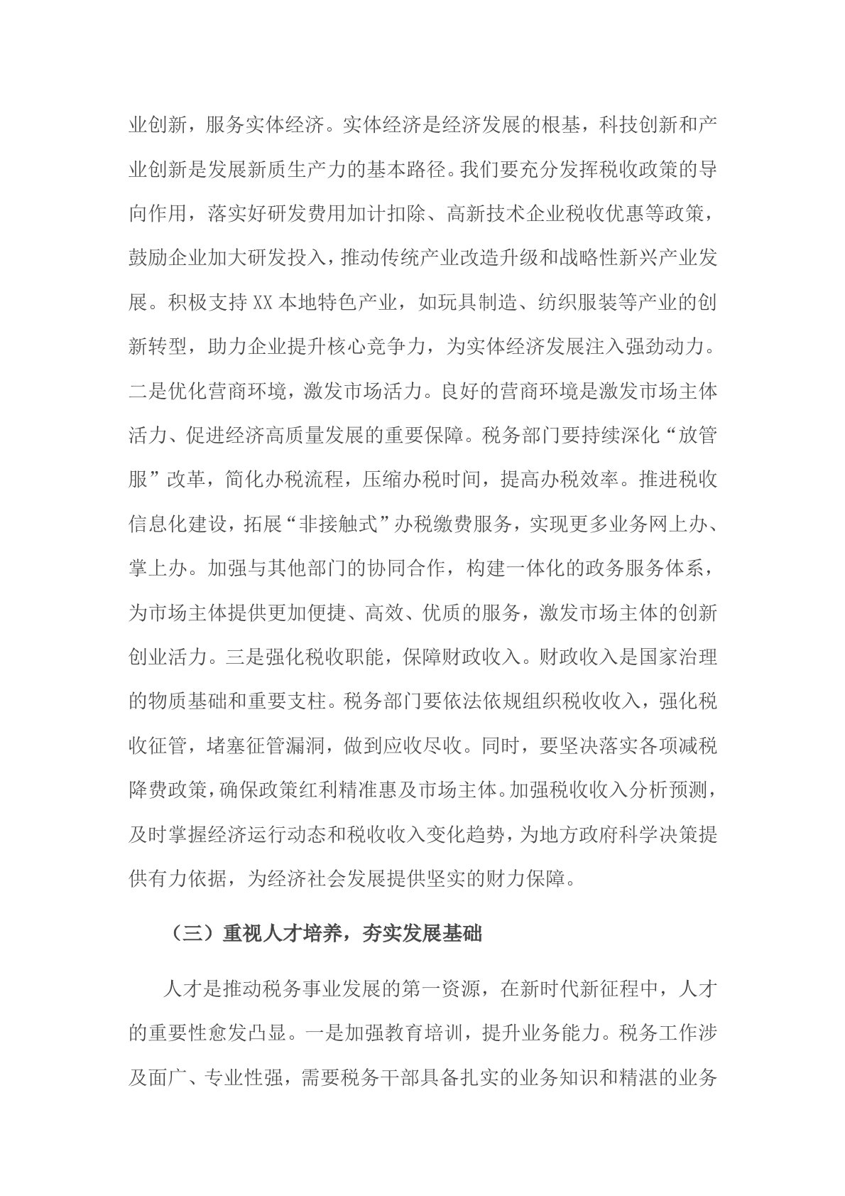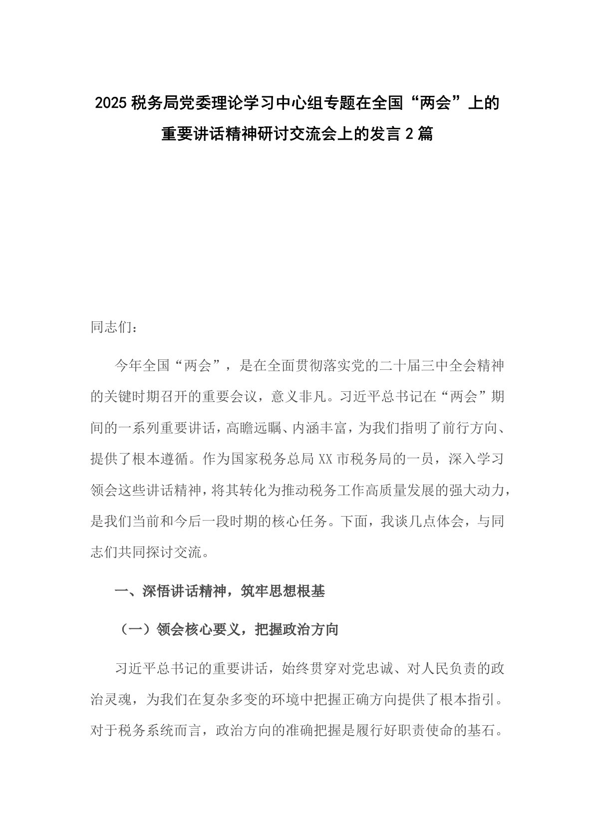 2025税务局党委理论学习中心组专题在全国“两会”上的重要讲话精神研讨交流会上的发言2篇同志们:今年全国“两会”,是在全面贯彻落实党的二十届三中全会精神的关键时期召开的重要会议,意义非凡。习近平总书记在“两会”期间的一系列重要讲话,高瞻远瞩、内涵丰富,为我们指明了前行方向、提供了根本遵循。作为国家税务总局XX市税务局的一员,深入学习领会这些讲话精神,将其转化为推动税务工作高质量发展的强大动力,是我们当前和今后一段时期的核心任务。下面,我谈几点体会,与同志们共同探讨交流。一、深悟讲话精神,筑牢思想根基(一)领会核心要义,把握政治方向习近平总书记的重要讲话,始终贯穿对党忠诚、对人民负责的政治灵魂,...