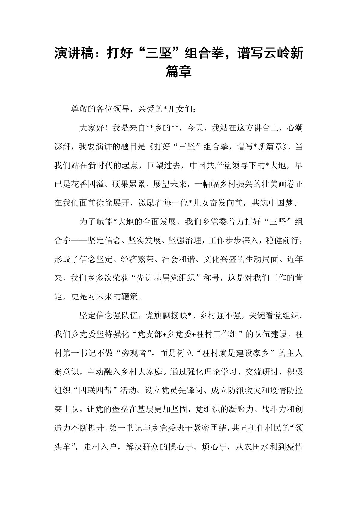 演讲稿:打好“三坚”组合拳,谱写云岭新篇章尊敬的各位领导,亲爱的*儿女们:大家好!我是来自**乡的**,今天,我站在这方讲台上,心潮澎湃,我要演讲的题目是《打好“三坚”组合拳,谱写*新篇章》。当我们站在新时代的起点,回望过去,中国共产党领导下的*大地,早已是花香四溢、硕果累累。展望未来,一幅幅乡村振兴的壮美画卷正在我们面前徐徐展开,激励着每一位*儿女奋发向前,共筑中国梦。为了赋能*大地的全面发展,我们乡党委着力打好“三坚”组合拳——坚定信念、坚实发展、坚强治理,工作步步深入,稳健前行,形成了信念坚定、经济繁荣、社会和谐、文化兴盛的生动局面。近年来,我们乡多次荣获“先进基层党组织”称号,这是对我...