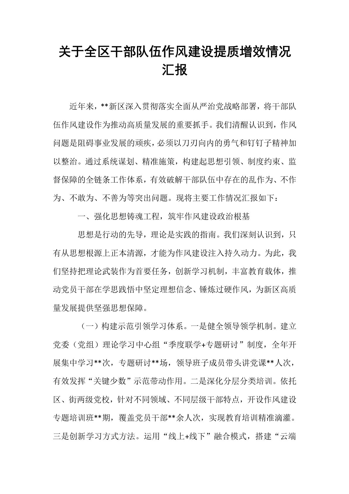 关于全区干部队伍作风建设提质增效情况汇报近年来,**新区深入贯彻落实全面从严治党战略部署,将干部队伍作风建设作为推动高质量发展的重要抓手。我们清醒认识到,作风问题是阻碍事业发展的顽疾,必须以刀刃向内的勇气和钉钉子精神加以整治。通过系统谋划、精准施策,构建起思想引领、制度约束、监督保障的全链条工作体系,有效破解干部队伍中存在的乱作为、不作为、不敢为、不善为等突出问题。现将主要工作情况汇报如下:一、强化思想铸魂工程,筑牢作风建设政治根基思想是行动的先导,理论是实践的指南。我们深刻认识到,只有从思想根源上正本清源,才能为作风建设注入持久动力。为此,我们坚持把理论武装作为首要任务,创新学习机制,丰富教...