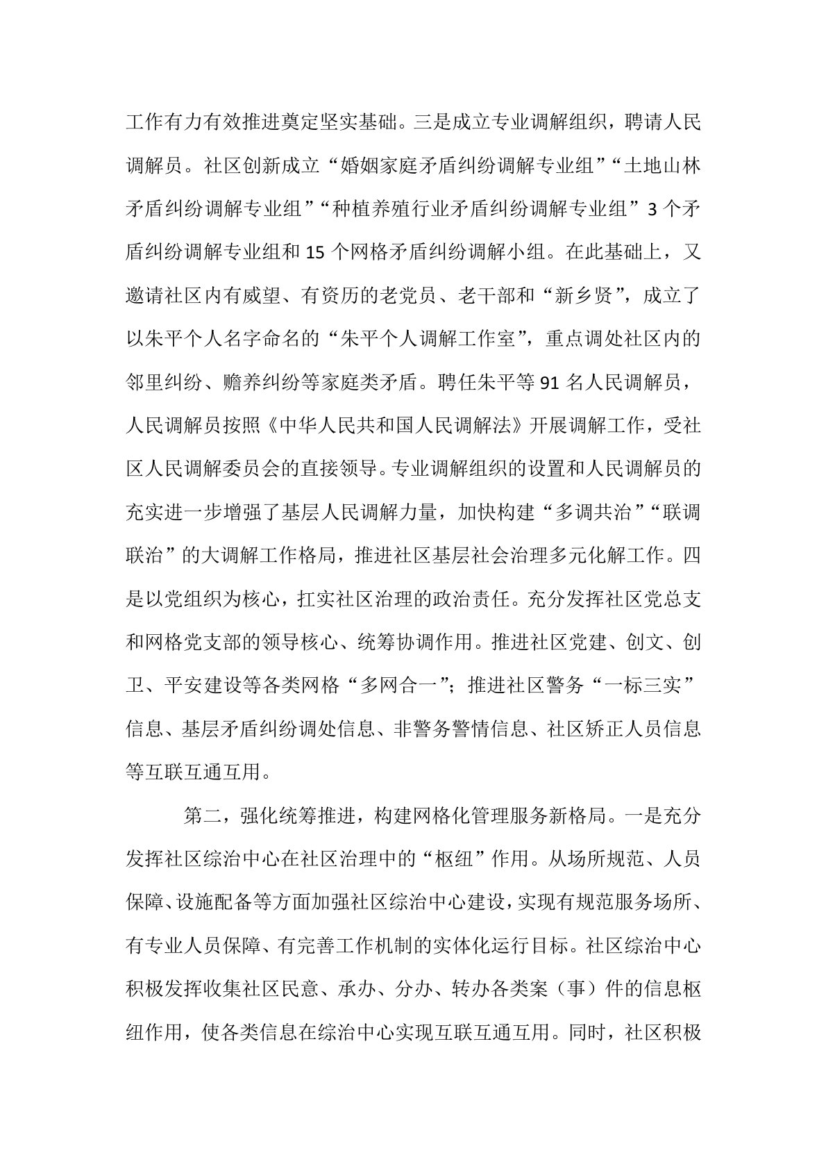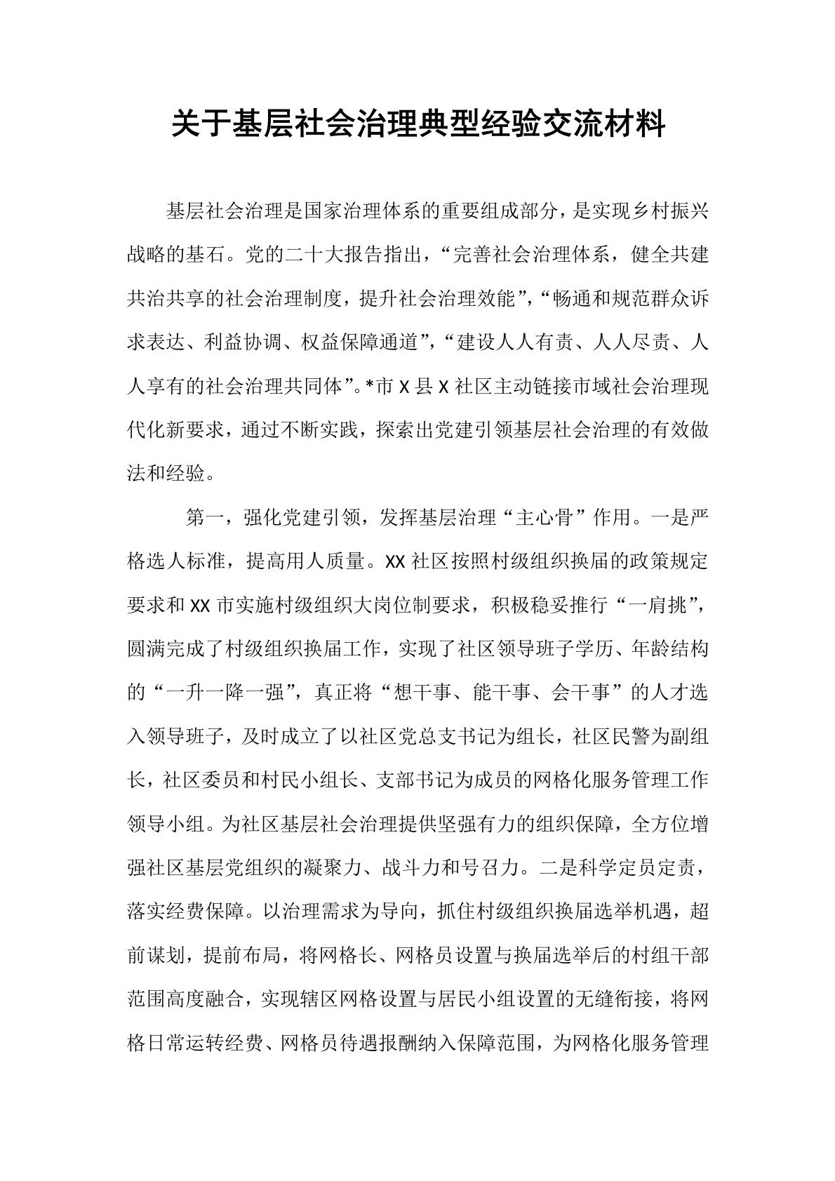 关于基层社会治理典型经验交流材料基层社会治理是国家治理体系的重要组成部分,是实现乡村振兴战略的基石。党的二十大报告指出,“完善社会治理体系,健全共建共治共享的社会治理制度,提升社会治理效能”,“畅通和规范群众诉求表达、利益协调、权益保障通道”,“建设人人有责、人人尽责、人人享有的社会治理共同体”。*市X县X社区主动链接市域社会治理现代化新要求,通过不断实践,探索出党建引领基层社会治理的有效做法和经验。第一,强化党建引领,发挥基层治理“主心骨”作用。一是严格选人标准,提高用人质量。XX社区按照村级组织换届的政策规定要求和XX市实施村级组织大岗位制要求,积极稳妥推行“一肩挑”,圆满完成了村级组织换...