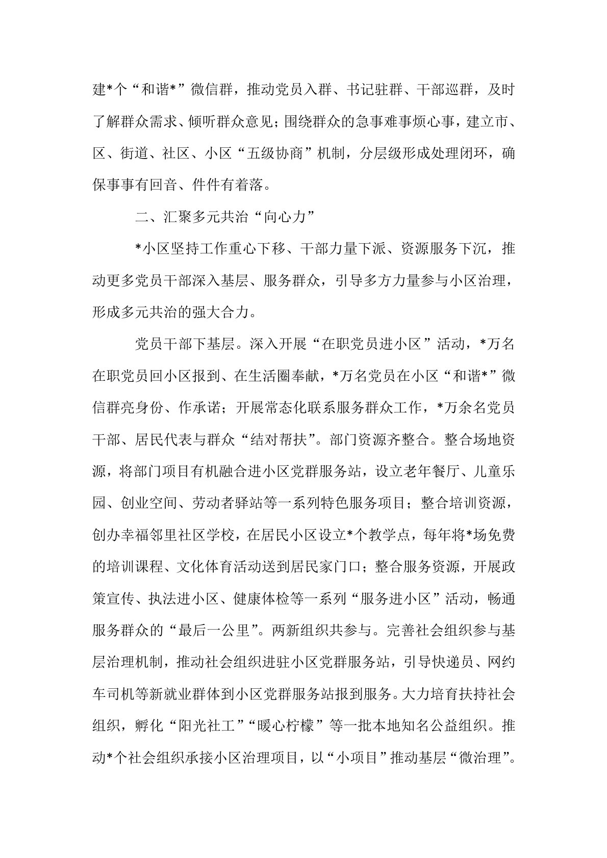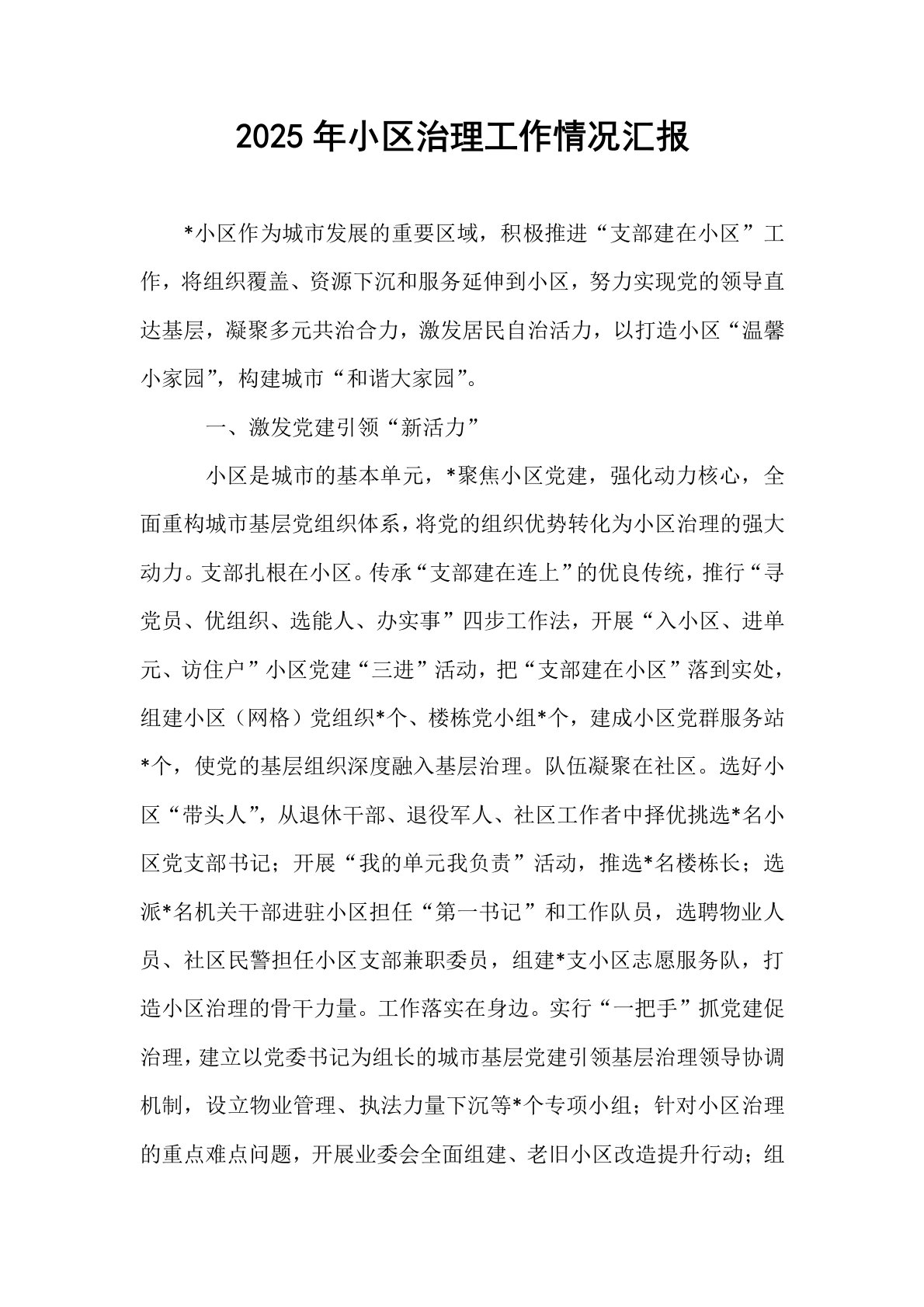 2025年小区治理工作情况汇报*小区作为城市发展的重要区域,积极推进“支部建在小区”工作,将组织覆盖、资源下沉和服务延伸到小区,努力实现党的领导直达基层,凝聚多元共治合力,激发居民自治活力,以打造小区“温馨小家园”,构建城市“和谐大家园”。一、激发党建引领“新活力”小区是城市的基本单元,*聚焦小区党建,强化动力核心,全面重构城市基层党组织体系,将党的组织优势转化为小区治理的强大动力。支部扎根在小区。传承“支部建在连上”的优良传统,推行“寻党员、优组织、选能人、办实事”四步工作法,开展“入小区、进单元、访住户”小区党建“三进”活动,把“支部建在小区”落到实处,组建小区(网格)党组织*个、楼栋党小...