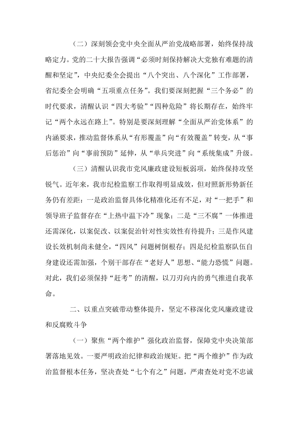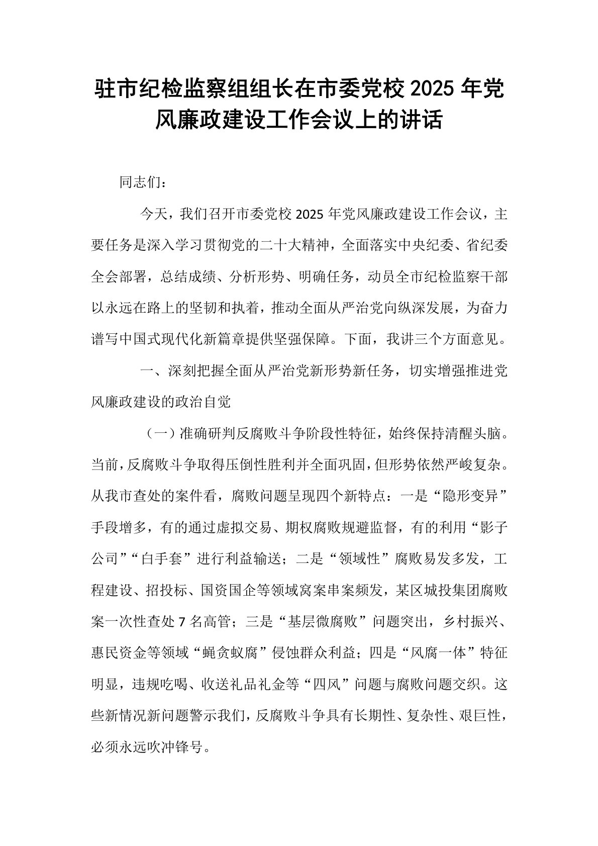 驻市纪检监察组组长在市委党校2025年党风廉政建设工作会议上的讲话同志们:今天,我们召开市委党校2025年党风廉政建设工作会议,主要任务是深入学习贯彻党的二十大精神,全面落实中央纪委、省纪委全会部署,总结成绩、分析形势、明确任务,动员全市纪检监察干部以永远在路上的坚韧和执着,推动全面从严治党向纵深发展,为奋力谱写中国式现代化新篇章提供坚强保障。下面,我讲三个方面意见。一、深刻把握全面从严治党新形势新任务,切实增强推进党风廉政建设的政治自觉(一)准确研判反腐败斗争阶段性特征,始终保持清醒头脑。当前,反腐败斗争取得压倒性胜利并全面巩固,但形势依然严峻复杂。从我市查处的案件看,腐败问题呈现四个新特点...