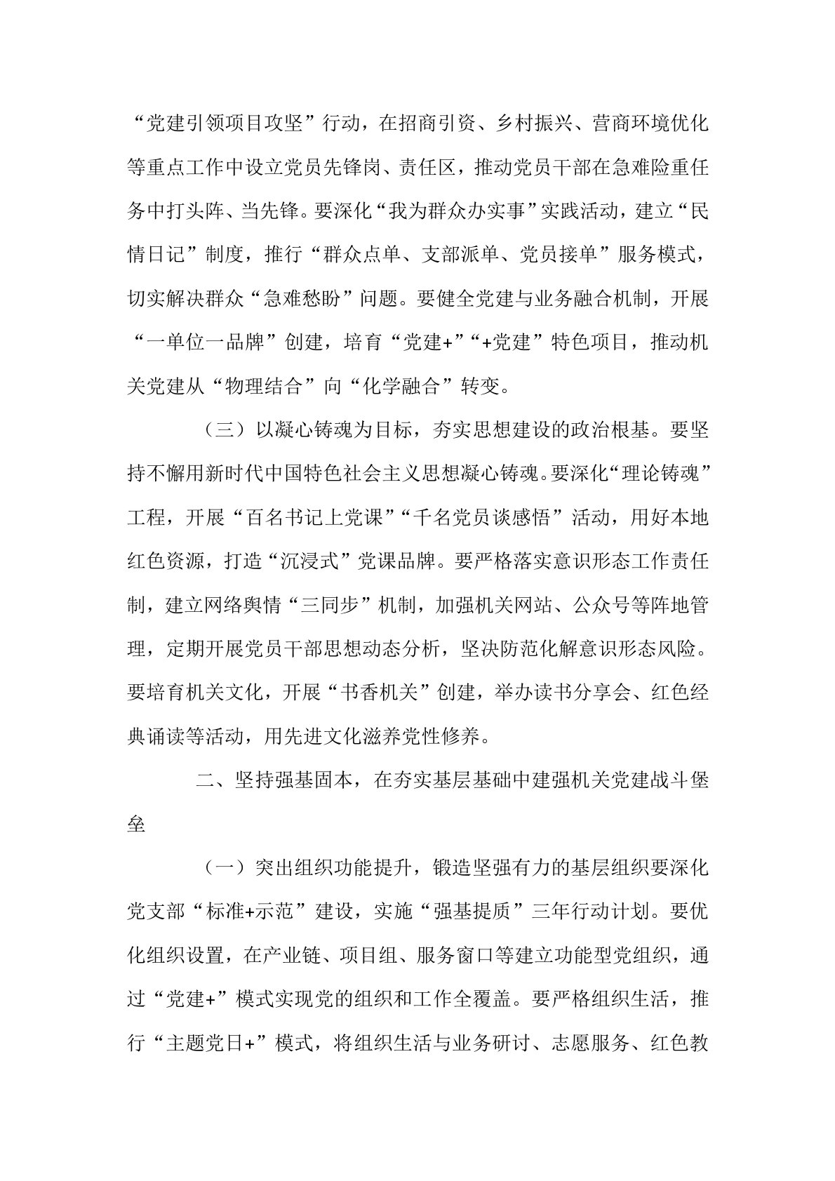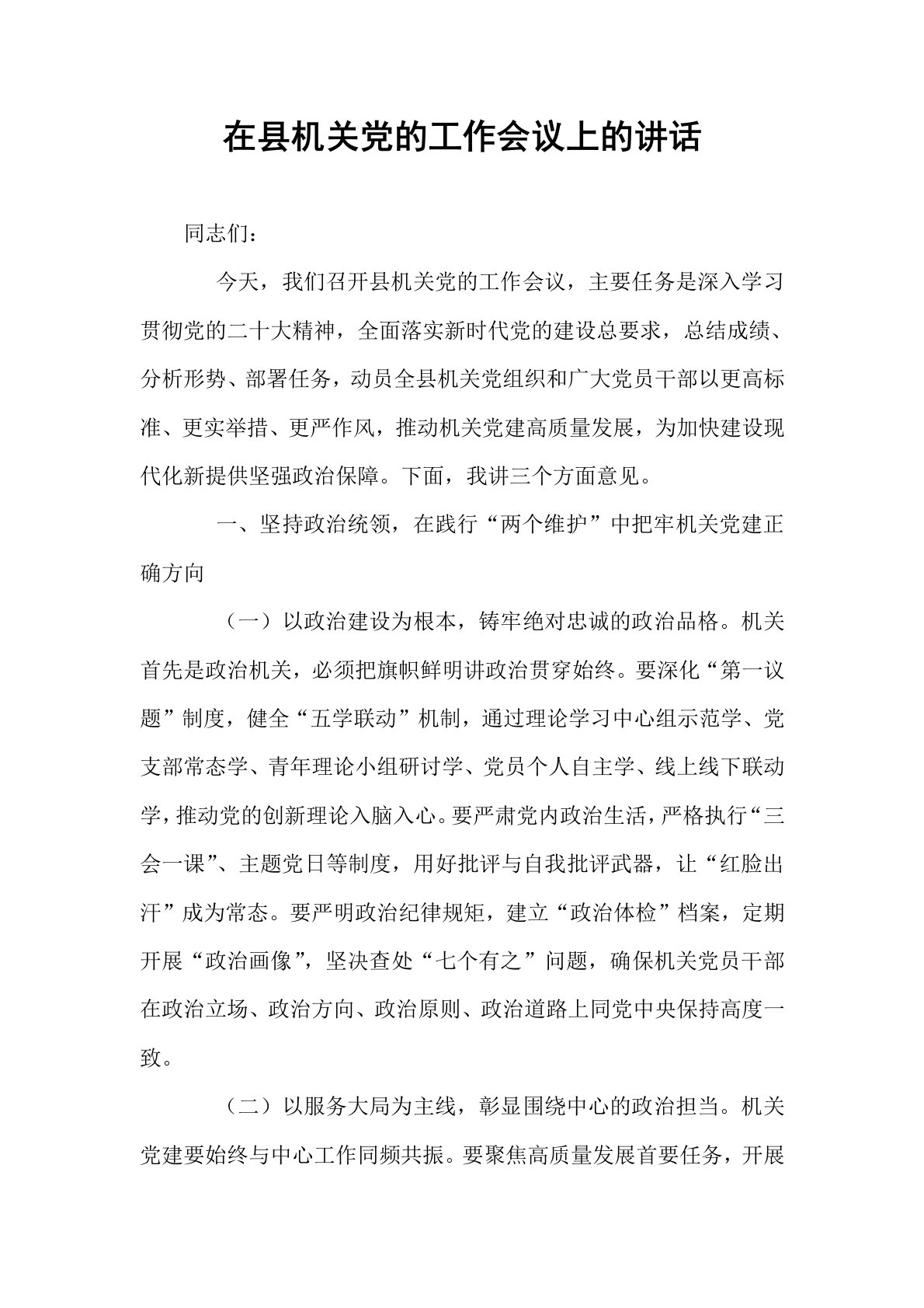 在县机关党的工作会议上的讲话同志们:今天,我们召开县机关党的工作会议,主要任务是深入学习贯彻党的二十大精神,全面落实新时代党的建设总要求,总结成绩、分析形势、部署任务,动员全县机关党组织和广大党员干部以更高标准、更实举措、更严作风,推动机关党建高质量发展,为加快建设现代化新提供坚强政治保障。下面,我讲三个方面意见。一、坚持政治统领,在践行“两个维护”中把牢机关党建正确方向(一)以政治建设为根本,铸牢绝对忠诚的政治品格。机关首先是政治机关,必须把旗帜鲜明讲政治贯穿始终。要深化“第一议题”制度,健全“五学联动”机制,通过理论学习中心组示范学、党支部常态学、青年理论小组研讨学、党员个人自主学、线上线...