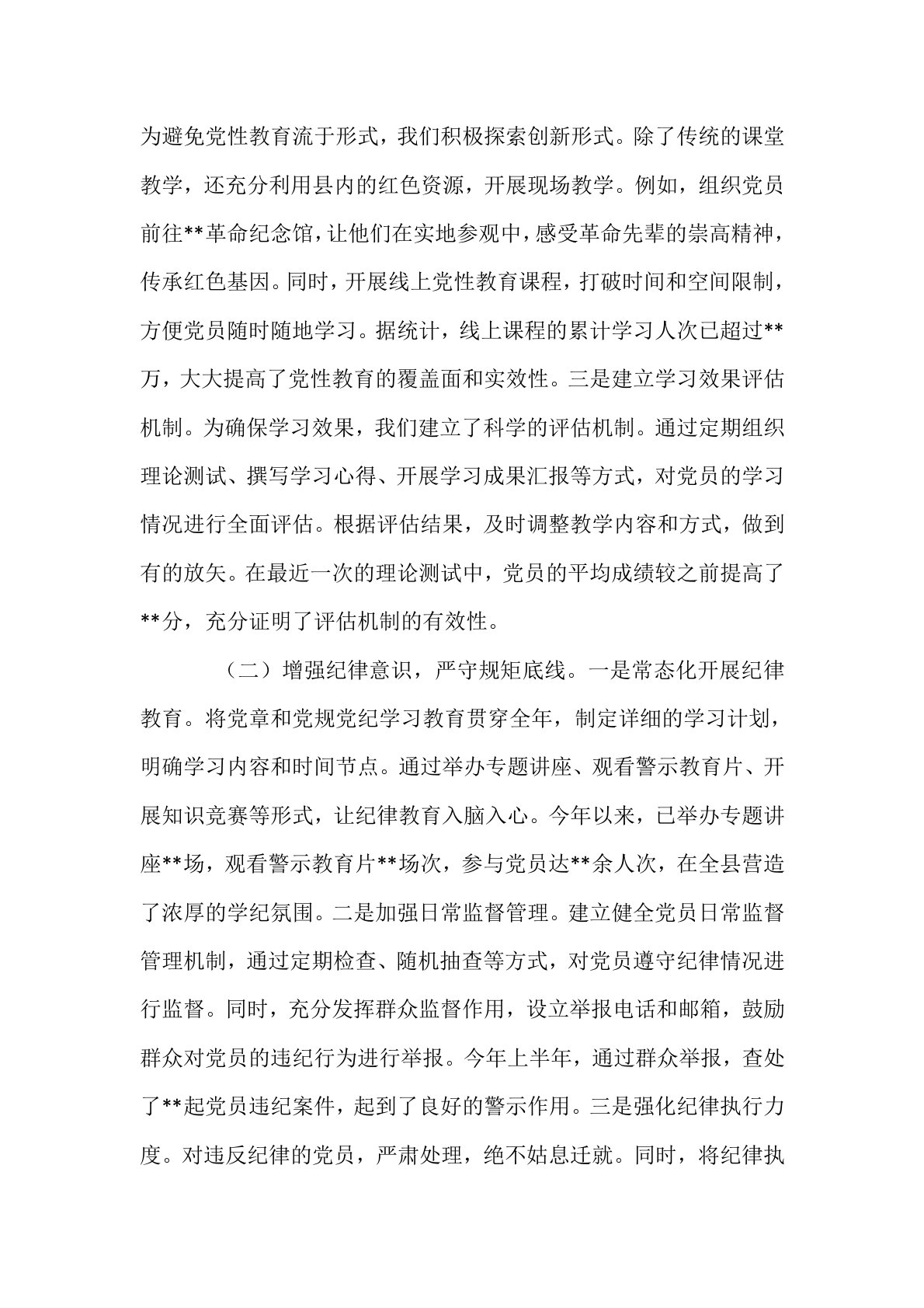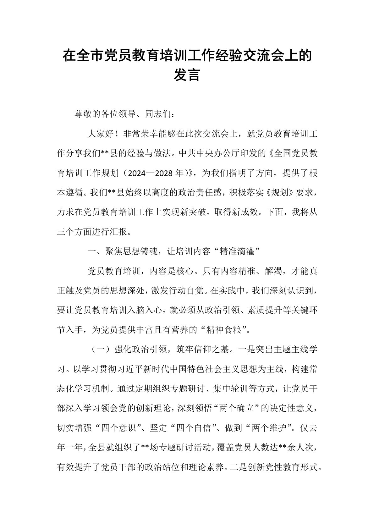 在全市党员教育培训工作经验交流会上的发言尊敬的各位领导、同志们:大家好!非常荣幸能够在此次交流会上,就党员教育培训工作分享我们**县的经验与做法。中共中央办公厅印发的《全国党员教育培训工作规划(2024—2028年)》,为我们指明了方向,提供了根本遵循。我们**县始终以高度的政治责任感,积极落实《规划》要求,力求在党员教育培训工作上实现新突破,取得新成效。下面,我将从三个方面进行汇报。一、聚焦思想铸魂,让培训内容“精准滴灌”党员教育培训,内容是核心。只有内容精准、解渴,才能真正触及党员的思想深处,激发行动自觉。在实践中,我们深刻认识到,要让党员教育培训入脑入心,就必须从政治引领、素质提升等关键...