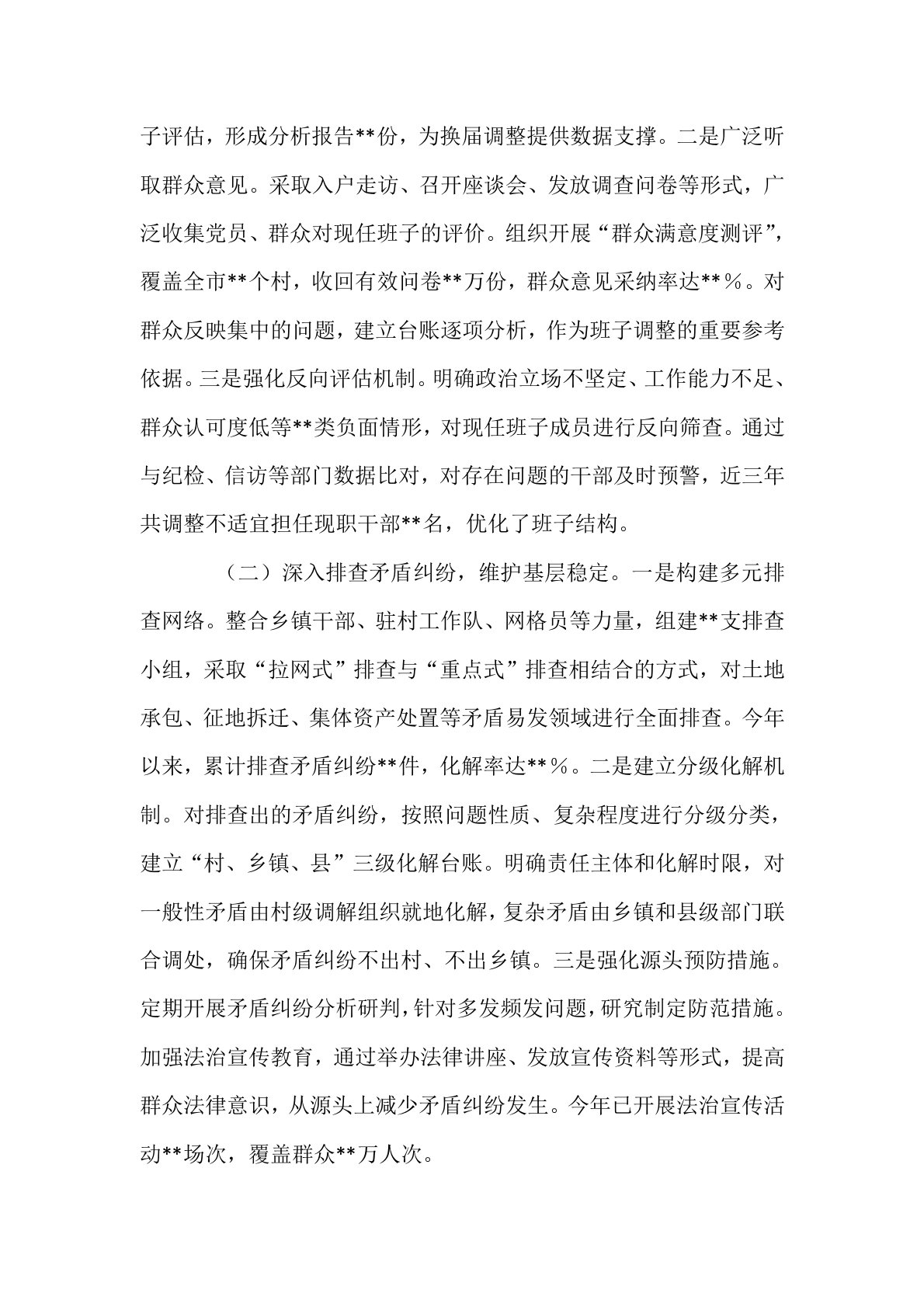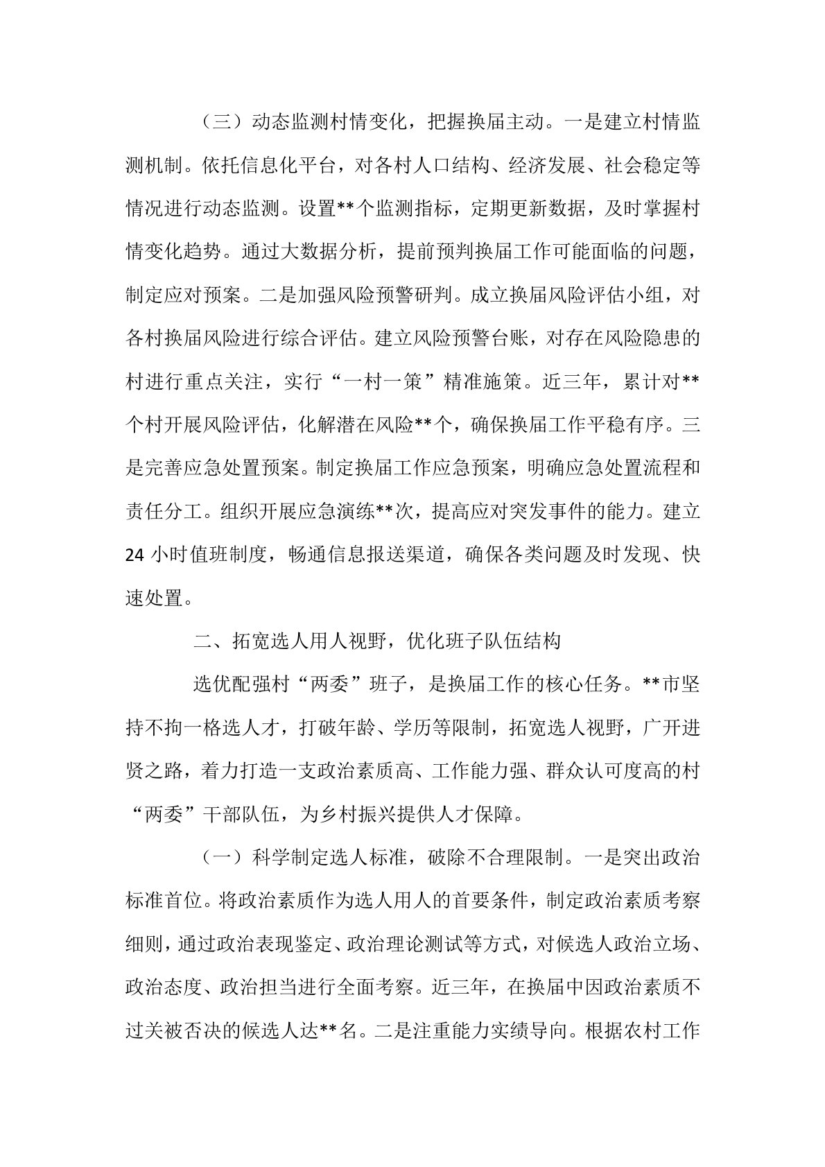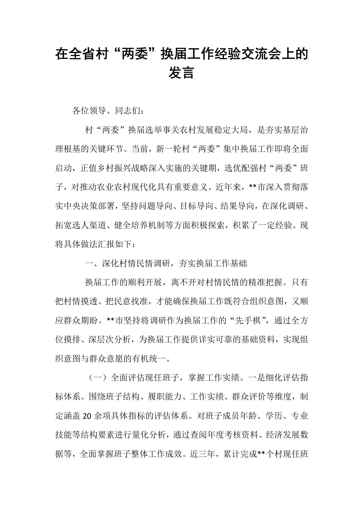 在全省村“两委”换届工作经验交流会上的发言各位领导、同志们:村“两委”换届选举事关农村发展稳定大局,是夯实基层治理根基的关键环节。当前,新一轮村“两委”集中换届工作即将全面启动,正值乡村振兴战略深入实施的关键期,选优配强村“两委”班子,对推动农业农村现代化具有重要意义。近年来,**市深入贯彻落实中央决策部署,坚持问题导向、目标导向、结果导向,在深化调研、拓宽选人渠道、健全培养机制等方面积极探索,积累了一定经验。现将具体做法汇报如下:一、深化村情民情调研,夯实换届工作基础换届工作的顺利开展,离不开对村情民情的精准把握。只有把村情摸透、把民意找准,才能确保换届工作既符合组织意图,又顺应群众期盼。*...