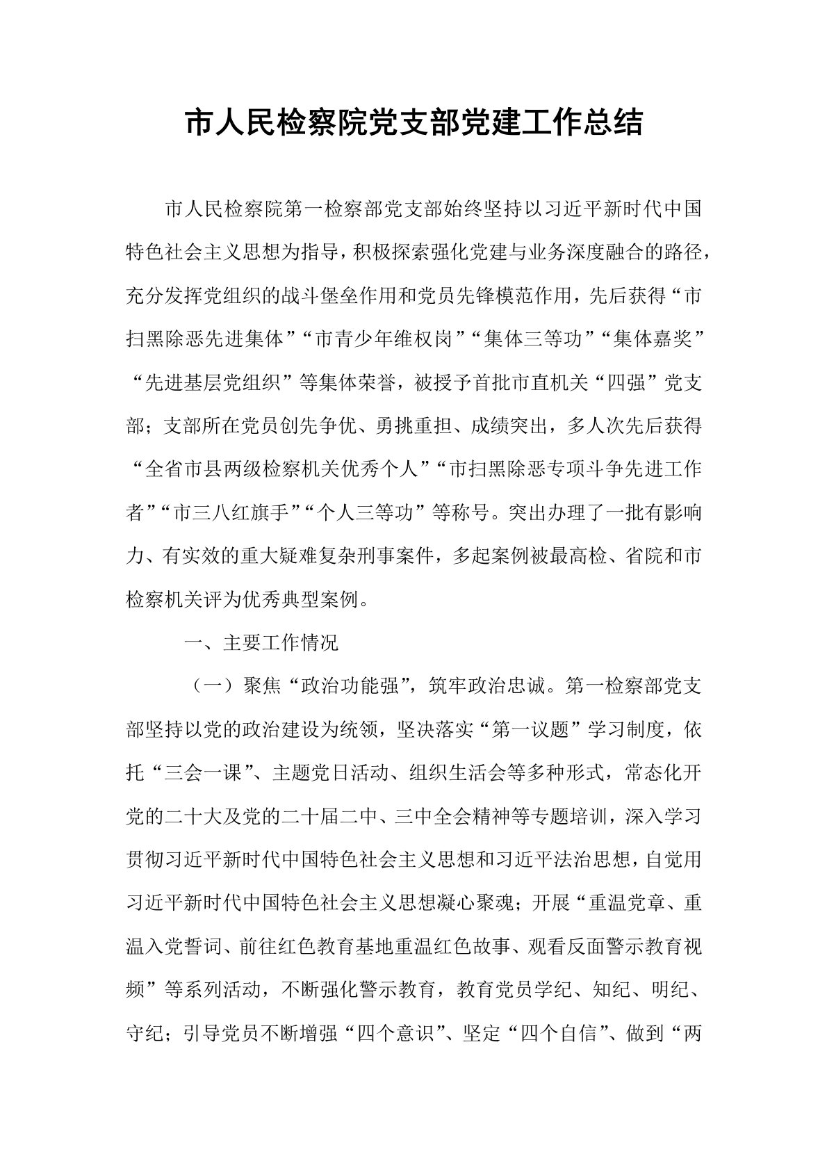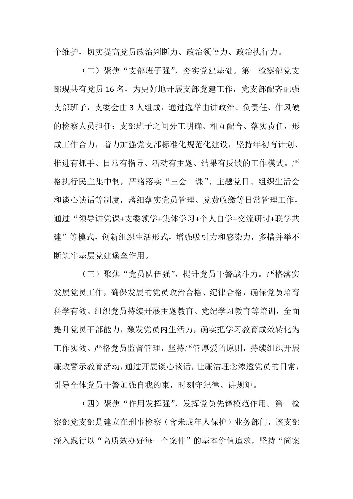 市人民检察院党支部党建工作总结市人民检察院第一检察部党支部始终坚持以习近平新时代中国特色社会主义思想为指导,积极探索强化党建与业务深度融合的路径,充分发挥党组织的战斗堡垒作用和党员先锋模范作用,先后获得“市扫黑除恶先进集体”“市青少年维权岗”“集体三等功”“集体嘉奖”“先进基层党组织”等集体荣誉,被授予首批市直机关“四强”党支部;支部所在党员创先争优、勇挑重担、成绩突出,多人次先后获得“全省市县两级检察机关优秀个人”“市扫黑除恶专项斗争先进工作者”“市三八红旗手”“个人三等功”等称号。突出办理了一批有影响力、有实效的重大疑难复杂刑事案件,多起案例被最高检、省院和市检察机关评为优秀典型案例。一、...