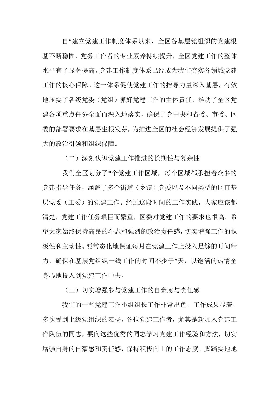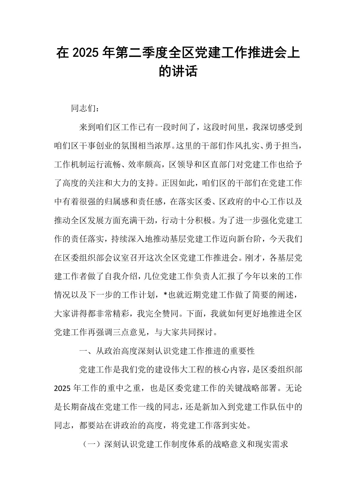 在2025年第二季度全区党建工作推进会上的讲话同志们:来到咱们区工作已有一段时间了,这段时间里,我深切感受到咱们区干事创业的氛围相当浓厚。这里的干部们作风扎实、勇于担当,工作机制运行流畅、效率颇高,区领导和区直部门对党建工作也给予了高度的关注和大力的支持。正因如此,咱们区的干部们在党建工作中有着很强的归属感和责任感,在落实区委、区政府的中心工作以及推动全区发展方面充满干劲,行动十分积极。为了进一步强化党建工作的责任落实,持续深入地推动基层党建工作迈向新台阶,今天我们在区委组织部会议室召开这次全区党建工作推进会。刚才,各基层党建工作者做了自我介绍,几位党建工作负责人汇报了今年以来的工作情况以及下...