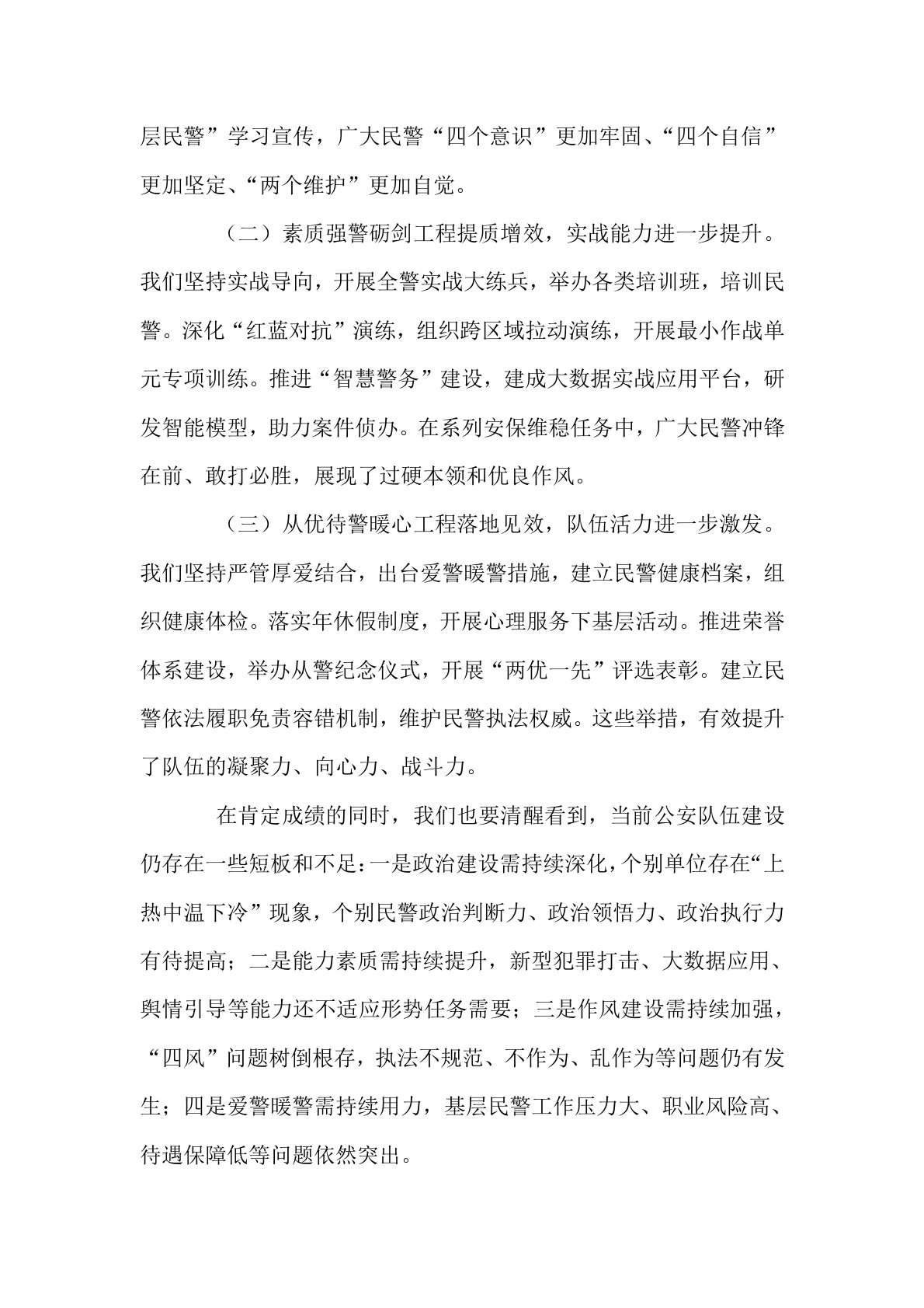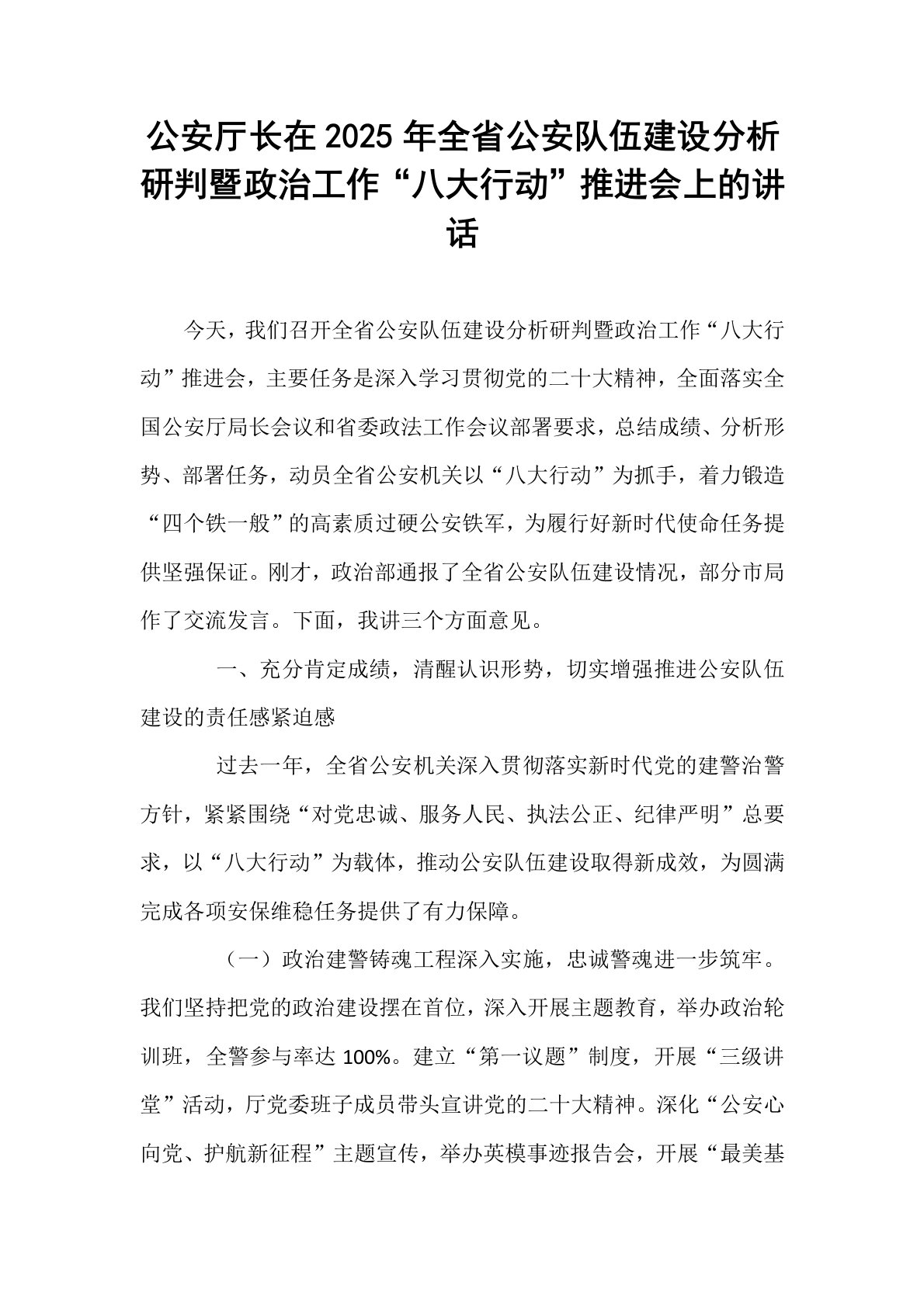公安厅长在2025年全省公安队伍建设分析研判暨政治工作“八大行动”推进会上的讲话今天,我们召开全省公安队伍建设分析研判暨政治工作“八大行动”推进会,主要任务是深入学习贯彻党的二十大精神,全面落实全国公安厅局长会议和省委政法工作会议部署要求,总结成绩、分析形势、部署任务,动员全省公安机关以“八大行动”为抓手,着力锻造“四个铁一般”的高素质过硬公安铁军,为履行好新时代使命任务提供坚强保证。刚才,政治部通报了全省公安队伍建设情况,部分市局作了交流发言。下面,我讲三个方面意见。一、充分肯定成绩,清醒认识形势,切实增强推进公安队伍建设的责任感紧迫感过去一年,全省公安机关深入贯彻落实新时代党的建警治警方针...