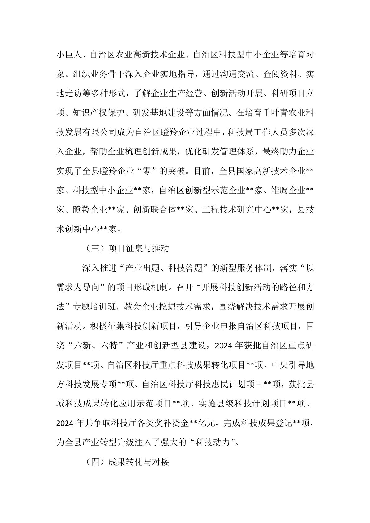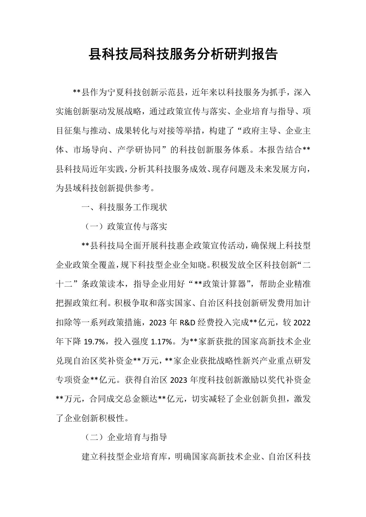 县科技局科技服务分析研判报告**县作为宁夏科技创新示范县,近年来以科技服务为抓手,深入实施创新驱动发展战略,通过政策宣传与落实、企业培育与指导、项目征集与推动、成果转化与对接等举措,构建了“政府主导、企业主体、市场导向、产学研协同”的科技创新服务体系。本报告结合**县科技局近年实践,分析其科技服务成效、现存问题及未来发展方向,为县域科技创新提供参考。一、科技服务工作现状(一)政策宣传与落实**县科技局全面开展科技惠企政策宣传活动,确保规上科技型企业政策全覆盖,规下科技型企业全知晓。积极发放全区科技创新“二十二”条政策读本,指导企业用好“**政策计算器”,帮助企业精准把握政策红利。积极争取和落实...