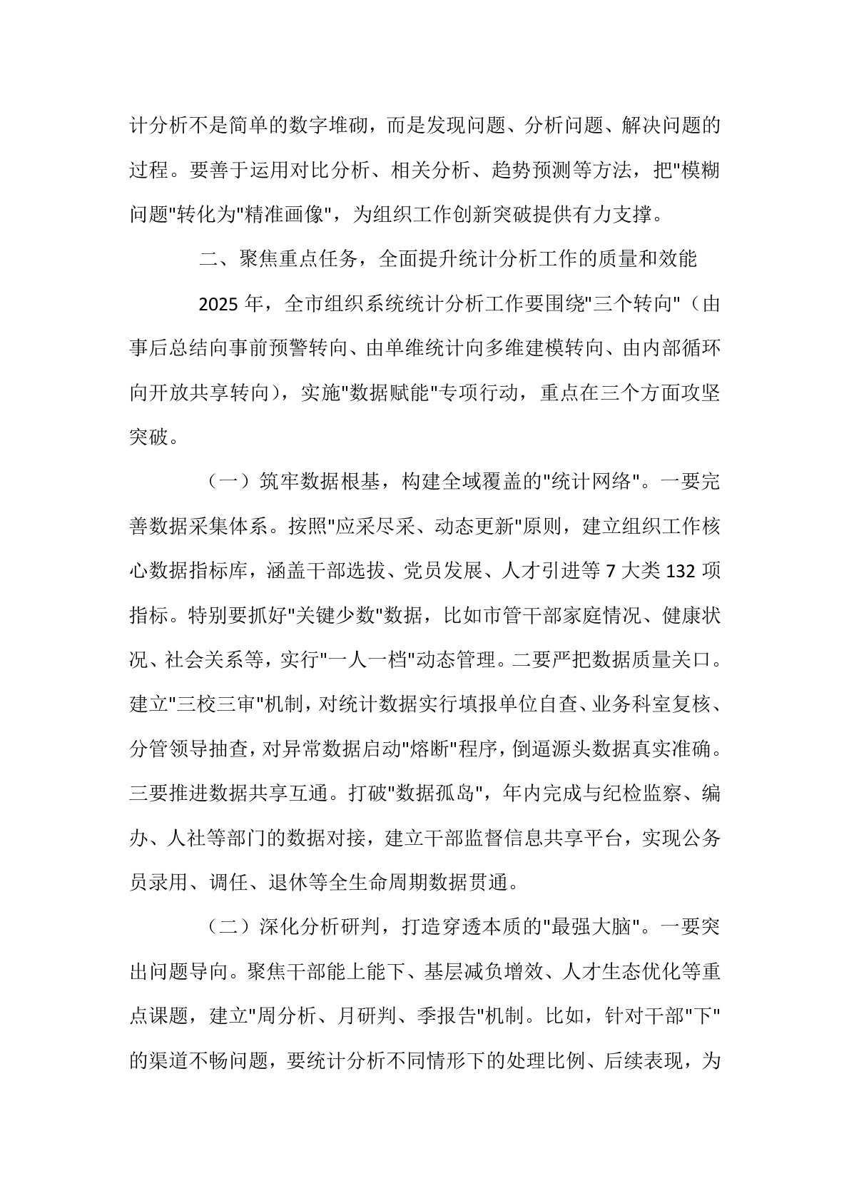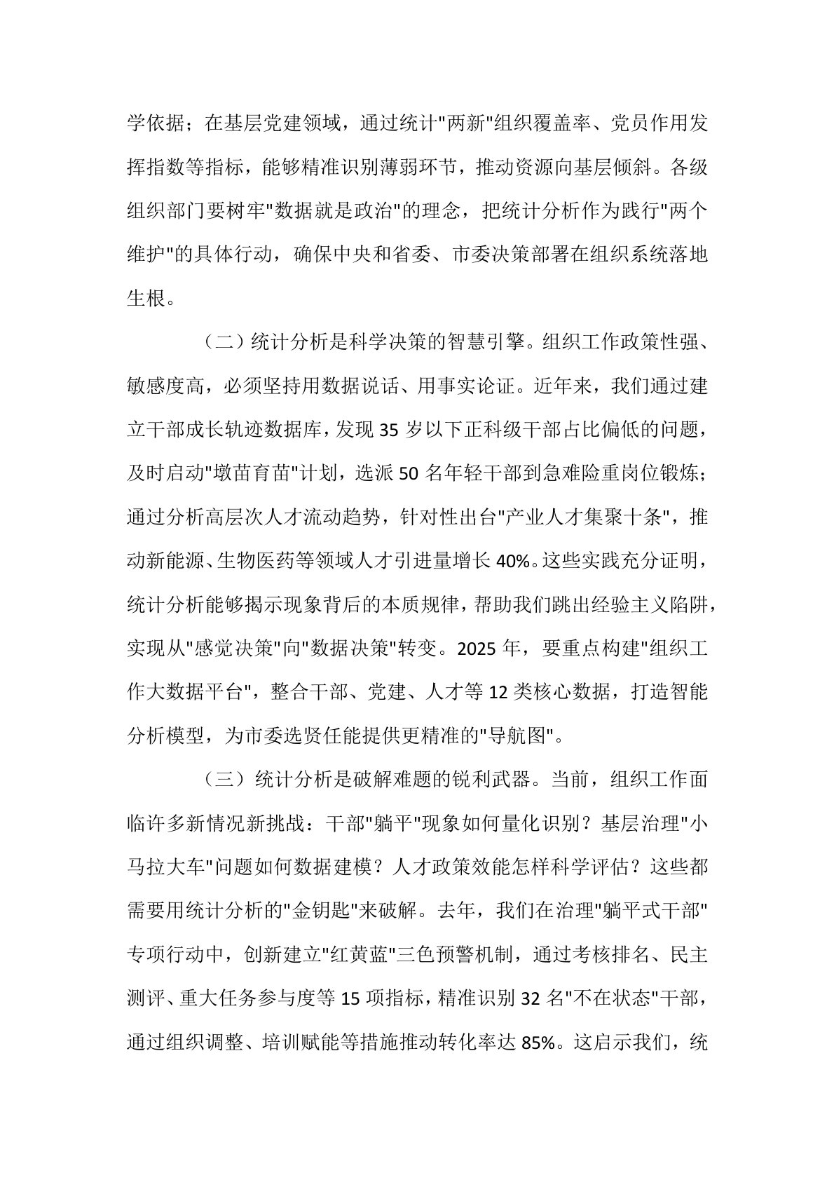 在2025年全市组织系统统计分析工作部署培训会上的讲话同志们:今天,我们召开全市组织系统统计分析工作部署培训会,主要任务是深入学习贯彻党的二十大和二十届三中全会精神,全面落实全国、全省组织部长会议部署要求,系统总结2024年工作成效,分析研判当前形势任务,部署2025年重点工作,并开展专题业务培训。刚才,几位同志围绕干部队伍建设、基层党建、人才工作等领域的统计分析作了交流发言,思路清晰、措施务实,值得相互借鉴。下面,我讲三个方面意见。一、提高政治站位,充分认识新时代统计分析工作的重大意义统计分析是组织工作的"晴雨表""指挥棒",是服务科学决策、推动工作创新的重要基础。面对新时代新征程党的建设新...