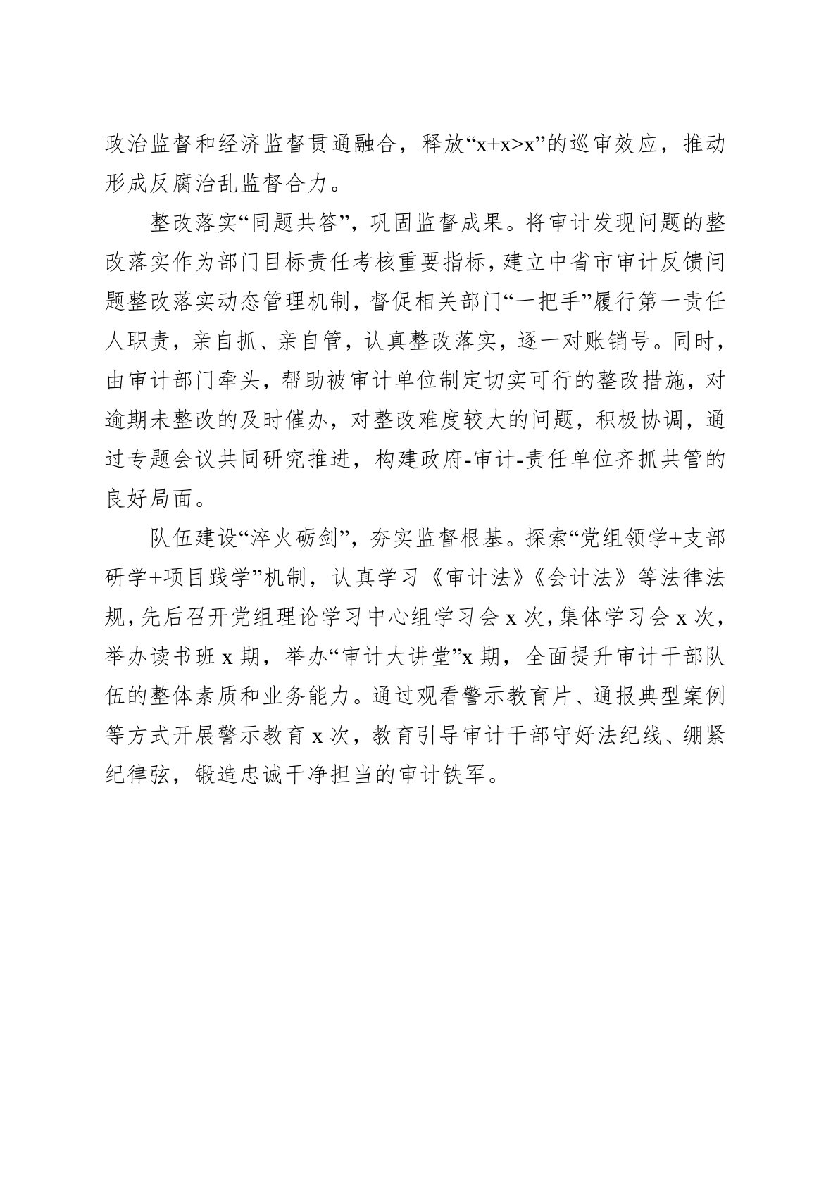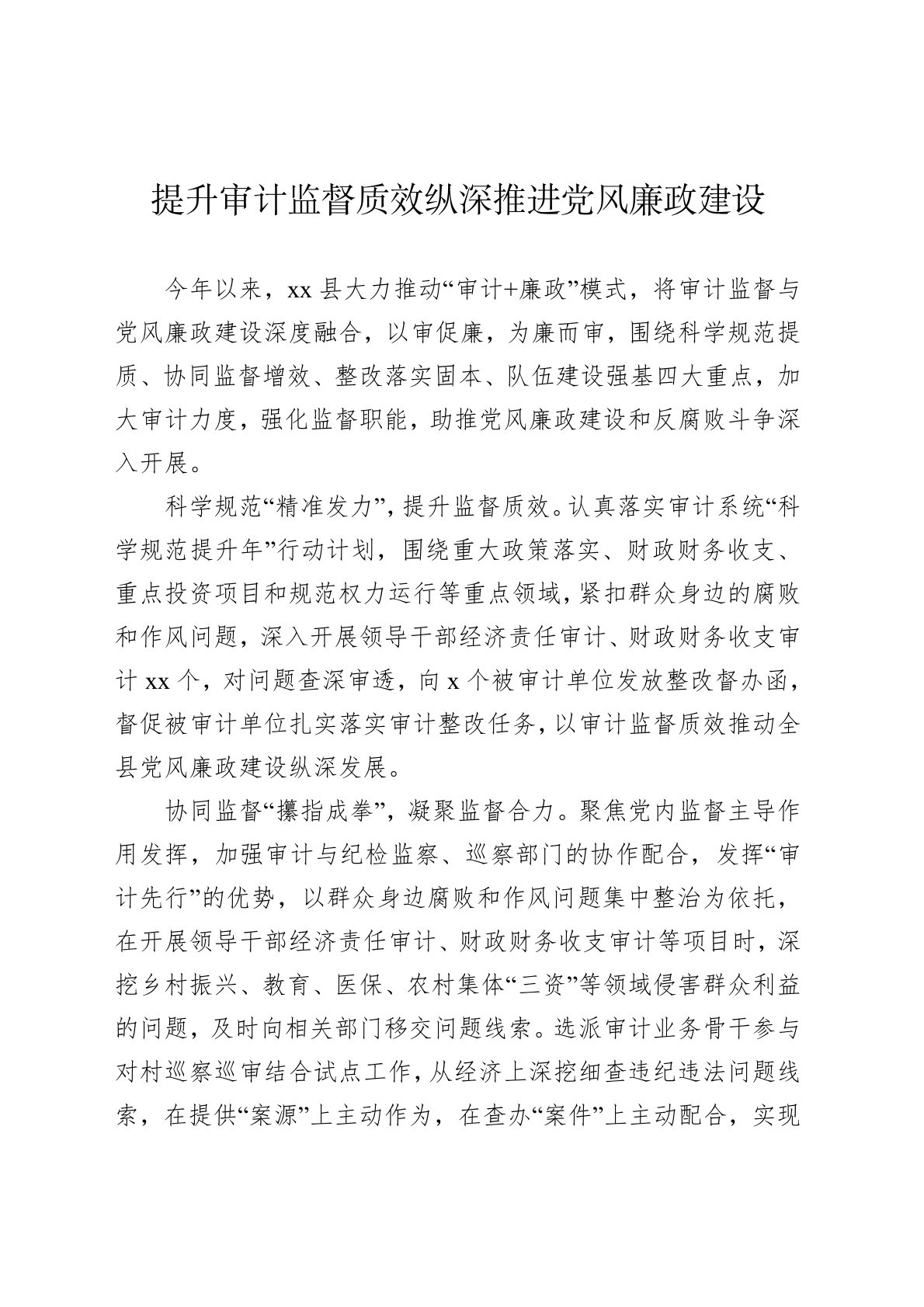 今年以来,xx县大力推动“审计+廉政”模式,将审计监督与党风廉政建设深度融合,以审促廉,为廉而审,围绕科学规范提质、协同监督增效、整改落实固本、队伍建设强基四大重点,加大审计力度,强化监督职能,助推党风廉政建设和反腐败斗争深入开展。科学规范“精准发力”,提升监督质效。认真落实审计系统“科学规范提升年”行动计划,围绕重大政策落实、财政财务收支、重点投资项目和规范权力运行等重点领域,紧扣群众身边的腐败和作风问题,深入开展领导干部经济责任审计、财政财务收支审计xx个,对问题查深审透,向x个被审计单位发放整改督办函,督促被审计单位扎实落实审计整改任务,以审计监督质效推动全县党风廉政建设纵深发展。协同监...