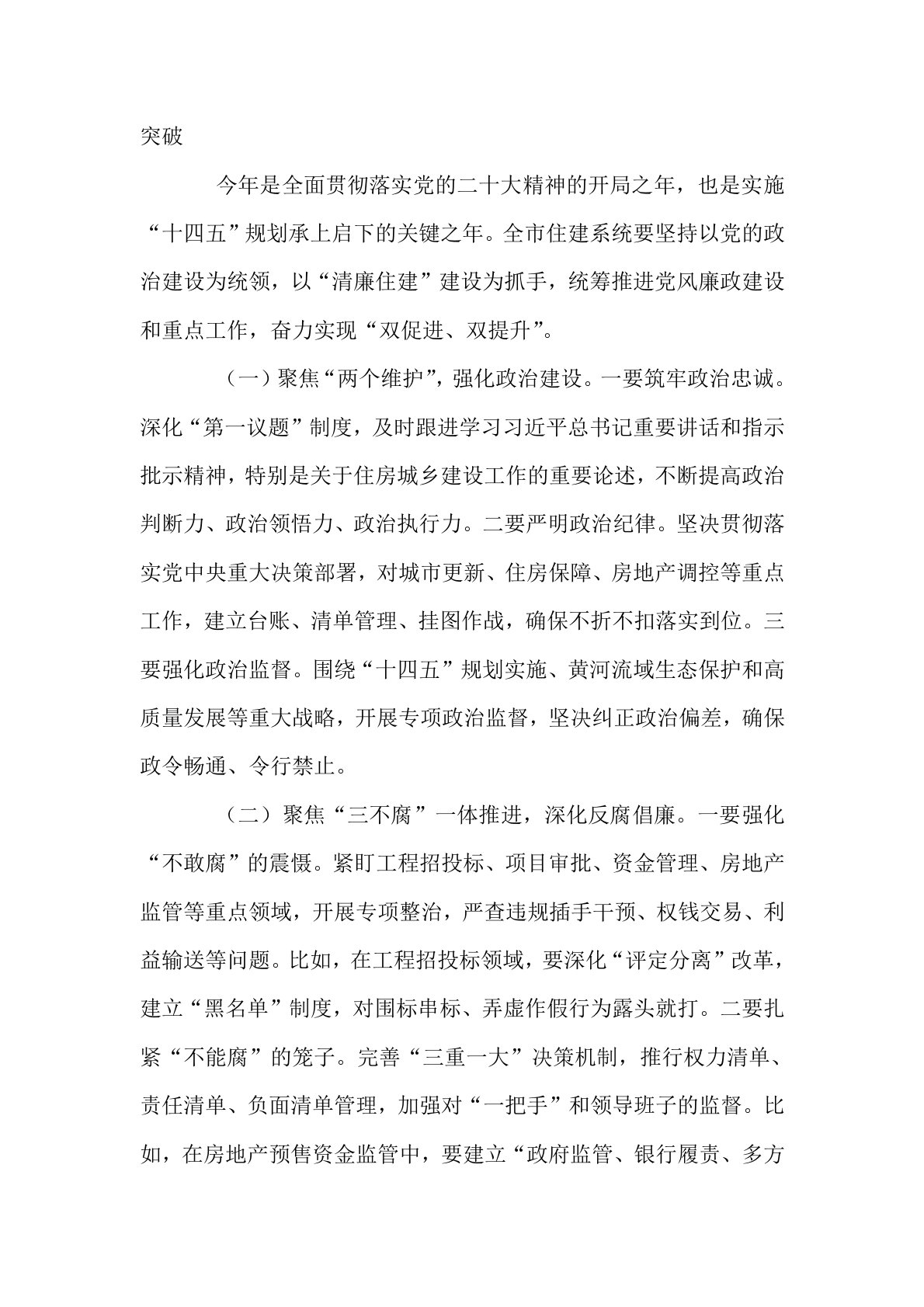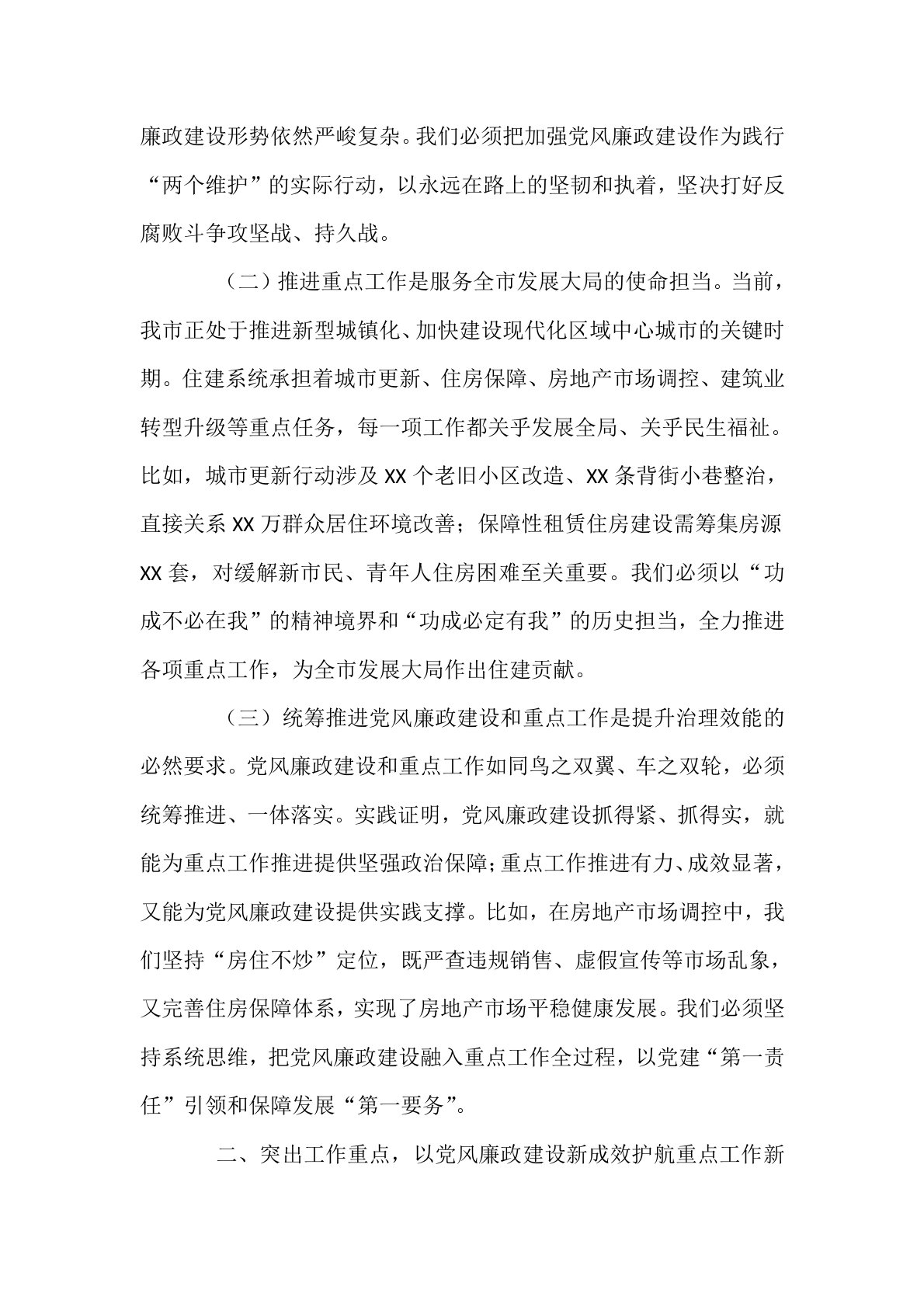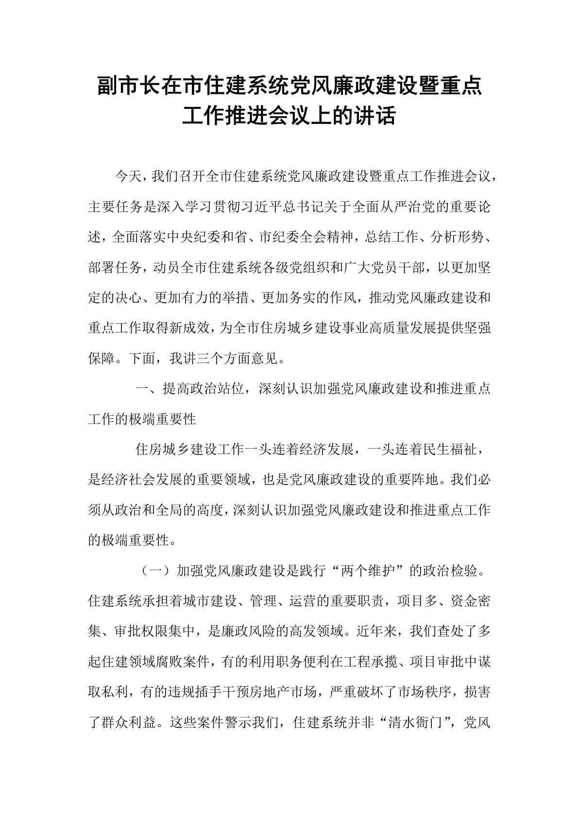 副市长在市住建系统党风廉政建设暨重点工作推进会议上的讲话今天,我们召开全市住建系统党风廉政建设暨重点工作推进会议,主要任务是深入学习贯彻习近平总书记关于全面从严治党的重要论述,全面落实中央纪委和省、市纪委全会精神,总结工作、分析形势、部署任务,动员全市住建系统各级党组织和广大党员干部,以更加坚定的决心、更加有力的举措、更加务实的作风,推动党风廉政建设和重点工作取得新成效,为全市住房城乡建设事业高质量发展提供坚强保障。下面,我讲三个方面意见。一、提高政治站位,深刻认识加强党风廉政建设和推进重点工作的极端重要性住房城乡建设工作一头连着经济发展,一头连着民生福祉,是经济社会发展的重要领域,也是党风廉...
