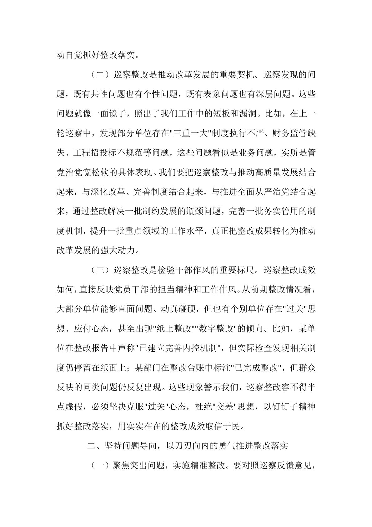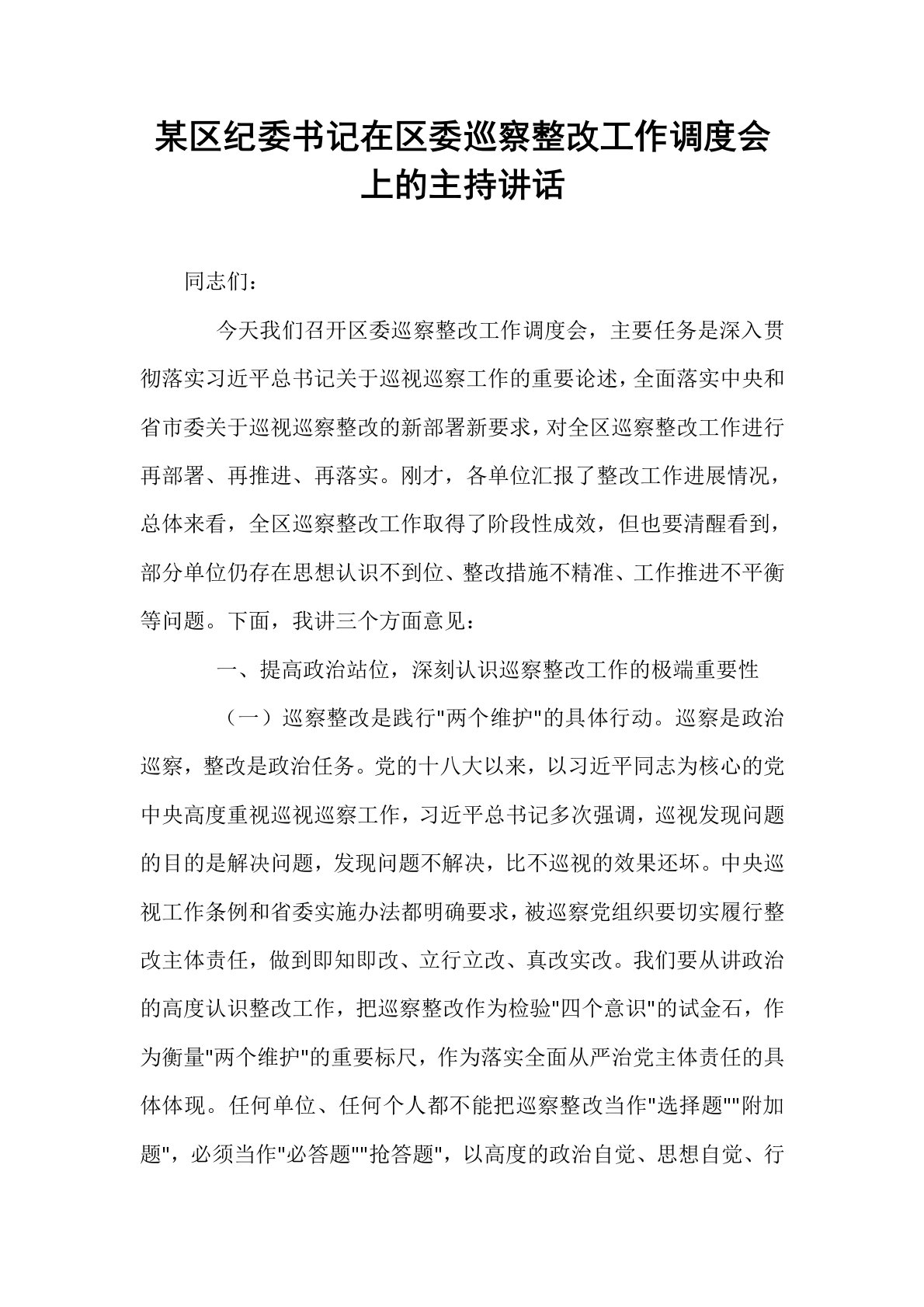 某区纪委书记在区委巡察整改工作调度会上的主持讲话