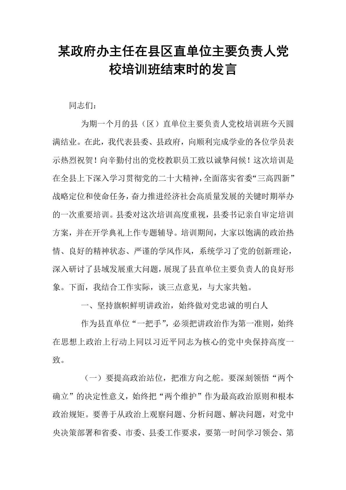 某政府办主任在县区直单位主要负责人党校培训班结束时的发言