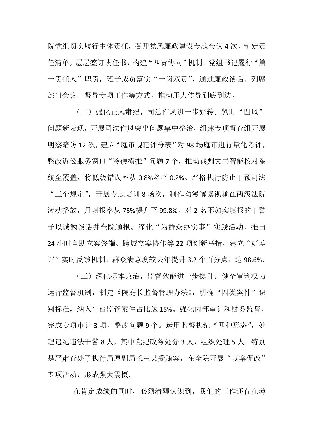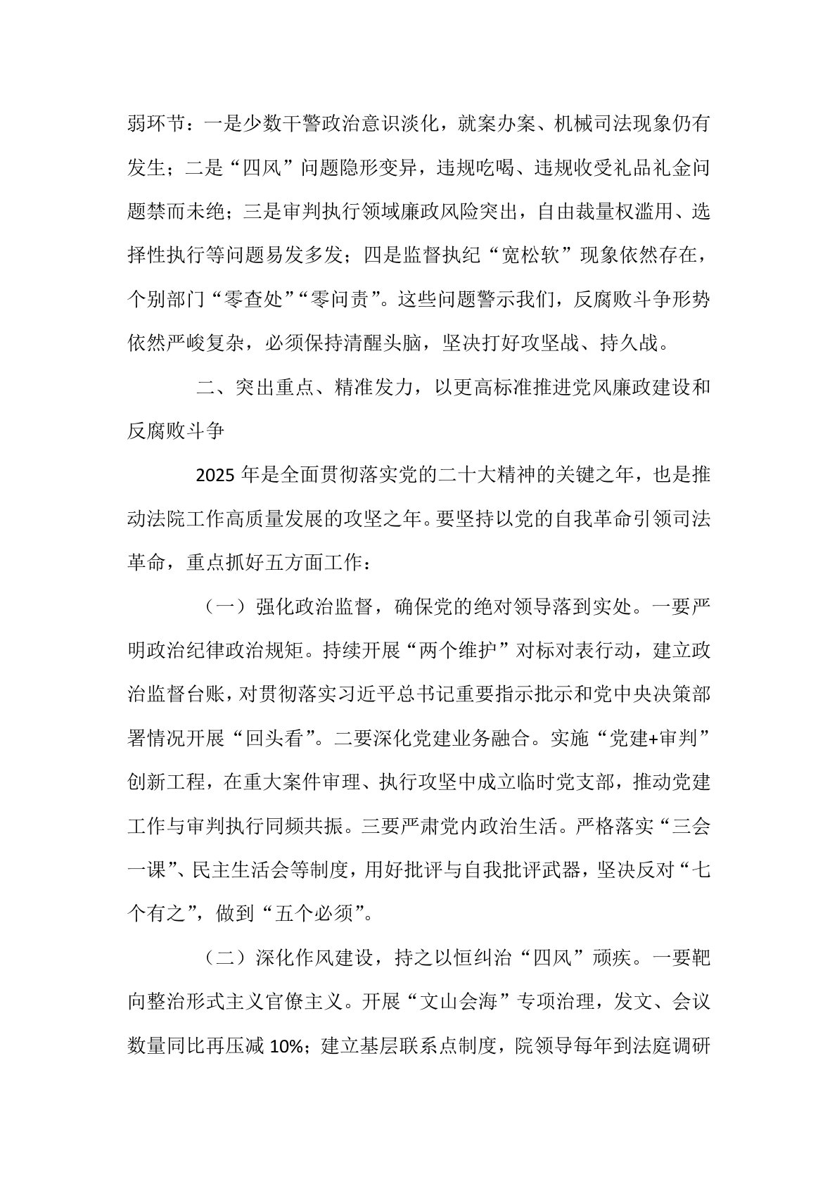 区法院院长在2025年区法院党风廉政建设和反腐败工作会议暨警示教育大会上的讲话同志们:今天,我们召开全区法院党风廉政建设和反腐败工作会议暨警示教育大会,主要任务是:以习近平新时代中国特色社会主义思想为指导,深入贯彻党的二十大和二十届中央纪委四次全会精神,全面落实最高人民法院、省市委关于党风廉政建设和反腐败工作的决策部署,总结2024年工作,分析当前形势,部署2025年任务,并以典型案例为镜鉴,开展警示教育,推动全面从严治党、从严治院向纵深发展。下面,我讲三方面意见。一、肯定成绩、正视问题,切实增强党风廉政建设和反腐败工作的责任感紧迫感过去一年,全区法院坚持以党的政治建设为统领,坚决扛起全面从严...