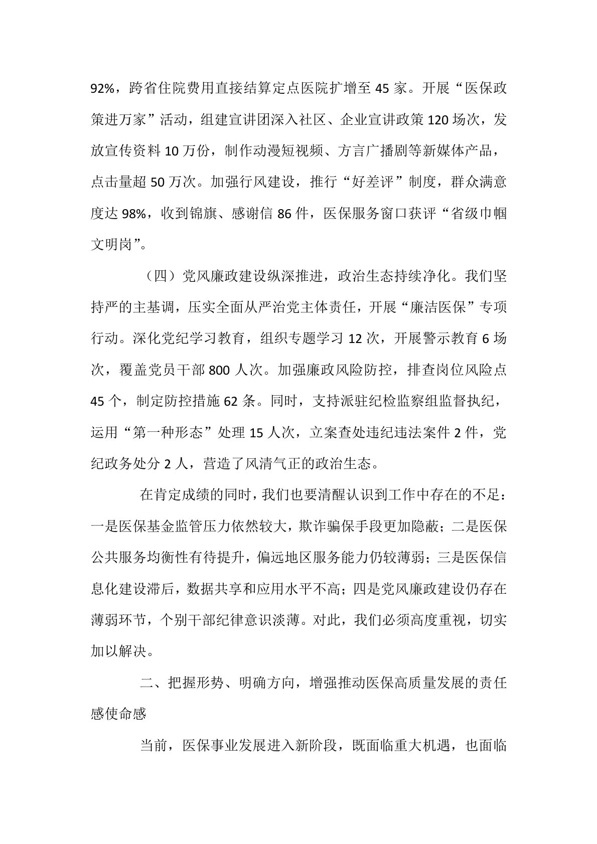 区医保局党组书记在2025年全区医疗保障暨党风廉政建设工作会议上的讲话今天,我们召开2025年全区医疗保障暨党风廉政建设工作会议,主要任务是深入学习贯彻党的二十大精神,全面落实中央和省市医保工作会议部署,总结2024年工作,分析当前形势,安排2025年重点任务。过去一年,在区委区政府的坚强领导下,全区医保系统坚持以人民健康为中心,统筹推进医保改革、管理、服务各项工作,党风廉政建设持续深化,为保障和改善民生作出了积极贡献。但也要清醒看到,医保领域仍面临诸多挑战,我们必须以更加昂扬的斗志、更加务实的作风,推动全区医保事业高质量发展。下面,我讲三个方面意见。一、肯定成绩、正视不足,坚定医保事业发展的...
