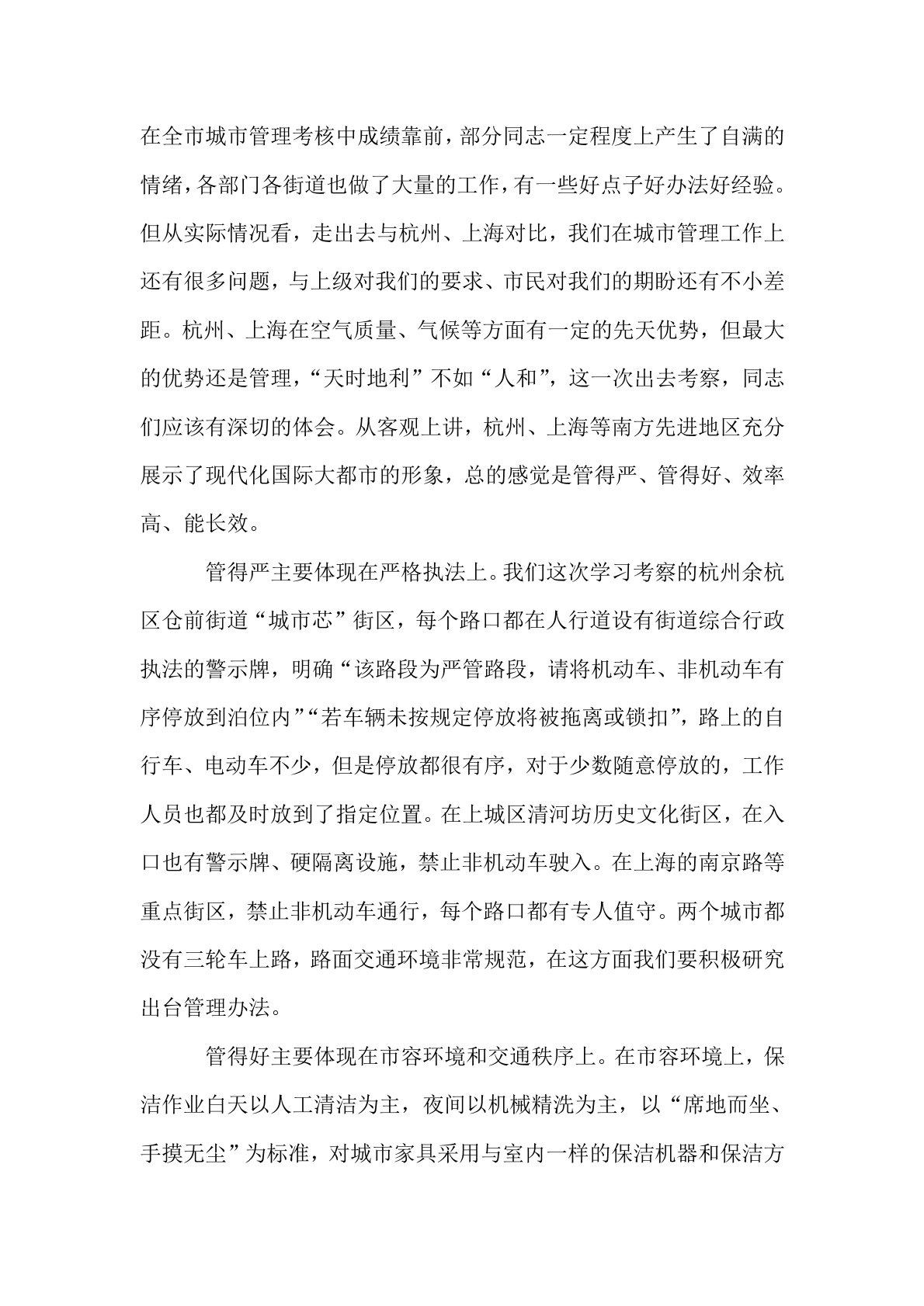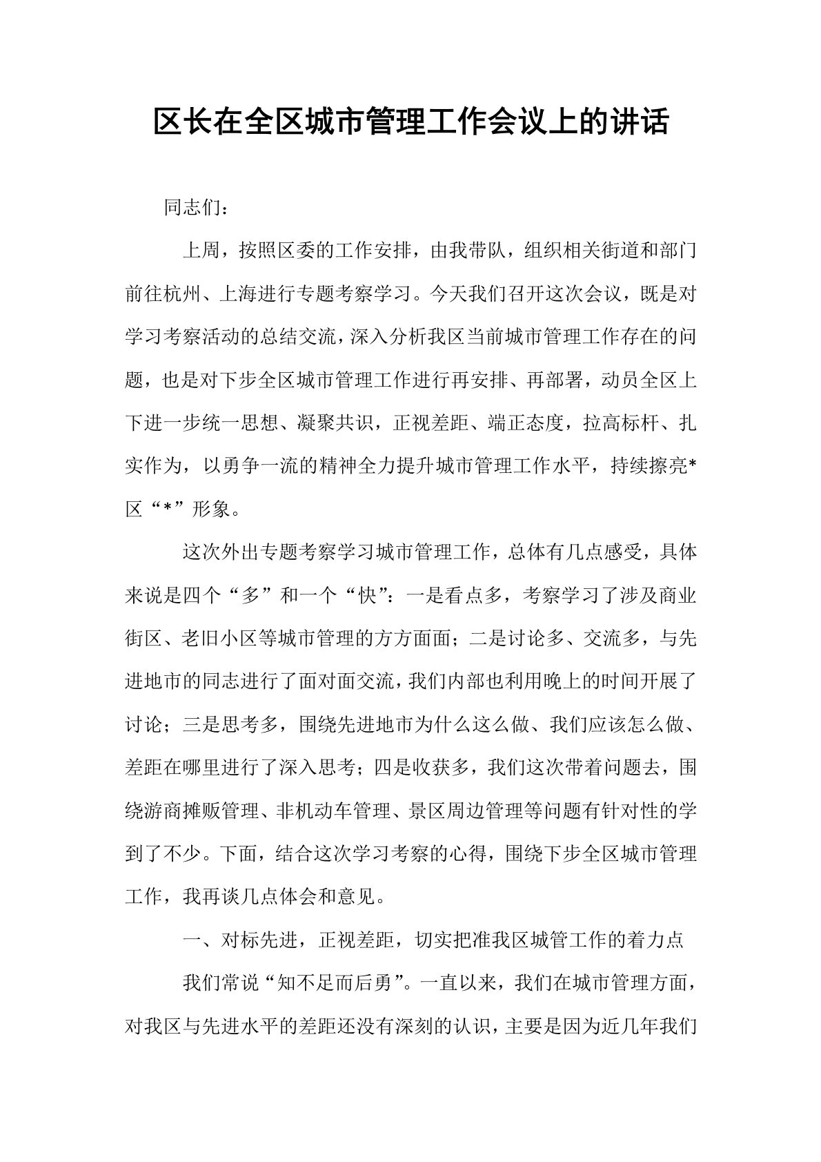 区长在全区城市管理工作会议上的讲话同志们:上周,按照区委的工作安排,由我带队,组织相关街道和部门前往杭州、上海进行专题考察学习。今天我们召开这次会议,既是对学习考察活动的总结交流,深入分析我区当前城市管理工作存在的问题,也是对下步全区城市管理工作进行再安排、再部署,动员全区上下进一步统一思想、凝聚共识,正视差距、端正态度,拉高标杆、扎实作为,以勇争一流的精神全力提升城市管理工作水平,持续擦亮*区“*”形象。这次外出专题考察学习城市管理工作,总体有几点感受,具体来说是四个“多”和一个“快”:一是看点多,考察学习了涉及商业街区、老旧小区等城市管理的方方面面;二是讨论多、交流多,与先进地市的同志进行...