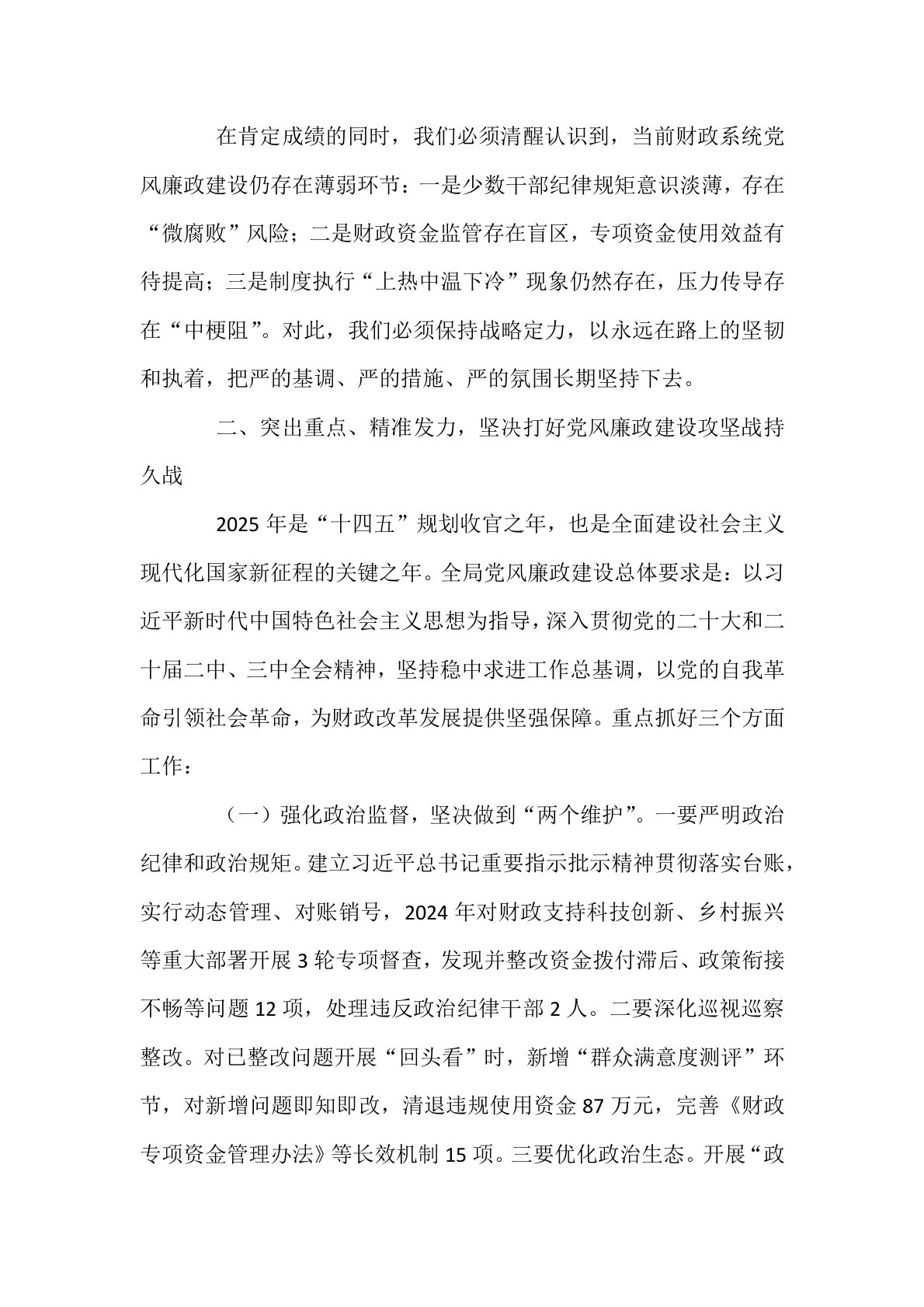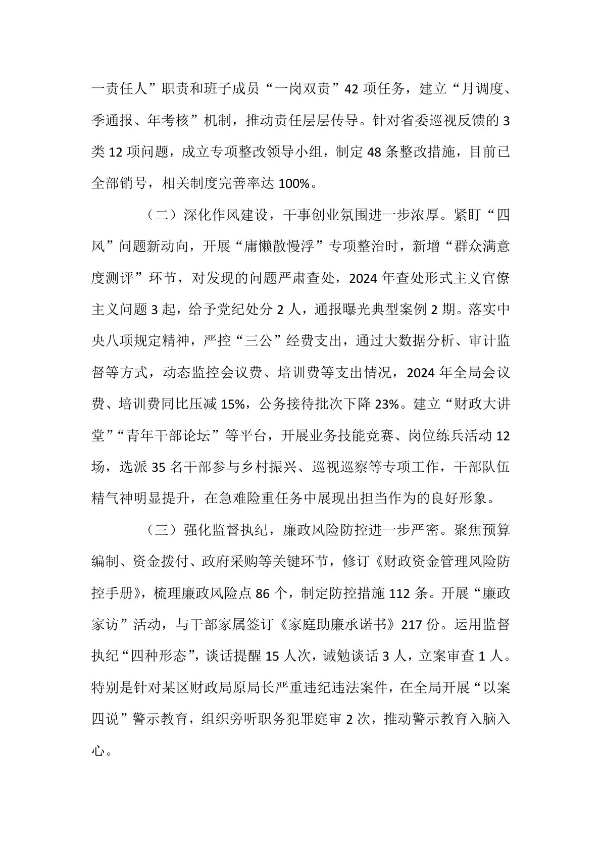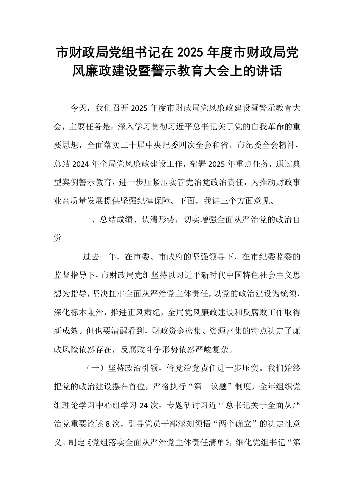 市财政局党组书记在2025年度市财政局党风廉政建设暨警示教育大会上的讲话今天,我们召开2025年度市财政局党风廉政建设暨警示教育大会,主要任务是:深入学习贯彻习近平总书记关于党的自我革命的重要思想,全面落实二十届中央纪委四次全会和省、市纪委全会精神,总结2024年全局党风廉政建设工作,部署2025年重点任务,通过典型案例警示教育,进一步压紧压实管党治党政治责任,为推动财政事业高质量发展提供坚强纪律保障。下面,我讲三个方面意见。一、总结成绩、认清形势,切实增强全面从严治党的政治自觉过去一年,在市委、市政府的坚强领导下,在市纪委监委的监督指导下,市财政局党组坚持以习近平新时代中国特色社会主义思想为...