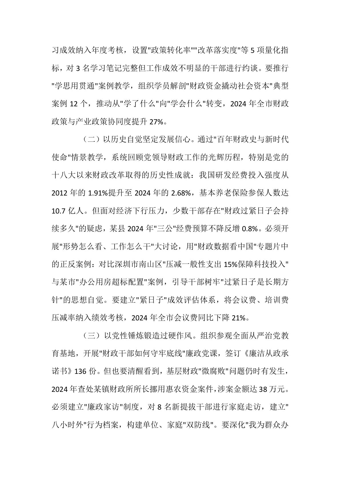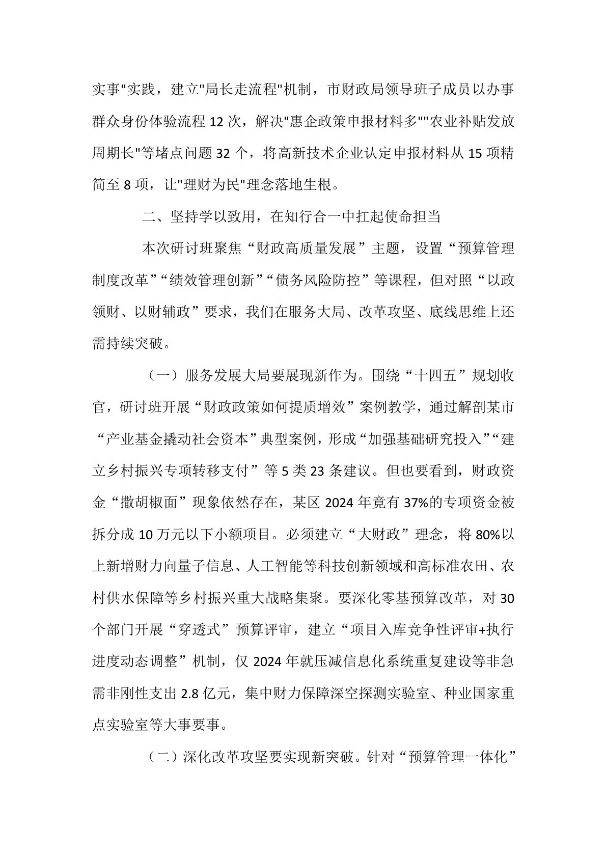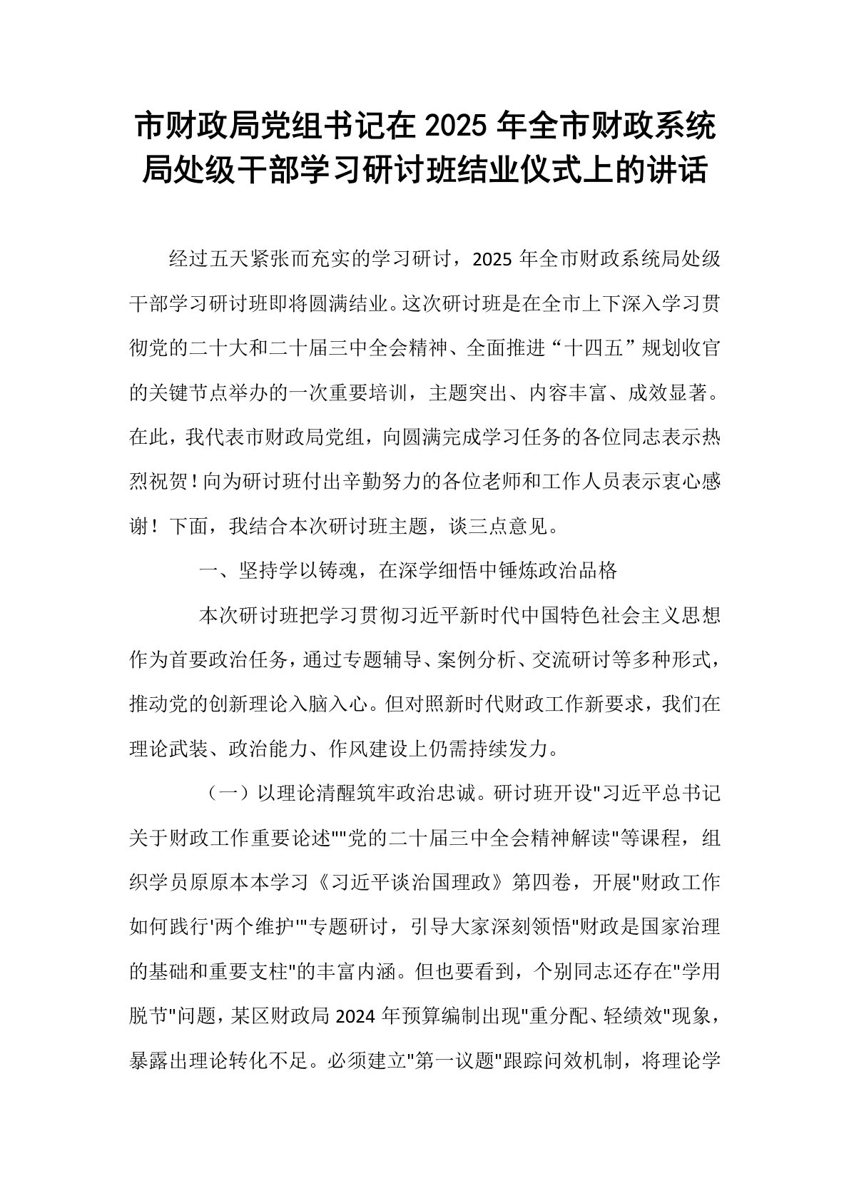 市财政局党组书记在2025年全市财政系统局处级干部学习研讨班结业仪式上的讲话经过五天紧张而充实的学习研讨,2025年全市财政系统局处级干部学习研讨班即将圆满结业。这次研讨班是在全市上下深入学习贯彻党的二十大和二十届三中全会精神、全面推进“十四五”规划收官的关键节点举办的一次重要培训,主题突出、内容丰富、成效显著。在此,我代表市财政局党组,向圆满完成学习任务的各位同志表示热烈祝贺!向为研讨班付出辛勤努力的各位老师和工作人员表示衷心感谢!下面,我结合本次研讨班主题,谈三点意见。一、坚持学以铸魂,在深学细悟中锤炼政治品格本次研讨班把学习贯彻习近平新时代中国特色社会主义思想作为首要政治任务,通过专题辅...