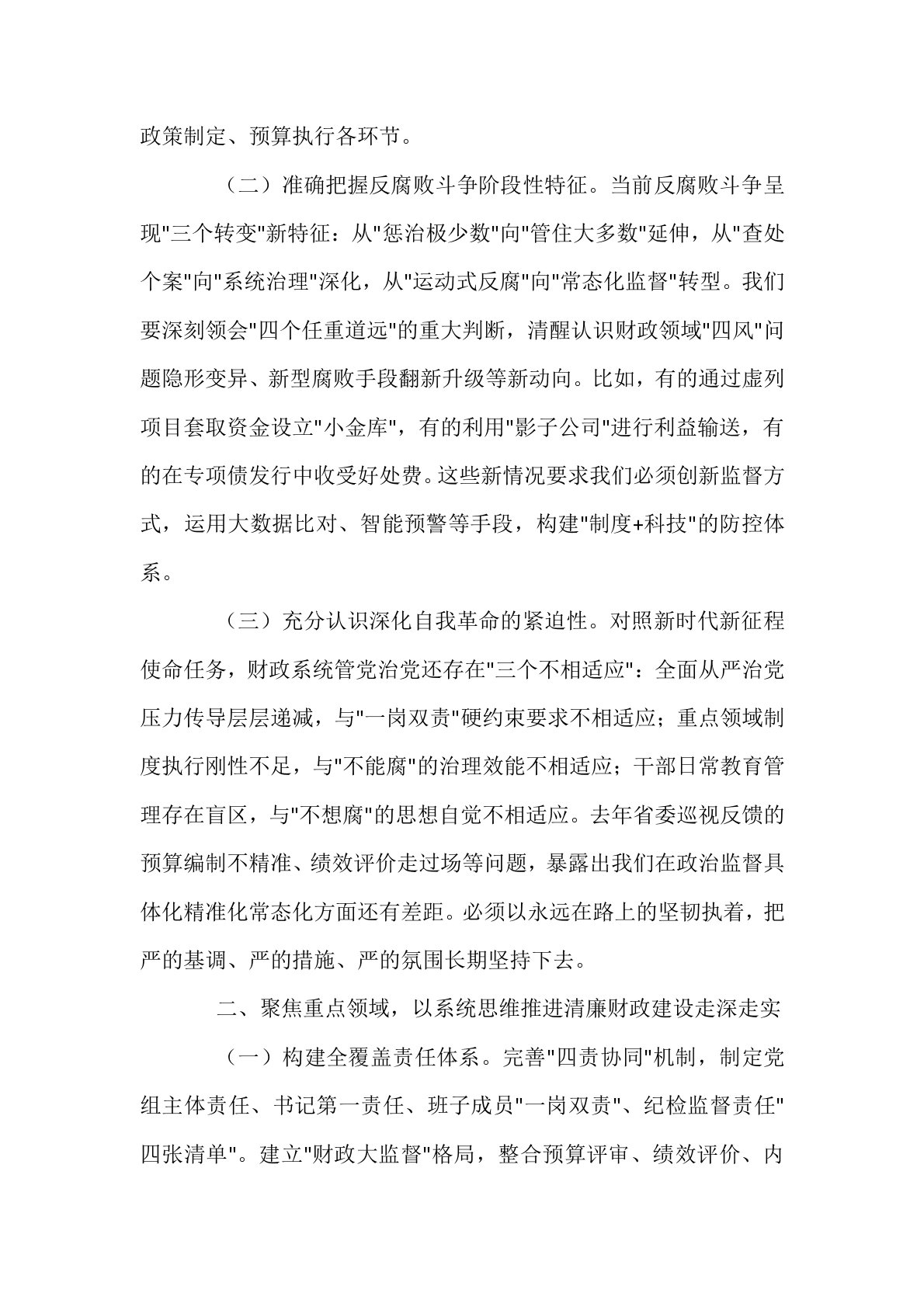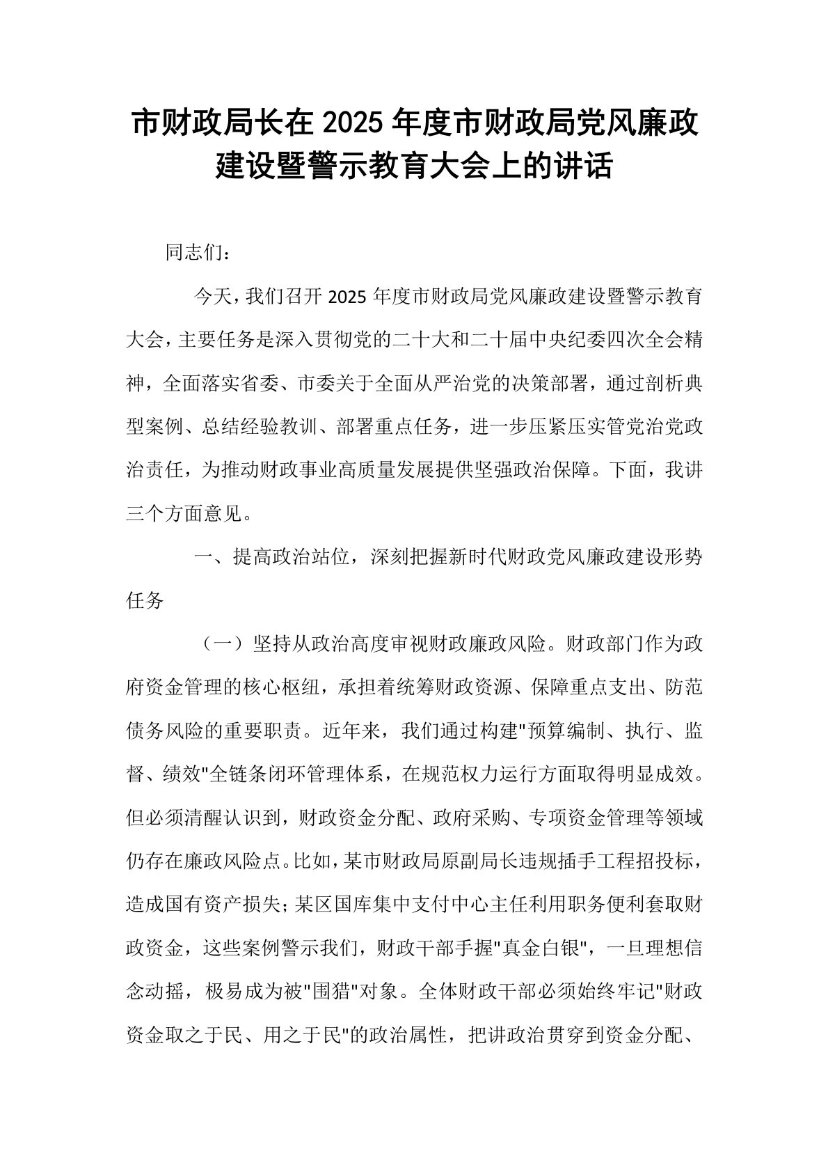 市财政局长在2025年度市财政局党风廉政建设暨警示教育大会上的讲话同志们:今天,我们召开2025年度市财政局党风廉政建设暨警示教育大会,主要任务是深入贯彻党的二十大和二十届中央纪委四次全会精神,全面落实省委、市委关于全面从严治党的决策部署,通过剖析典型案例、总结经验教训、部署重点任务,进一步压紧压实管党治党政治责任,为推动财政事业高质量发展提供坚强政治保障。下面,我讲三个方面意见。一、提高政治站位,深刻把握新时代财政党风廉政建设形势任务(一)坚持从政治高度审视财政廉政风险。财政部门作为政府资金管理的核心枢纽,承担着统筹财政资源、保障重点支出、防范债务风险的重要职责。近年来,我们通过构建"预算编...