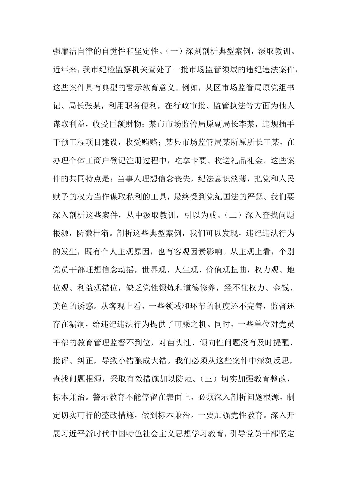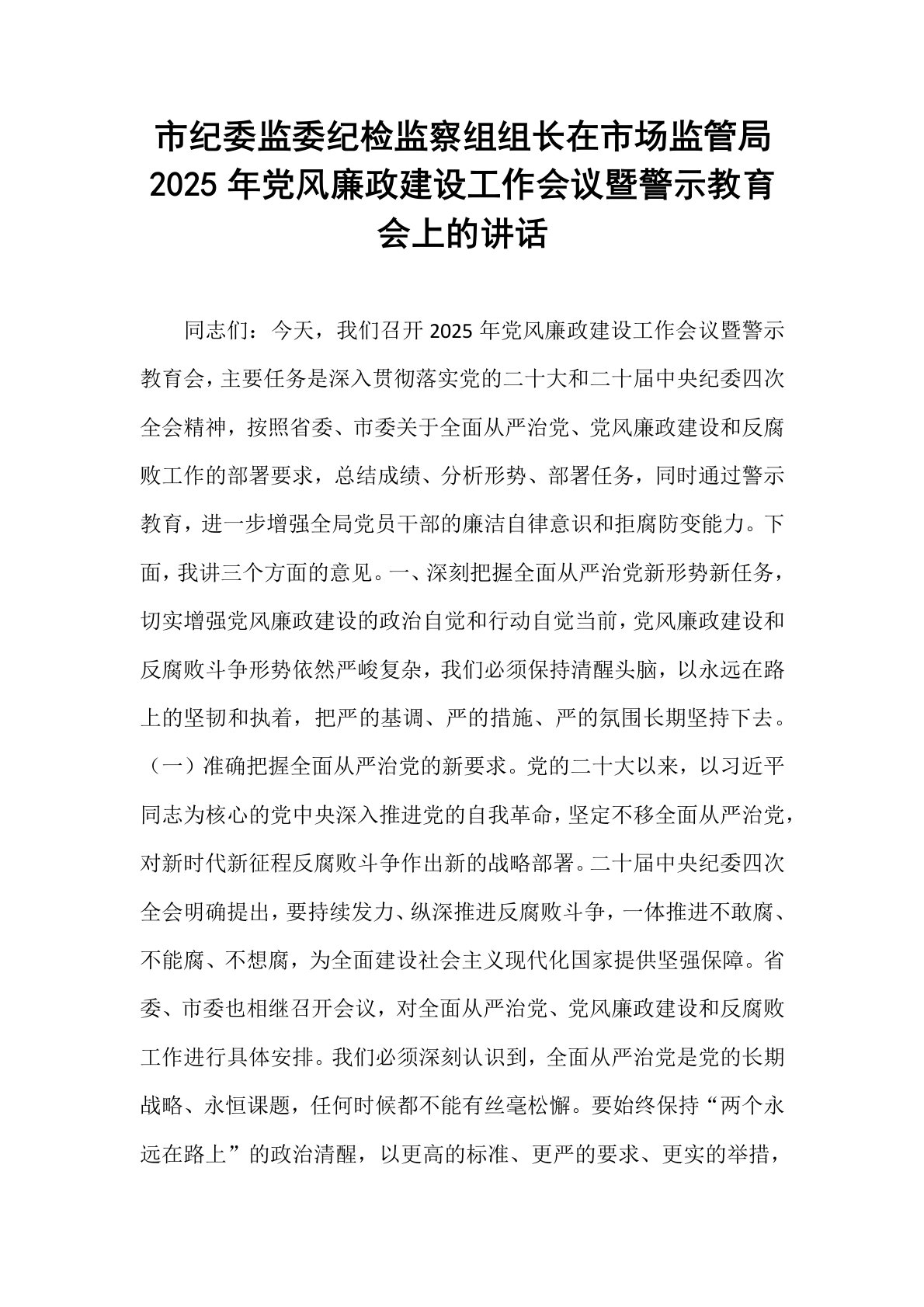 市纪委监委纪检监察组组长在市场监管局2025年党风廉政建设工作会议暨警示教育会上的讲话同志们:今天,我们召开2025年党风廉政建设工作会议暨警示教育会,主要任务是深入贯彻落实党的二十大和二十届中央纪委四次全会精神,按照省委、市委关于全面从严治党、党风廉政建设和反腐败工作的部署要求,总结成绩、分析形势、部署任务,同时通过警示教育,进一步增强全局党员干部的廉洁自律意识和拒腐防变能力。下面,我讲三个方面的意见。一、深刻把握全面从严治党新形势新任务,切实增强党风廉政建设的政治自觉和行动自觉当前,党风廉政建设和反腐败斗争形势依然严峻复杂,我们必须保持清醒头脑,以永远在路上的坚韧和执着,把严的基调、严的措...