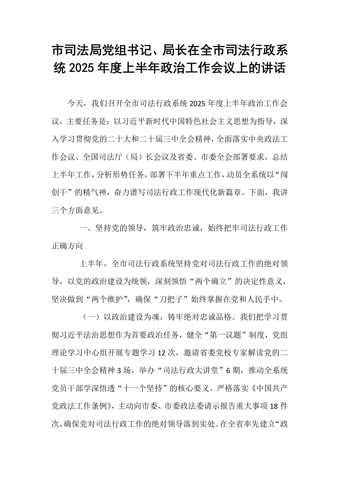 市司法局党组书记、局长在全市司法行政系统2025年度上半年政治工作会议上的讲话今天,我们召开全市司法行政系统2025年度上半年政治工作会议,主要任务是:以习近平新时代中国特色社会主义思想为指导,深入学习贯彻党的二十大和二十届三中全会精神,全面落实中央政法工作会议、全国司法厅(局)长会议及省委、市委全会部署要求,总结上半年工作,分析形势任务,部署下半年重点工作,动员全系统以“闯创干”的精气神,奋力谱写司法行政工作现代化新篇章。下面,我讲三个方面意见。一、坚持党的领导,筑牢政治忠诚,始终把牢司法行政工作正确方向上半年,全市司法行政系统坚持党对司法行政工作的绝对领导,以党的政治建设为统领,深刻领悟“...