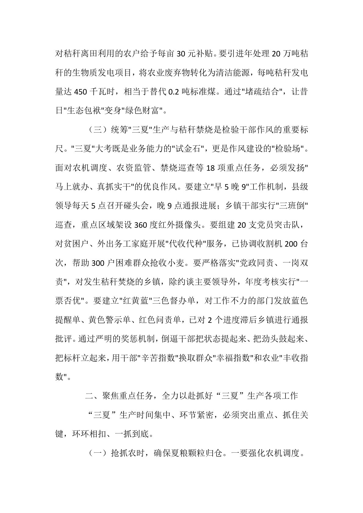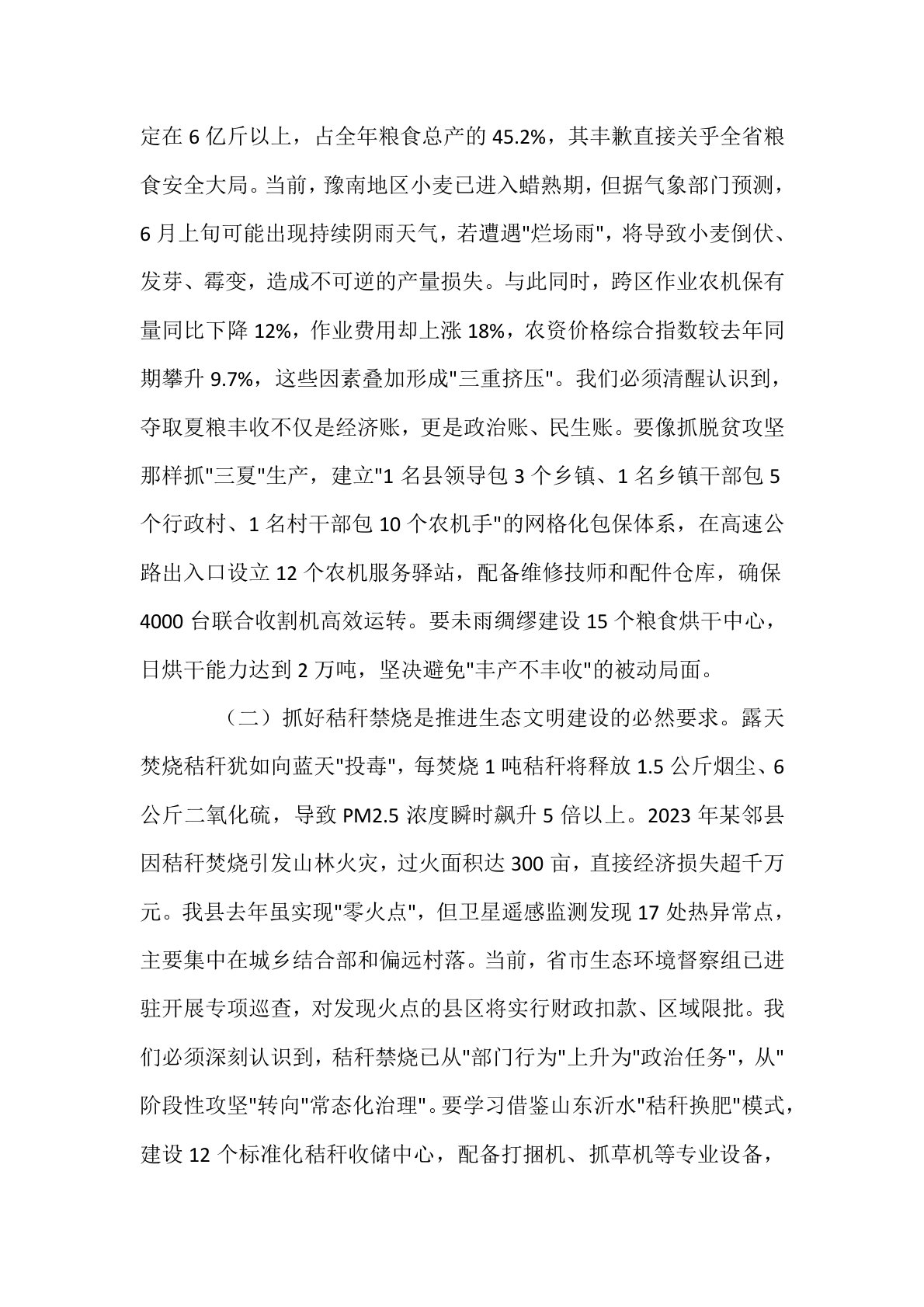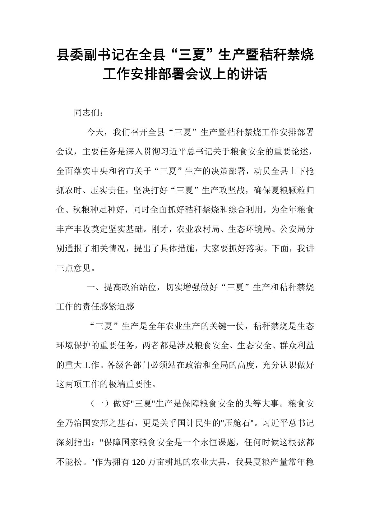 县委副书记在全县“三夏”生产暨秸秆禁烧工作安排部署会议上的讲话同志们:今天,我们召开全县“三夏”生产暨秸秆禁烧工作安排部署会议,主要任务是深入贯彻习近平总书记关于粮食安全的重要论述,全面落实中央和省市关于“三夏”生产的决策部署,动员全县上下抢抓农时、压实责任,坚决打好“三夏”生产攻坚战,确保夏粮颗粒归仓、秋粮种足种好,同时全面抓好秸秆禁烧和综合利用,为全年粮食丰产丰收奠定坚实基础。刚才,农业农村局、生态环境局、公安局分别通报了相关情况,提出了具体措施,大家要抓好落实。下面,我讲三点意见。一、提高政治站位,切实增强做好“三夏”生产和秸秆禁烧工作的责任感紧迫感“三夏”生产是全年农业生产的关键一仗,...