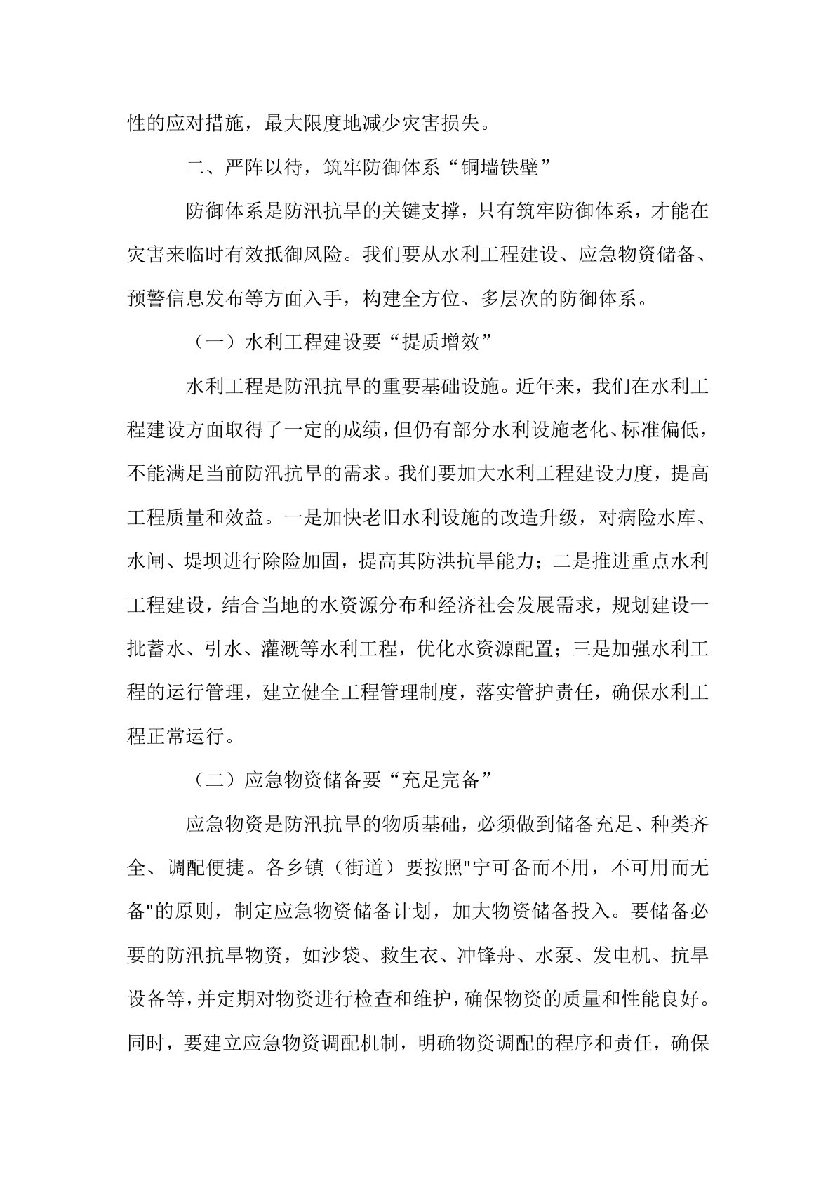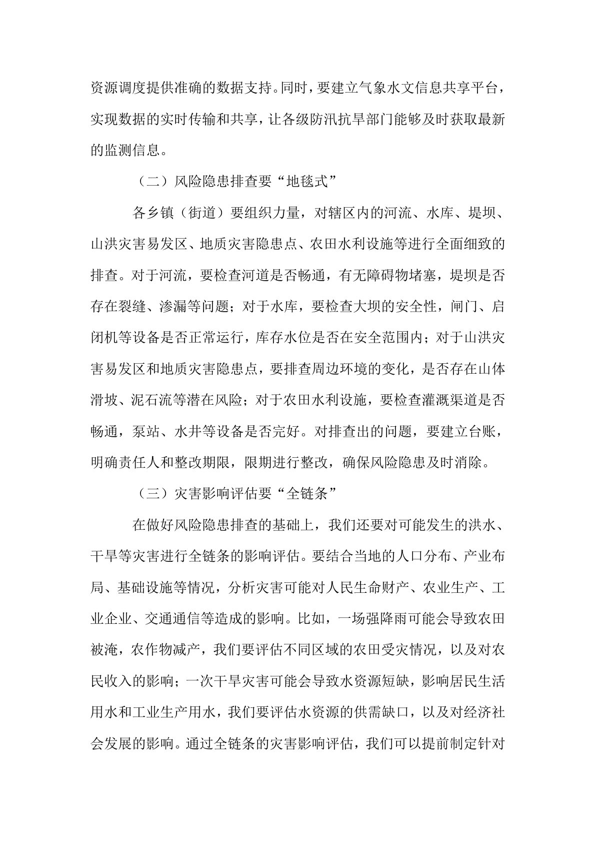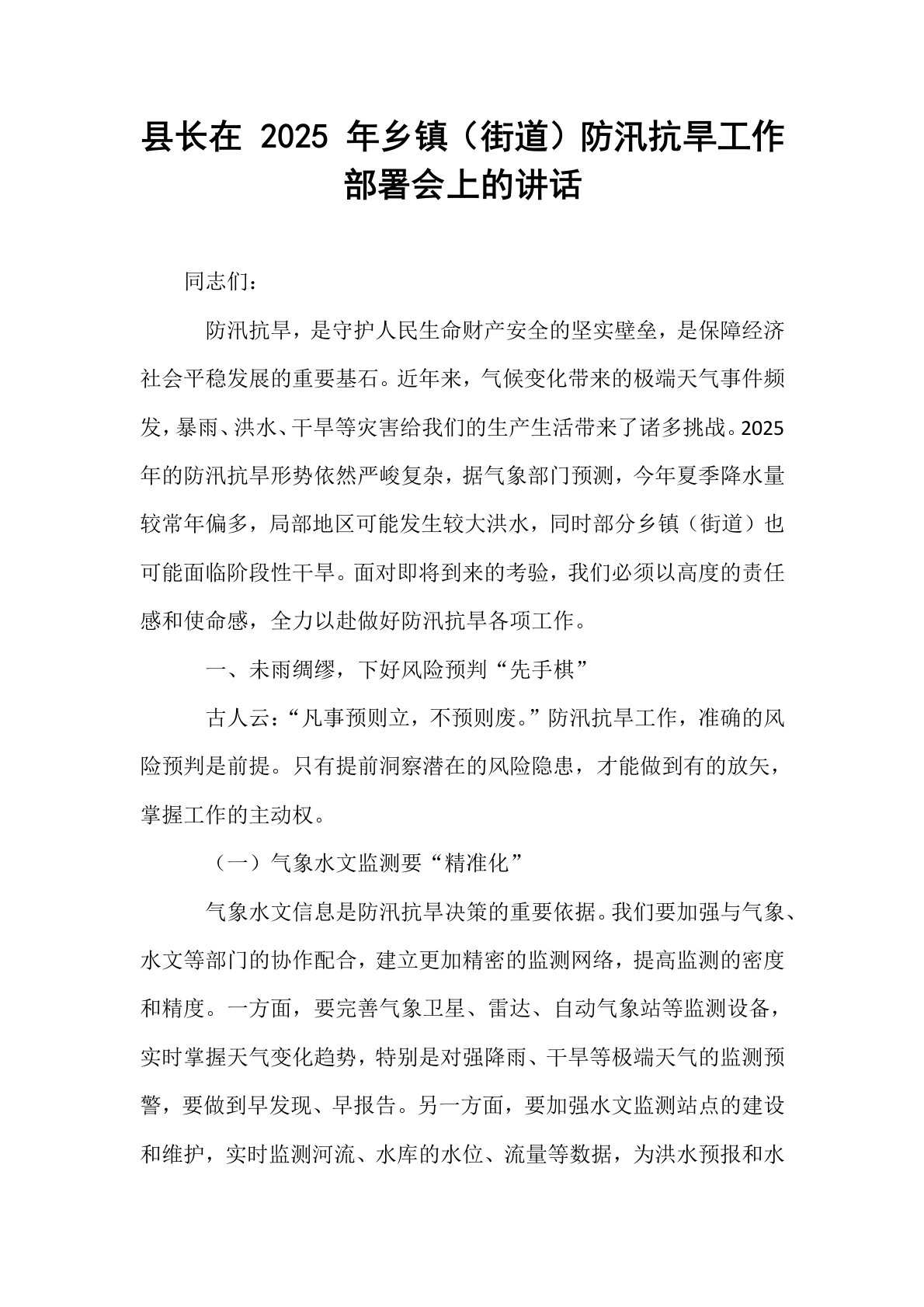 县长在2025年乡镇(街道)防汛抗旱工作部署会上的讲话同志们:防汛抗旱,是守护人民生命财产安全的坚实壁垒,是保障经济社会平稳发展的重要基石。近年来,气候变化带来的极端天气事件频发,暴雨、洪水、干旱等灾害给我们的生产生活带来了诸多挑战。2025年的防汛抗旱形势依然严峻复杂,据气象部门预测,今年夏季降水量较常年偏多,局部地区可能发生较大洪水,同时部分乡镇(街道)也可能面临阶段性干旱。面对即将到来的考验,我们必须以高度的责任感和使命感,全力以赴做好防汛抗旱各项工作。一、未雨绸缪,下好风险预判“先手棋”古人云:“凡事预则立,不预则废。”防汛抗旱工作,准确的风险预判是前提。只有提前洞察潜在的风险隐患,才...