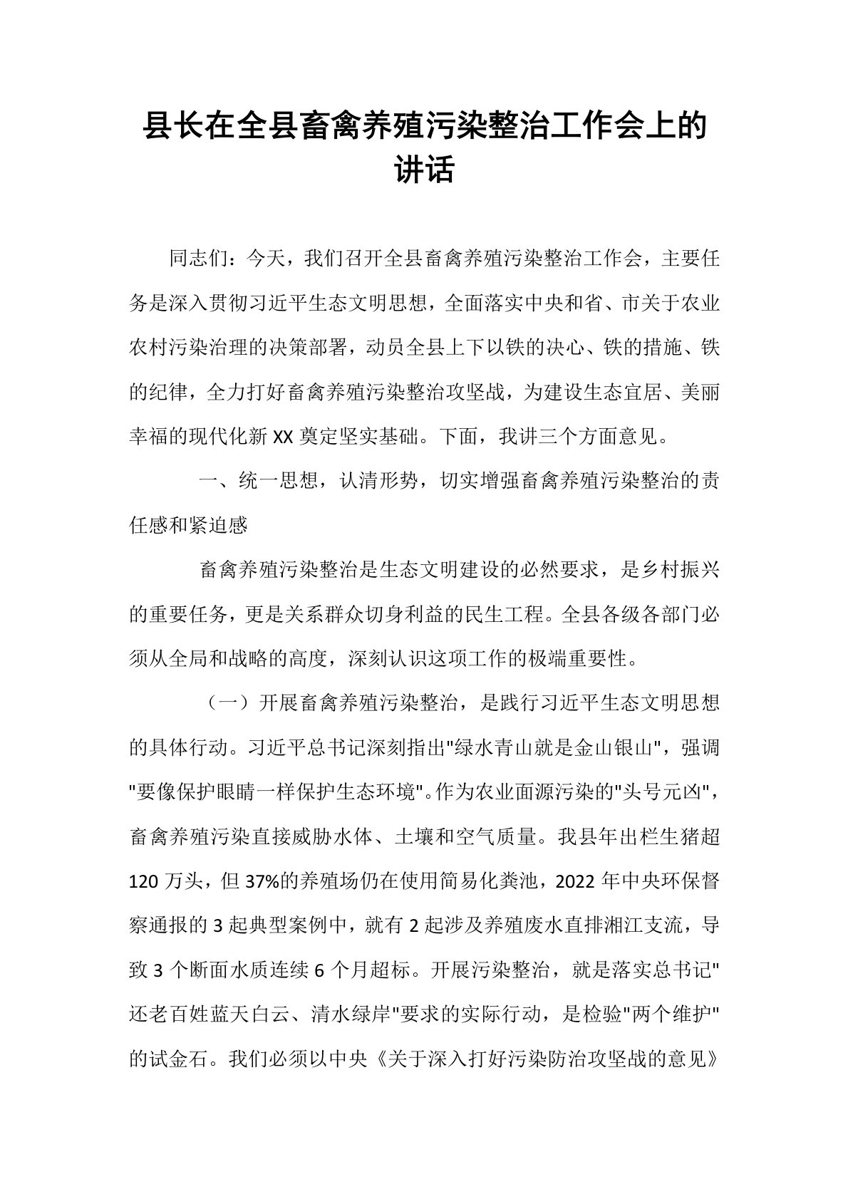 县长在全县畜禽养殖污染整治工作会上的讲话同志们:今天,我们召开全县畜禽养殖污染整治工作会,主要任务是深入贯彻习近平生态文明思想,全面落实中央和省、市关于农业农村污染治理的决策部署,动员全县上下以铁的决心、铁的措施、铁的纪律,全力打好畜禽养殖污染整治攻坚战,为建设生态宜居、美丽幸福的现代化新XX奠定坚实基础。下面,我讲三个方面意见。一、统一思想,认清形势,切实增强畜禽养殖污染整治的责任感和紧迫感畜禽养殖污染整治是生态文明建设的必然要求,是乡村振兴的重要任务,更是关系群众切身利益的民生工程。全县各级各部门必须从全局和战略的高度,深刻认识这项工作的极端重要性。(一)开展畜禽养殖污染整治,是践行习近平...