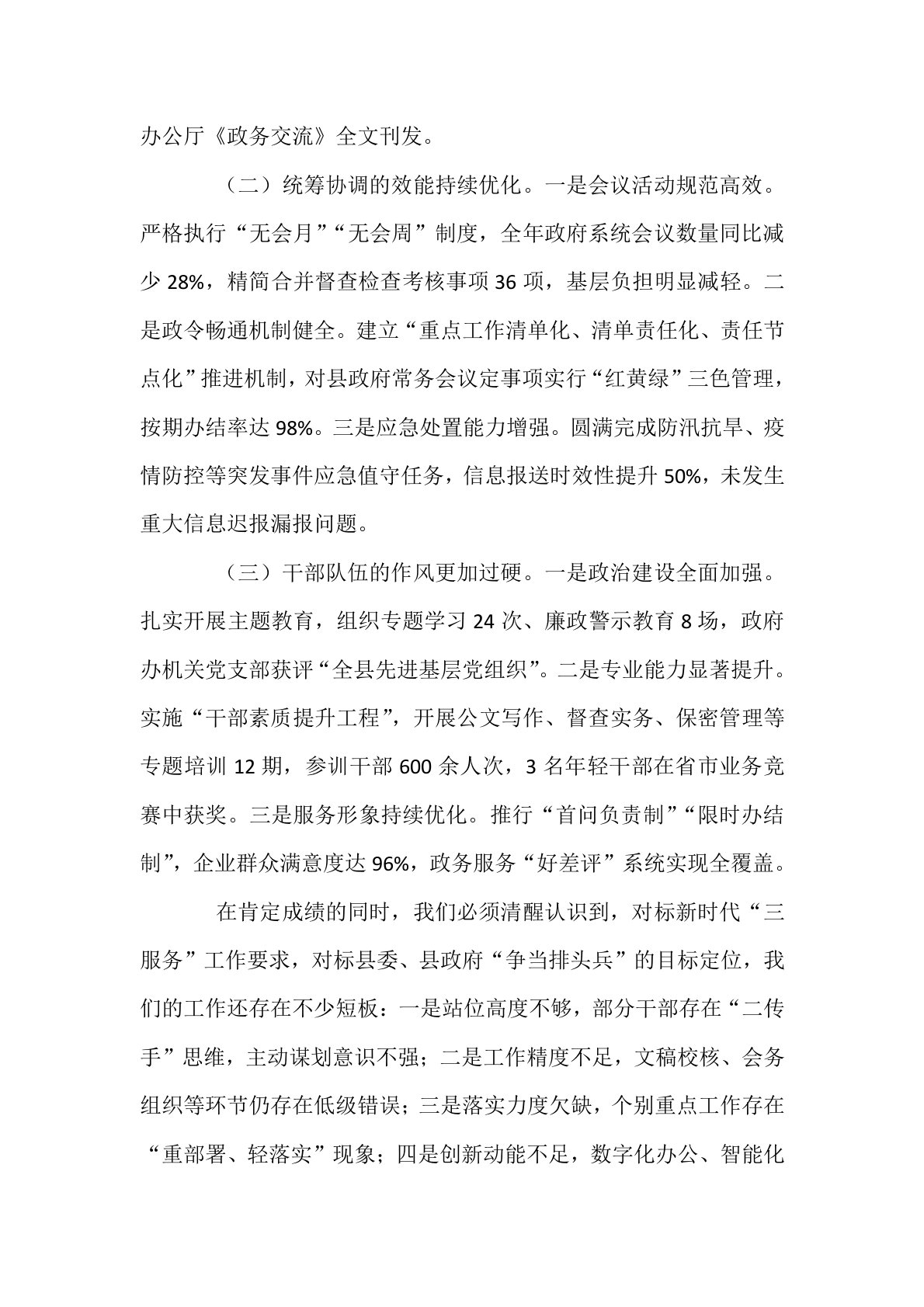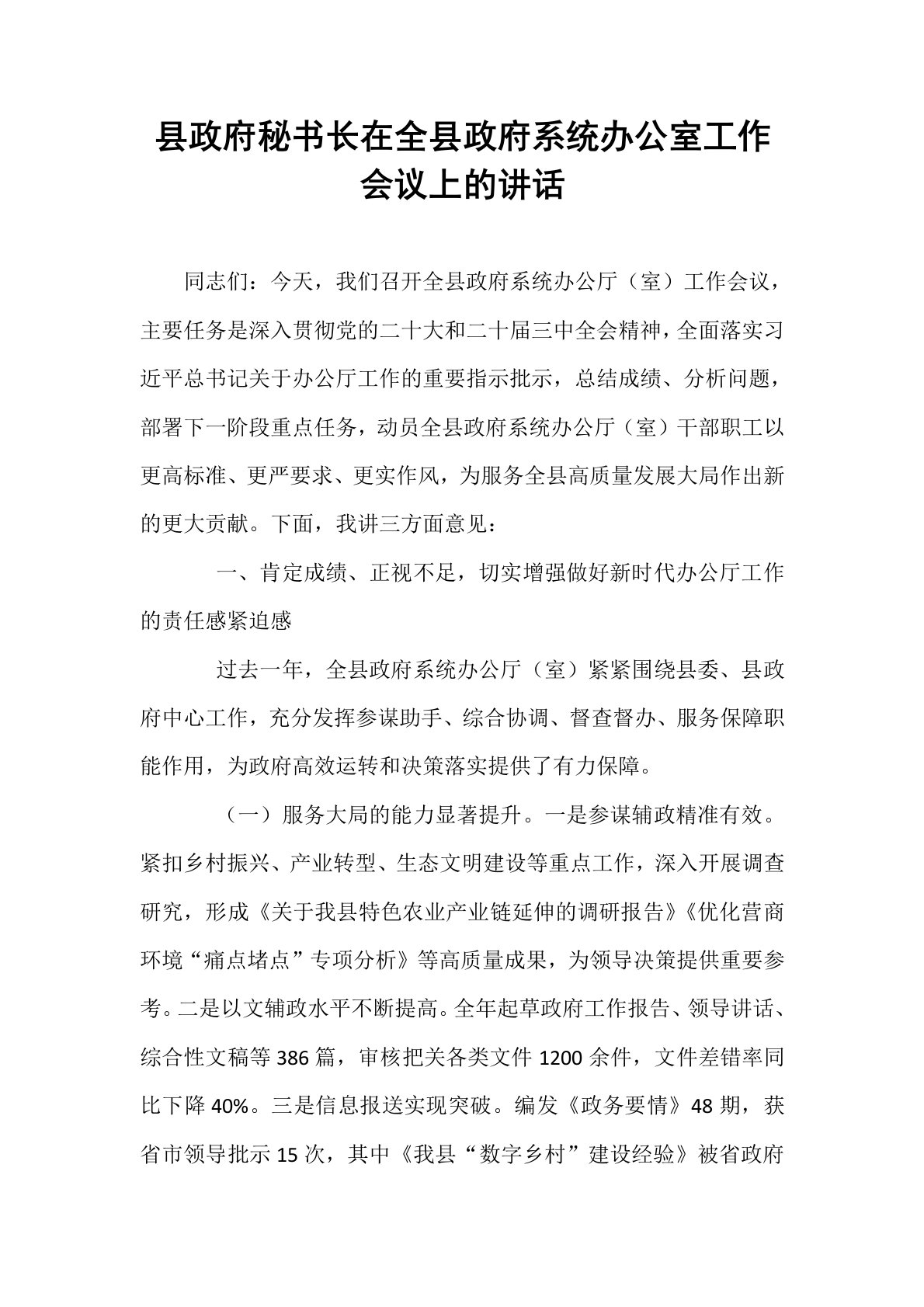 县政府秘书长在全县政府系统办公室工作会议上的讲话同志们:今天,我们召开全县政府系统办公厅(室)工作会议,主要任务是深入贯彻党的二十大和二十届三中全会精神,全面落实习近平总书记关于办公厅工作的重要指示批示,总结成绩、分析问题,部署下一阶段重点任务,动员全县政府系统办公厅(室)干部职工以更高标准、更严要求、更实作风,为服务全县高质量发展大局作出新的更大贡献。下面,我讲三方面意见:一、肯定成绩、正视不足,切实增强做好新时代办公厅工作的责任感紧迫感过去一年,全县政府系统办公厅(室)紧紧围绕县委、县政府中心工作,充分发挥参谋助手、综合协调、督查督办、服务保障职能作用,为政府高效运转和决策落实提供了有力保...