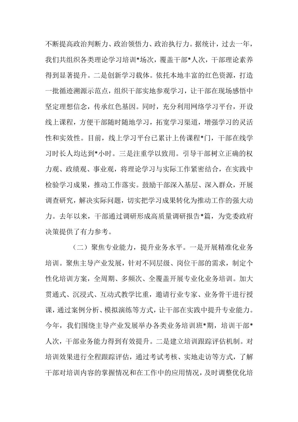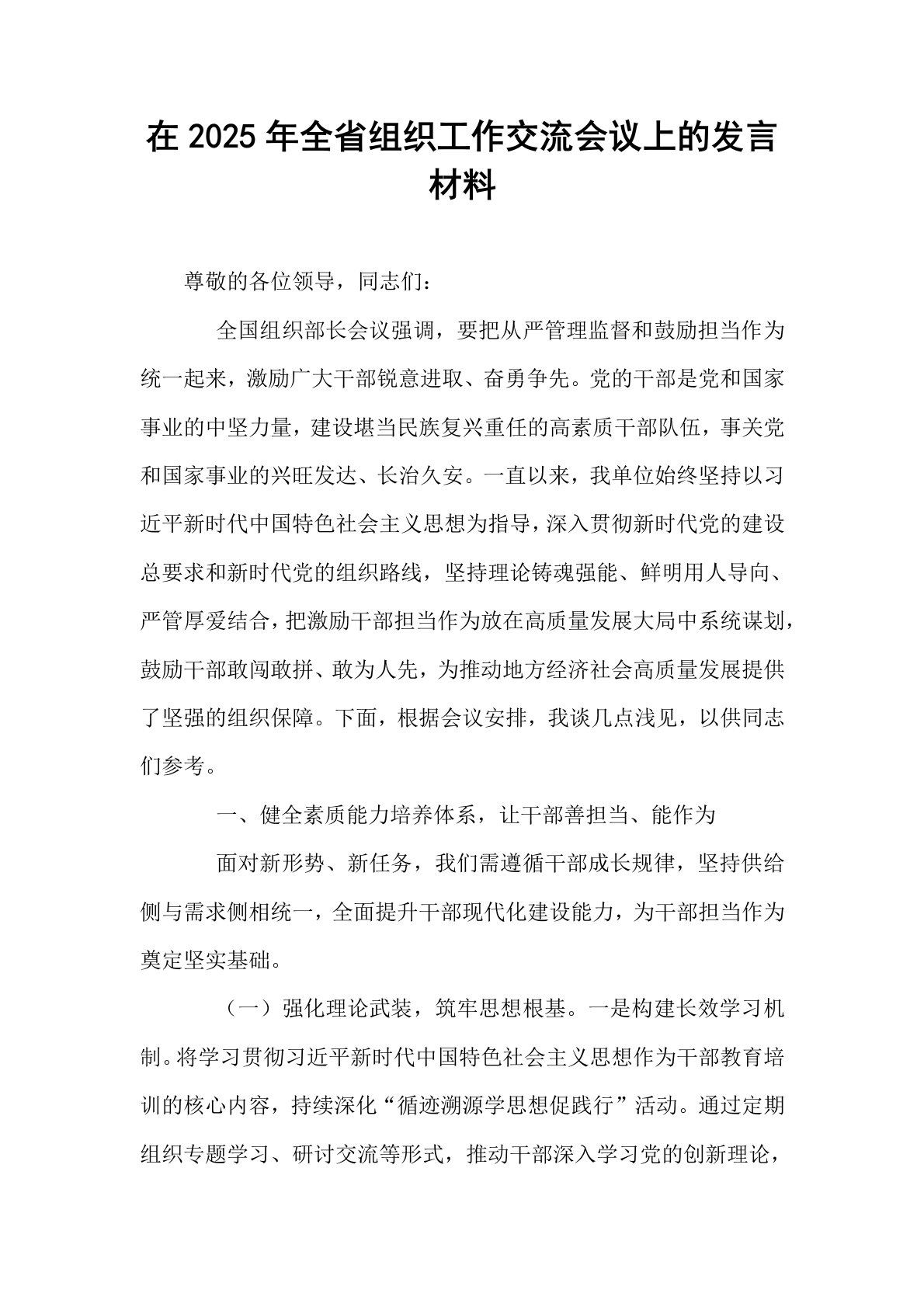 在2025年全省组织工作交流会议上的发言材料尊敬的各位领导,同志们:全国组织部长会议强调,要把从严管理监督和鼓励担当作为统一起来,激励广大干部锐意进取、奋勇争先。党的干部是党和国家事业的中坚力量,建设堪当民族复兴重任的高素质干部队伍,事关党和国家事业的兴旺发达、长治久安。一直以来,我单位始终坚持以习近平新时代中国特色社会主义思想为指导,深入贯彻新时代党的建设总要求和新时代党的组织路线,坚持理论铸魂强能、鲜明用人导向、严管厚爱结合,把激励干部担当作为放在高质量发展大局中系统谋划,鼓励干部敢闯敢拼、敢为人先,为推动地方经济社会高质量发展提供了坚强的组织保障。下面,根据会议安排,我谈几点浅见,以供同...