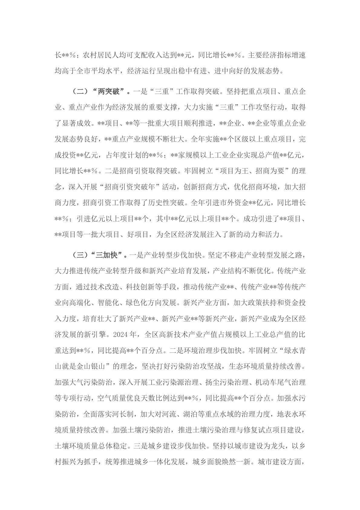 2025年区长在全区经济工作座谈会上的讲话2篇同志们:今天,我们召开全区经济工作座谈会,主要目的是总结回顾2024年全区经济工作,分析当前经济形势,安排部署2025年经济工作任务,动员全区上下进一步坚定信心、鼓足干劲,全力推动经济社会高质量发展。刚才,区发改局、统计局、工信局等部门分别汇报了2024年经济运行情况和2025年工作打算,各位副区长也结合分管工作作了很好的发言,我都赞同,请大家认真抓好落实。下面,我讲几点意见。一、充分肯定成绩,坚定加快发展的信心2024年,是极不平凡、极具挑战的一年。面对复杂严峻的宏观经济形势和艰巨繁重的改革发展稳定任务,全区上下坚持以习近平新时代中国特色社会主义...