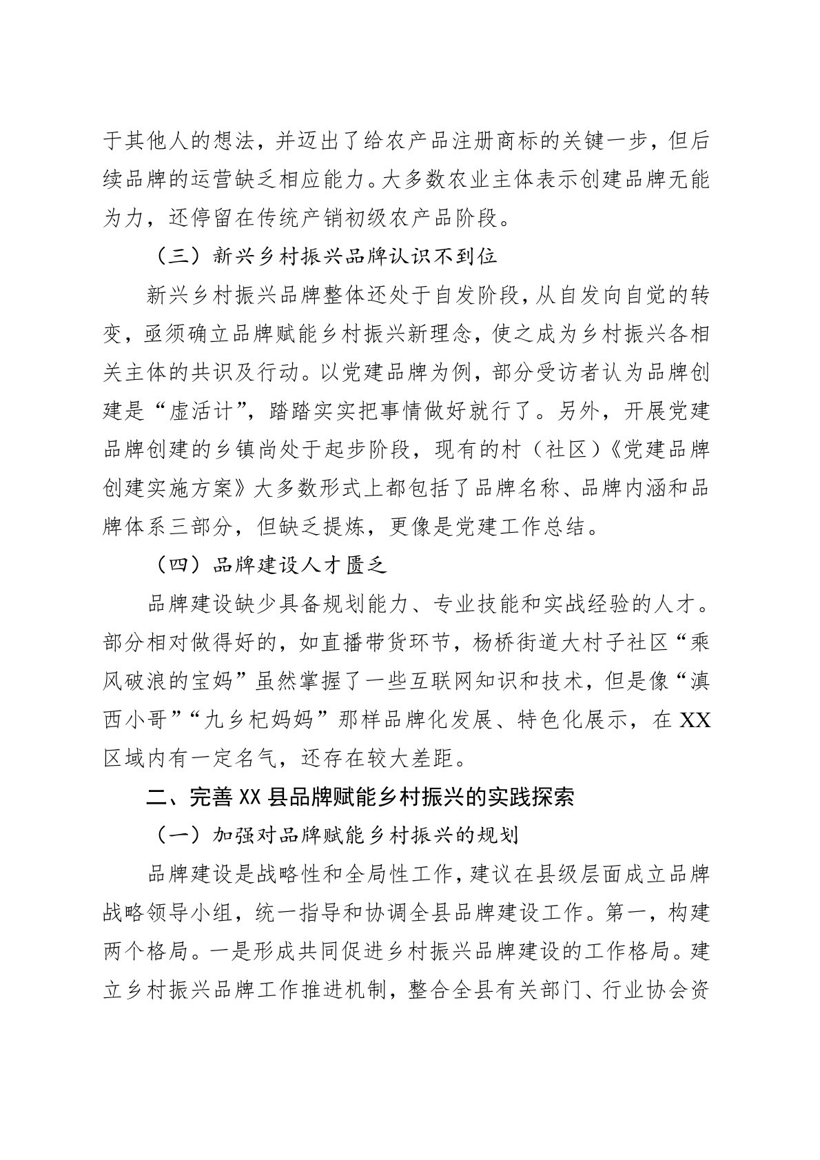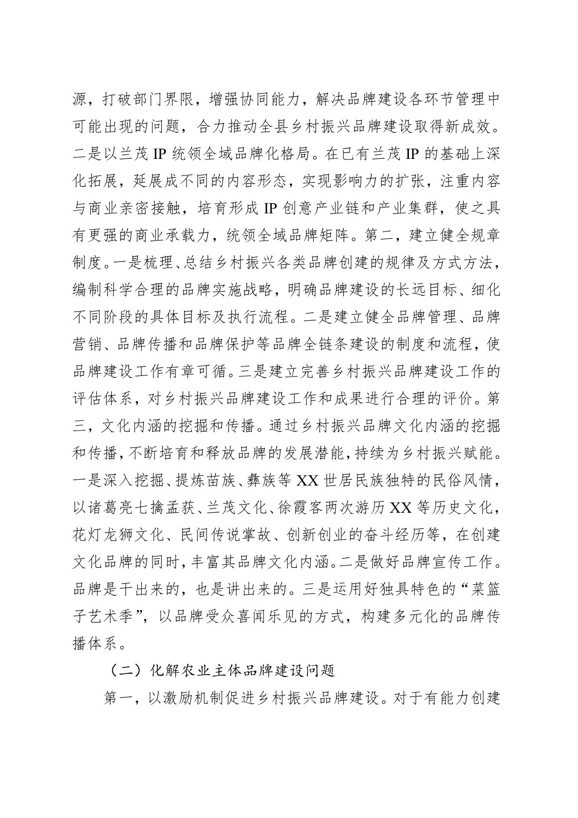在党和国家政策指引下,乡村振兴进入品牌时代。乡村振兴的总目标是“产业兴旺、生态宜居、乡风文明、治理有效、生活富裕”,每一项都离不开品牌的参与。传统农业品牌,如区域公用(公共)品牌、企业品牌、产品品牌等蓬勃发展,同时涌现出一批党建品牌、乡村治理品牌、乡村文旅品牌、生态品牌等,这些新兴品牌在乡村振兴实践中愈发显得重要。在乡村这个独特的经济载体上,通过上述各类品牌延伸至政治、经济、社会、文化和消费等领域,展示出乡村的独特竞争力,以此吸引人才流、资金流和科技流等,有效赋能乡村全面振兴。一、XX县品牌赋能乡村振兴存在的问题(一)品牌建设缺乏战略规划由于缺乏乡村振兴品牌建设整体规划设计,乡村振兴品牌整体呈...
