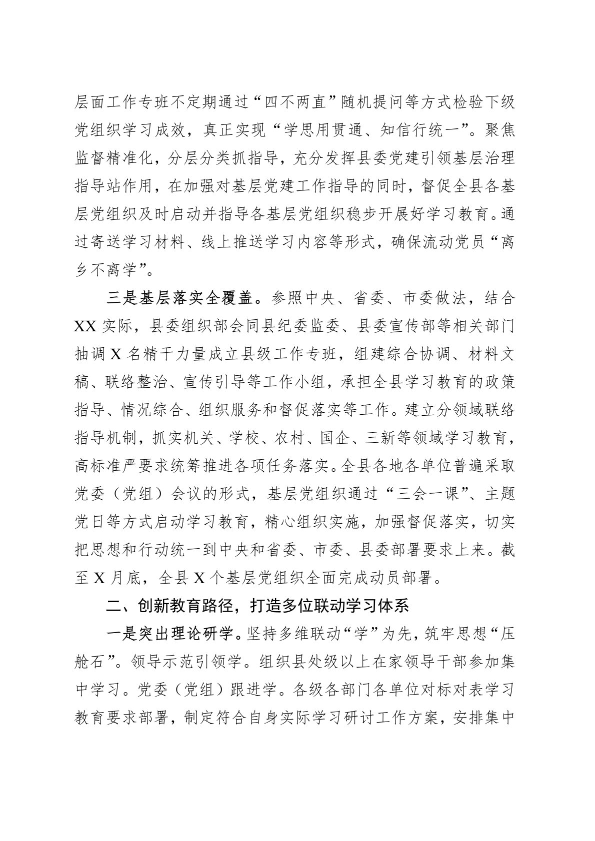 按照党中央统一部署,XX县委认真组织开展深入贯彻作风建设专题,教育引导党员干部深刻领悟“两个确立”的决定性意义,增强“四个意识”、坚定“四个自信”、做到“两个维护”,持续深化纠治“四风”,始终保持同人民群众的血肉联系,以优良作风、严明纪律奋进新征程、建功新时代。现将学习教育进展情况汇报如下:一、坚持政治引领,构建三位一体责任体系一是县委统筹把方向。X月X日,XX县委召开常委会会议,认真学习贯彻习近平总书记关于深入贯彻作风建设专题的重要讲话和重要指示精神,贯彻落实中央和省委、市委关于深入贯彻作风建设专题工作有关会议、文件精神,启动全县学习教育工作,制定出台县级层面《学习教育工作安排》,对标“学习...
