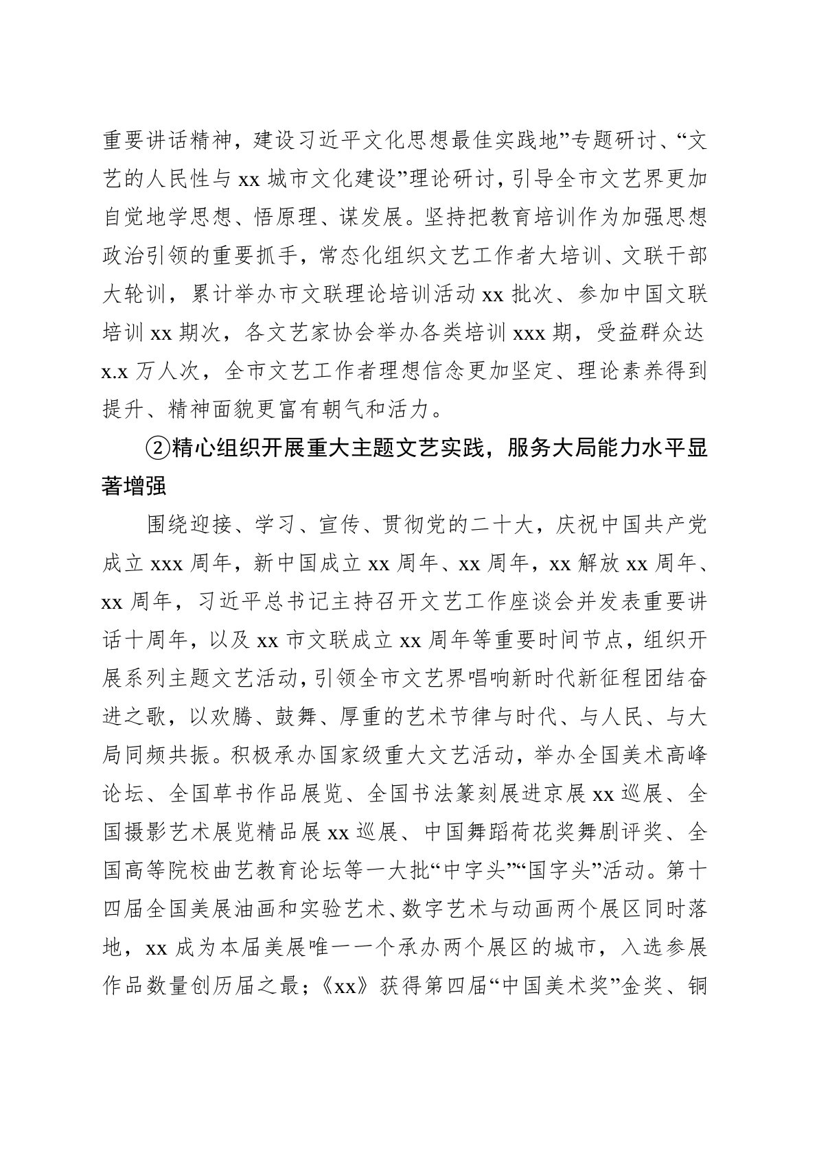 xx第八次文代会以来,在xx市委、xx市委宣传部的坚强领导和中国文联的指导支持下,xx市文联深入学习贯彻习近平新时代中国特色社会主义思想,全面贯彻落实习近平文化思想以及习近平总书记考察xx重要讲话精神,围绕中心、服务大局,认真履行团结引导、联络协调、服务管理、自律维权的基本职能,团结带领广大文艺工作者积极投身国际文化大都市建设的伟大实践,在政治引领、主题活动、文艺创作、文艺惠民等方面取得优异成绩,全市文艺界呈现出繁荣兴盛、风清气正的新局面新气象。①深入学习贯彻习近平新时代中国特色社会主义思想,思想政治引领坚强有力坚持把学习贯彻习近平新时代中国特色社会主义思想作为重要政治任务和重大政治责任来抓,...