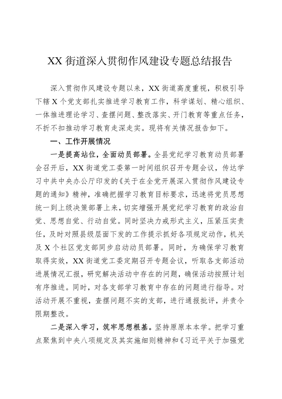 XX街道深入贯彻作风建设专题总结报告