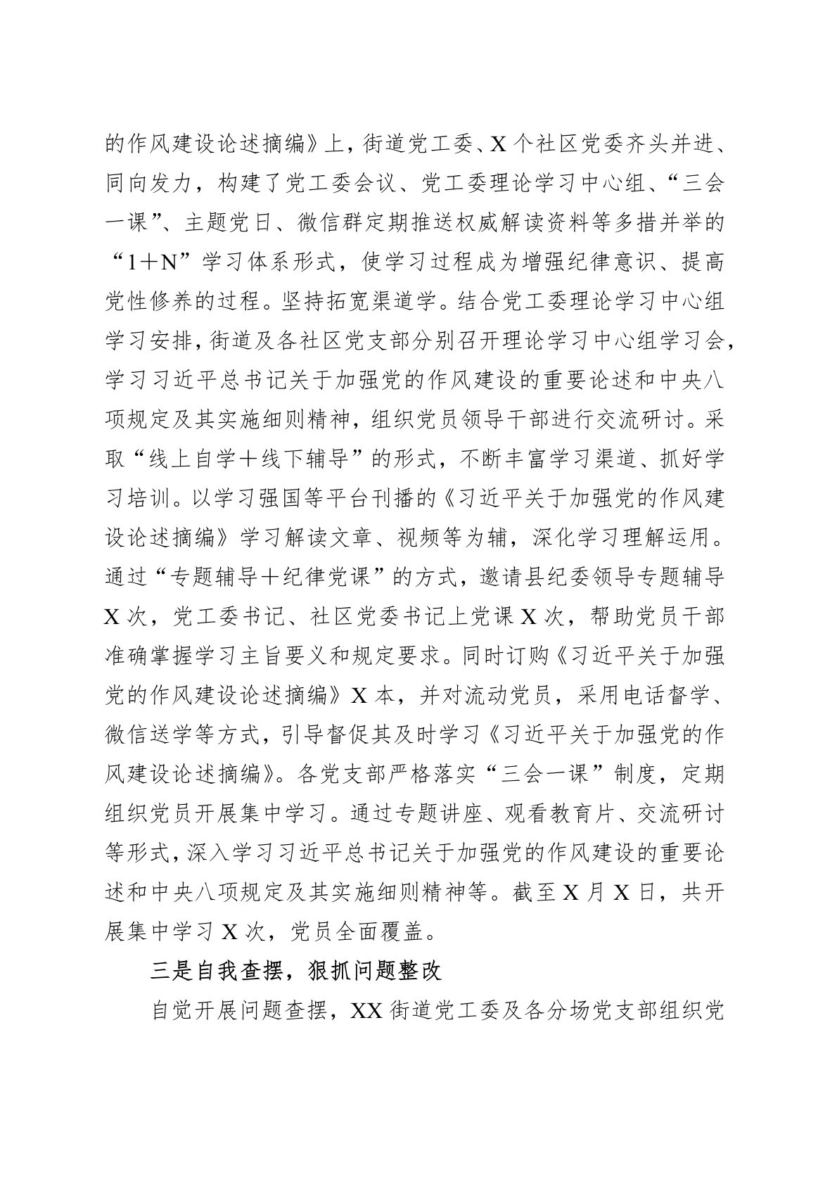 深入贯彻作风建设专题以来,XX街道高度重视,积极引导下辖X个党支部扎实推进学习教育工作,科学谋划、精心组织、一体推进理论学习、查摆问题、整改落实、开门教育等重点任务,不折不扣推动学习教育走深走实。现将有关情况报告如下。一、工作开展情况一是提高站位,全面动员部署。全县党纪学习教育动员部署会召开后,XX街道党工委第一时间组织召开专题会议,传达学习中共中央办公厅印发的《关于在全党开展深入贯彻作风建设专题的通知》精神,准确把握学习教育目标要求,迅速将党员思想统一到上级决策部署上来,切实增强开展党纪学习教育的政治自觉、思想自觉、行动自觉。同时坚决力戒形式主义,压紧压实责任,及时对照县级层面下发的工作提示...
