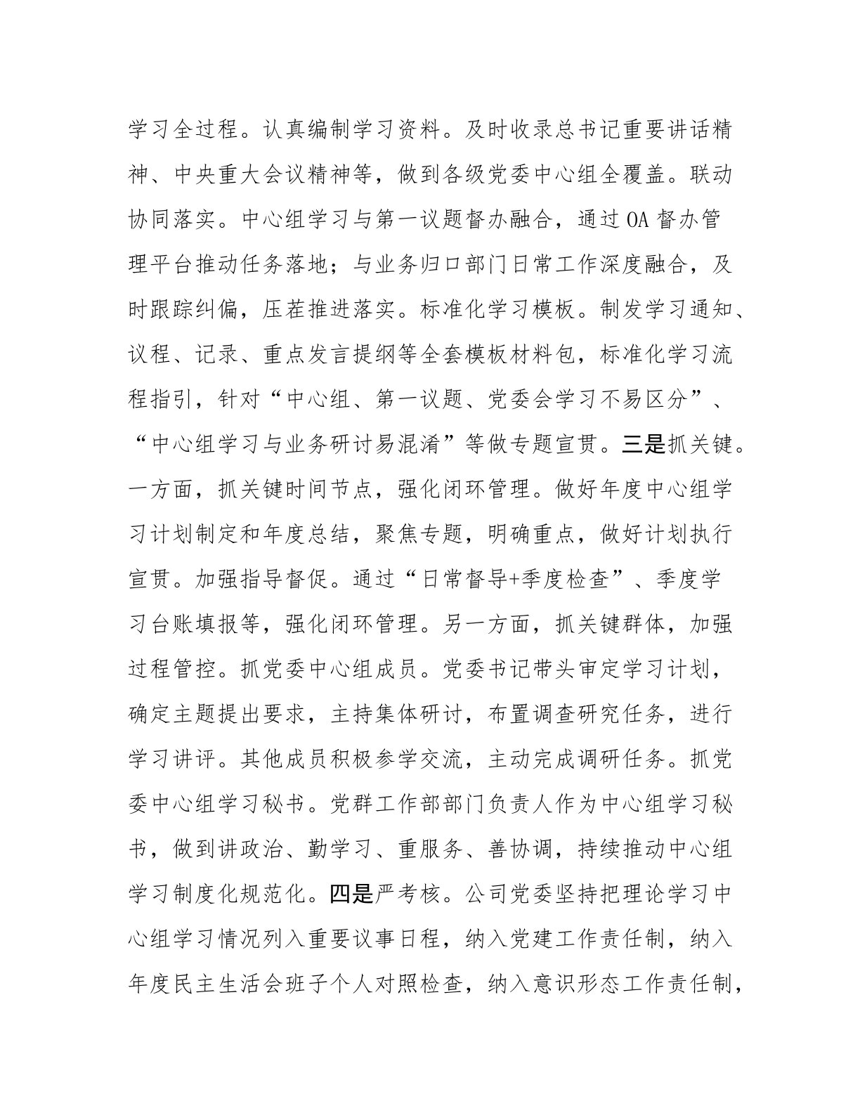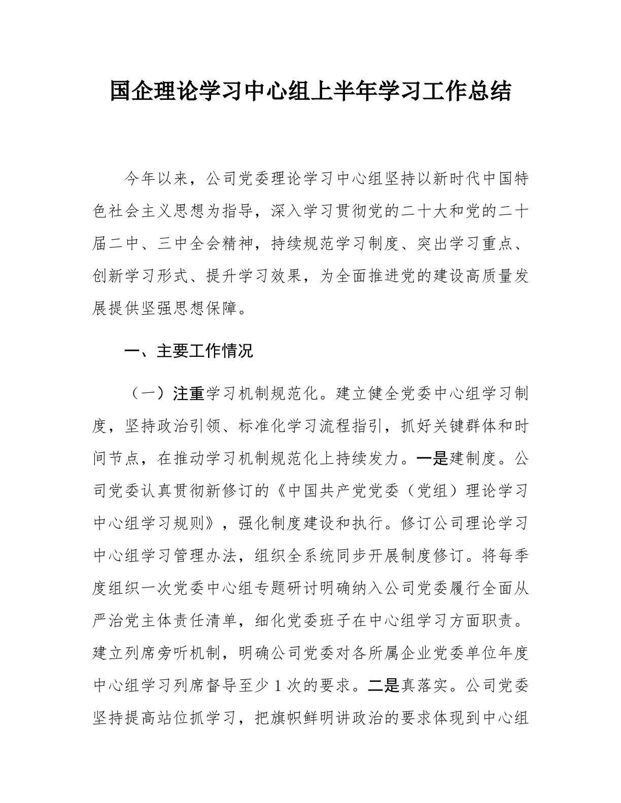 国企理论学习中心组上半年学习工作总结今年以来,公司党委理论学习中心组坚持以新时代中国特色社会主义思想为指导,深入学习贯彻党的二十大和党的二十届二中、三中全会精神,持续规范学习制度、突出学习重点、创新学习形式、提升学习效果,为全面推进党的建设高质量发展提供坚强思想保障。一、主要工作情况(一)注重学习机制规范化。建立健全党委中心组学习制度,坚持政治引领、标准化学习流程指引,抓好关键群体和时间节点,在推动学习机制规范化上持续发力。一是建制度。公司党委认真贯彻新修订的《中国共产党党委(党组)理论学习中心组学习规则》,强化制度建设和执行。修订公司理论学习中心组学习管理办法,组织全系统同步开展制度修订。将...