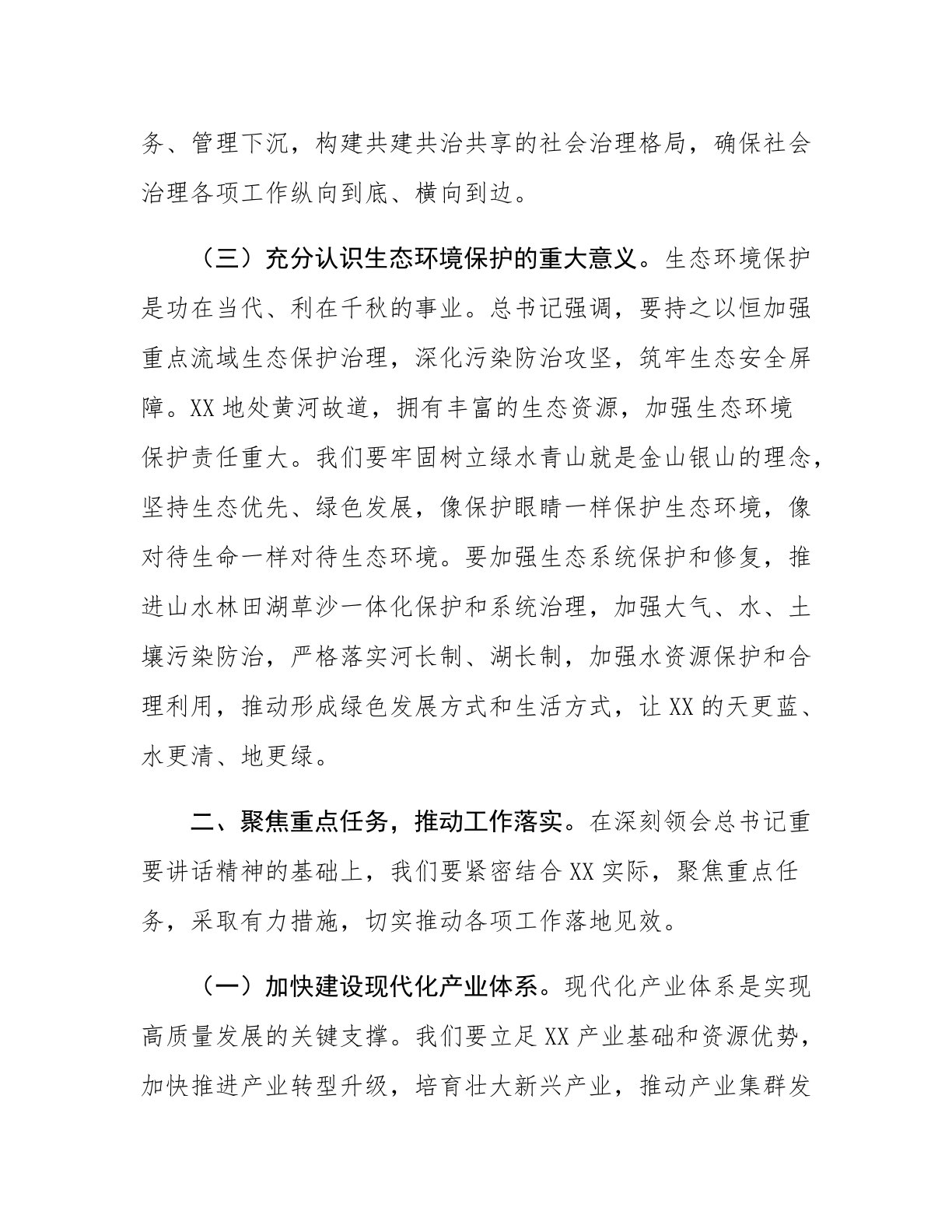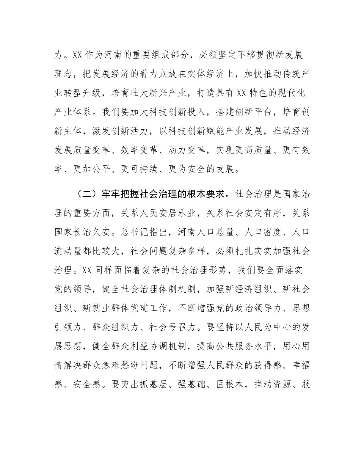 在市委理论学习中心组第五次专题学习研讨交流会上的发言提纲同志们:总书记近期在河南考察时的重要讲话,高瞻远瞩、思想深邃,为我们指明了前进方向、提供了根本遵循。今天,我们召开此次市委理论学习中心组专题学习研讨会,就是要深入学习领会总书记讲话精神,紧密结合XX实际,切实把思想和行动统一到党中央决策部署上来,以更高的政治站位、更强的责任担当,推动XX各项事业高质量发展。一、深化思想认识,坚定政治方向。总书记的重要讲话,为我们在新时代新征程上推动高质量发展、加强社会治理、保护生态环境、繁荣文化事业提供了行动指南。我们要深刻领会其精神实质,切实增强贯彻落实的思想自觉和行动自觉。(一)深刻领悟高质量发展的核...